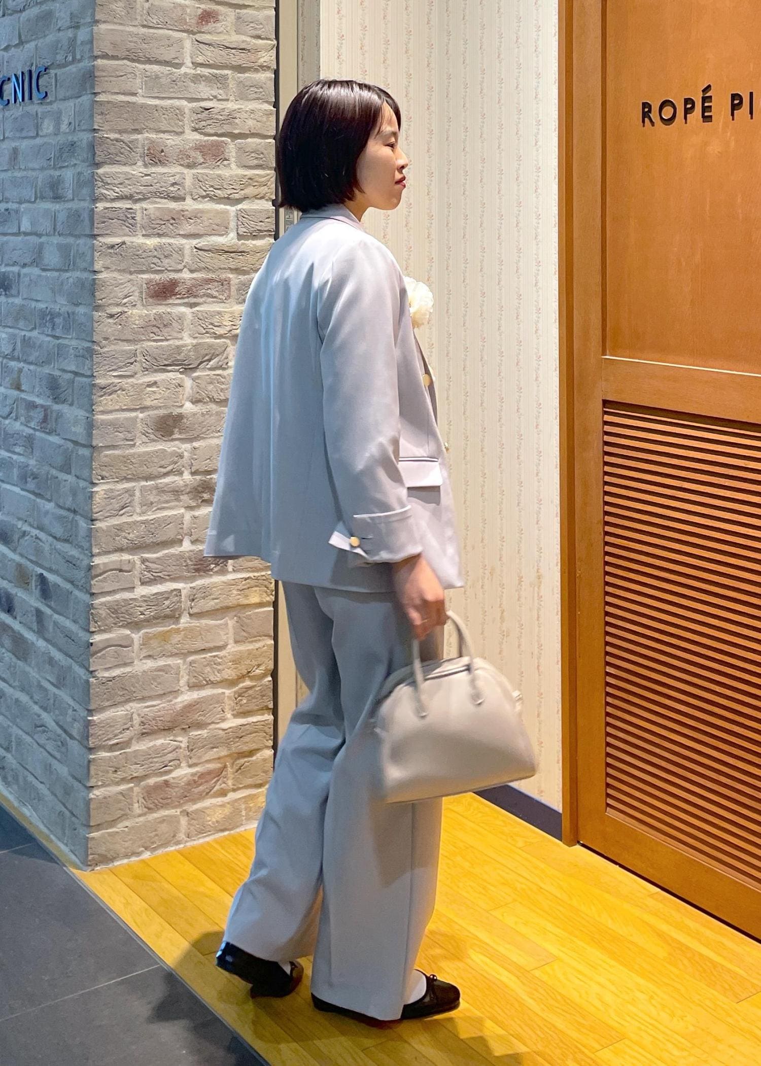 ジャケットのインナーには裾がペプラムのデザインのアイテムを合わせて、ジャケットを脱いでもお洒落見えが叶うスタイルに◎