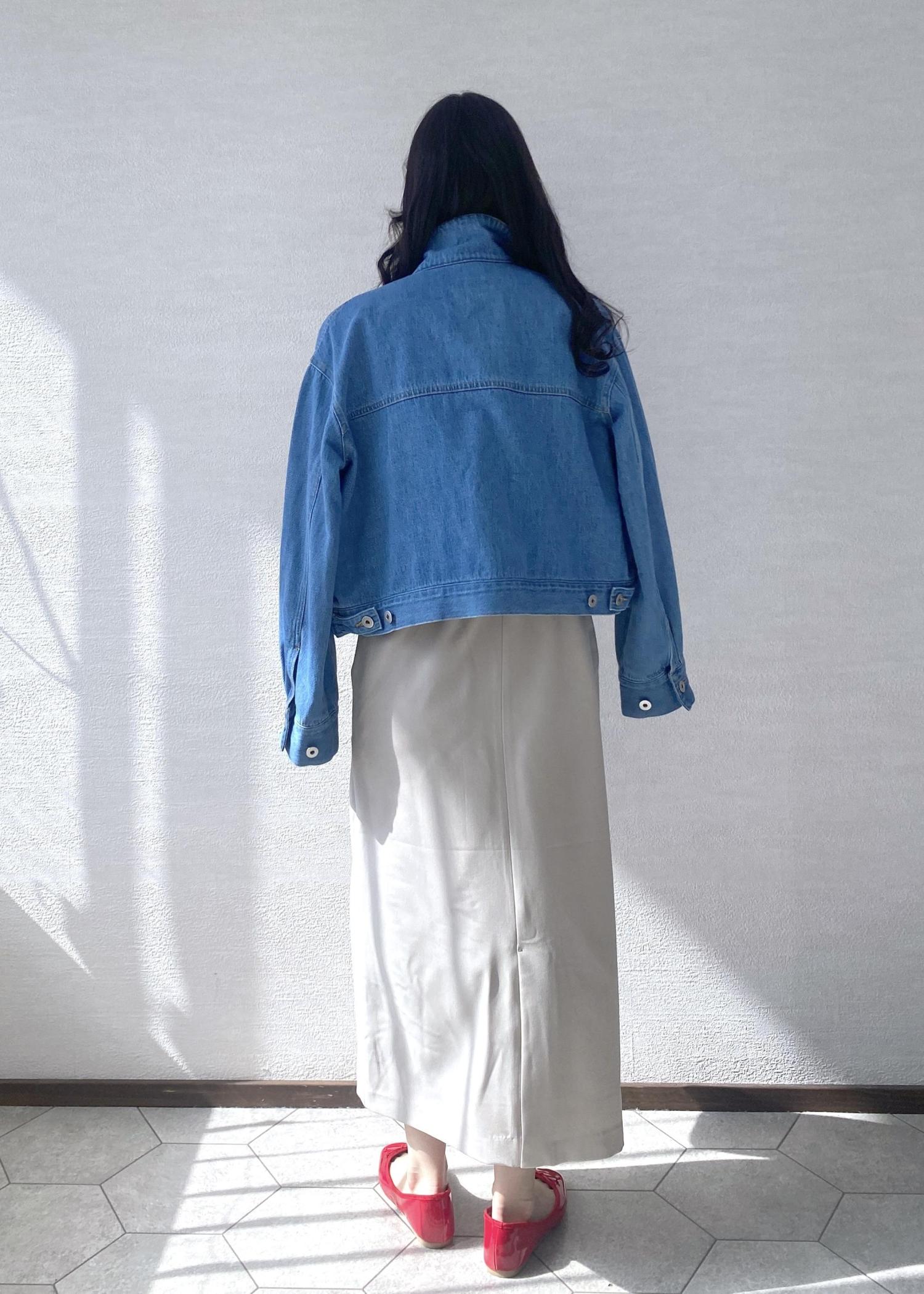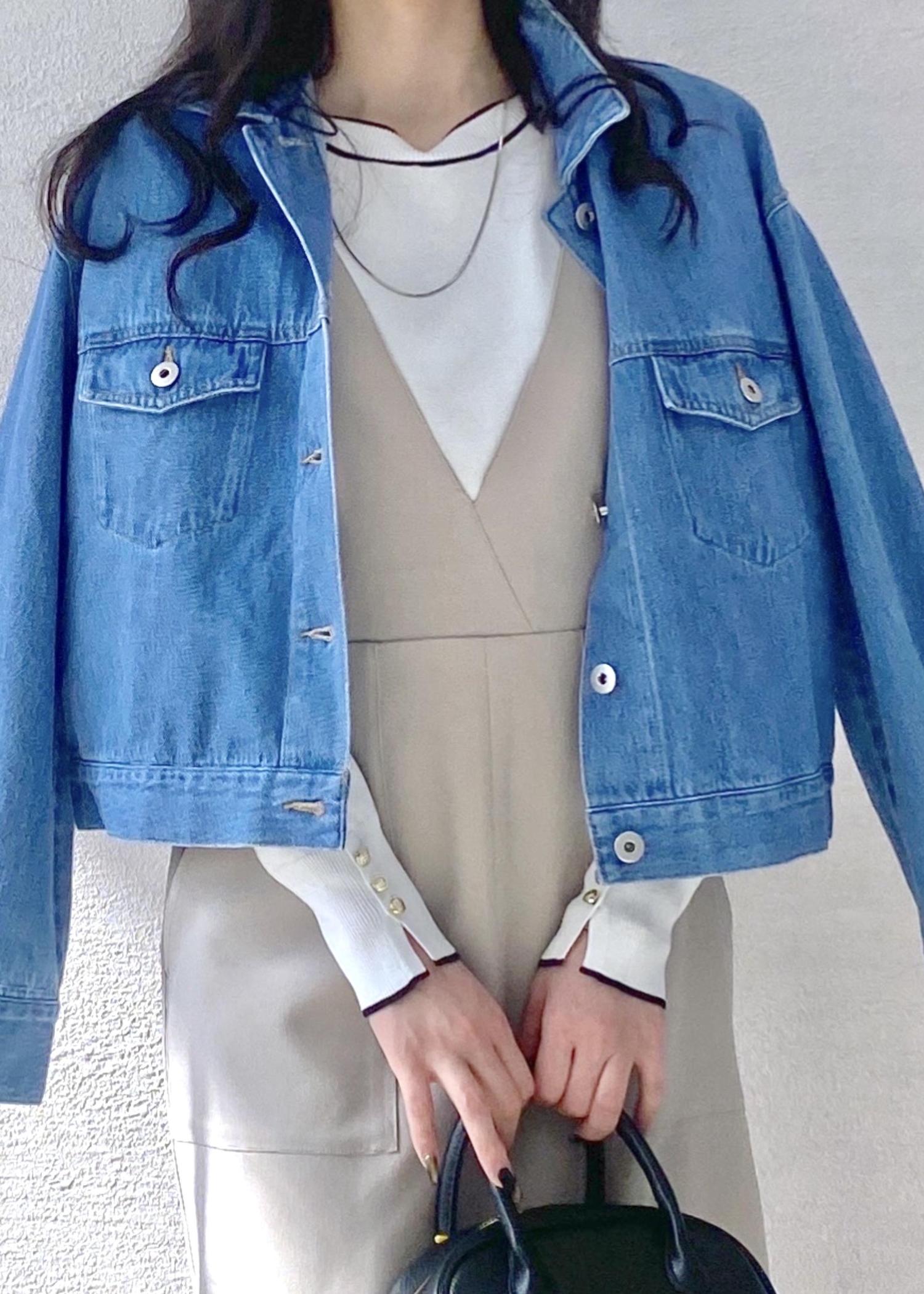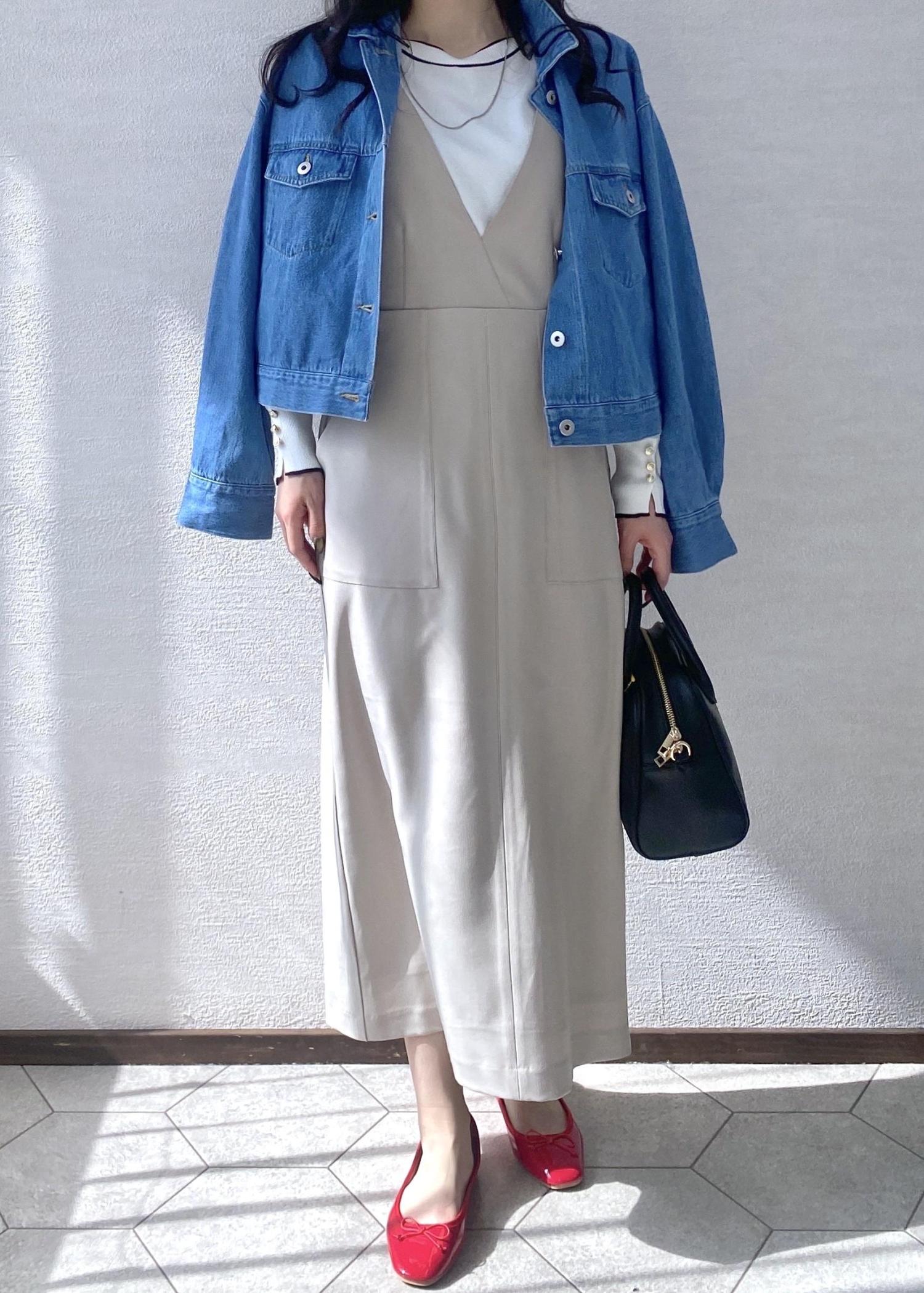 デザインポケットがポイントのジャンパースカートにデニムジャケットを合わせたお出かけにぴったりなコーディネートです。