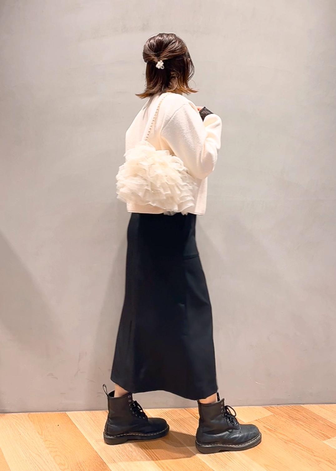 フリルがたくさん重なっているバッグを合わせれば、キレイめだけど、可愛さがプラスされて柔らかい印象に!