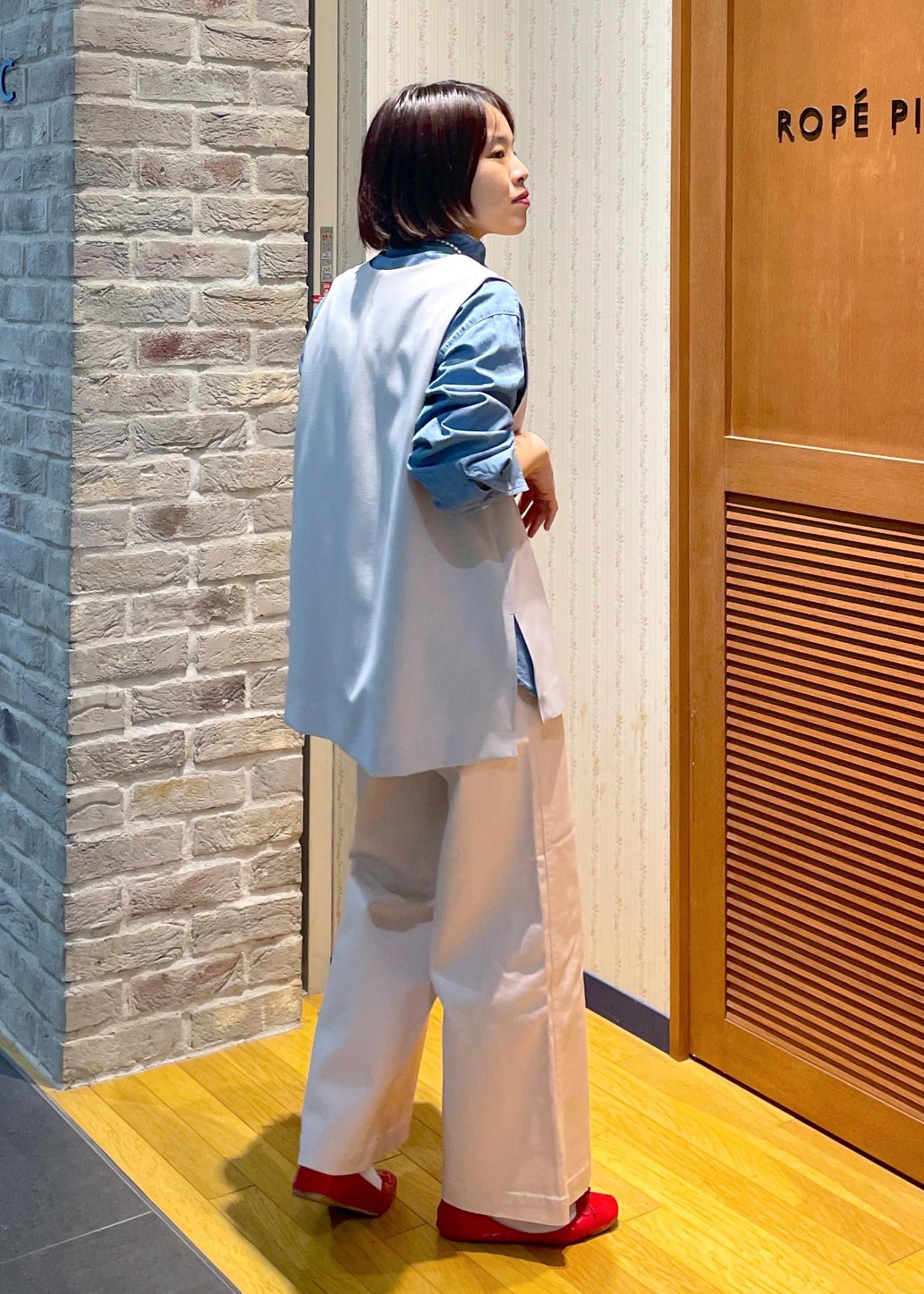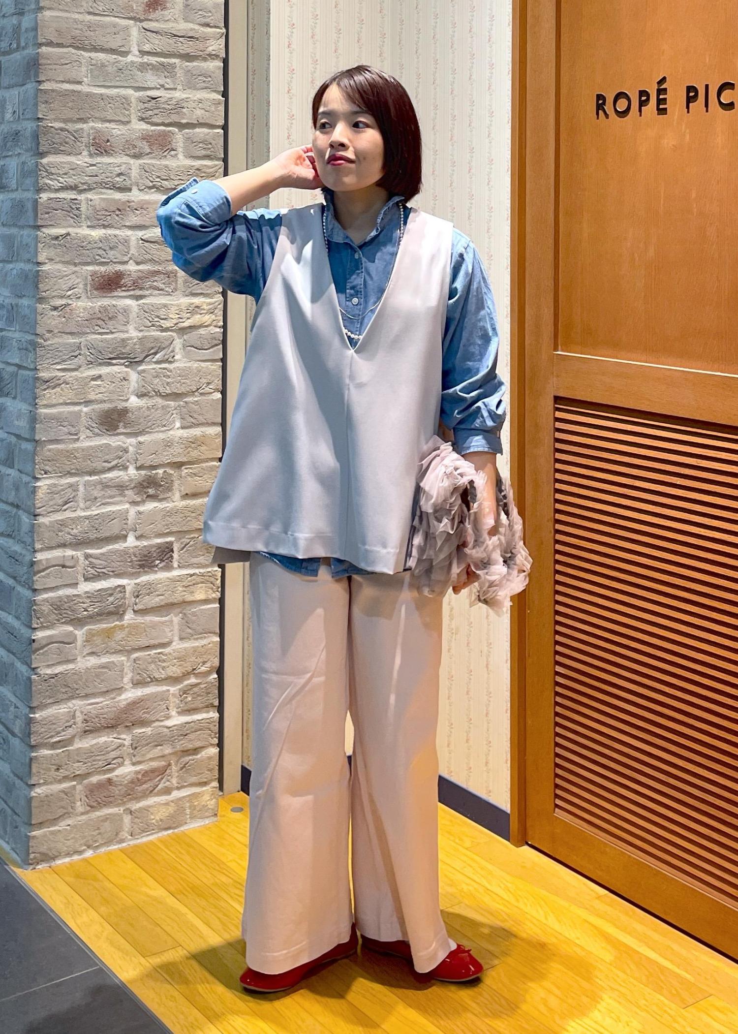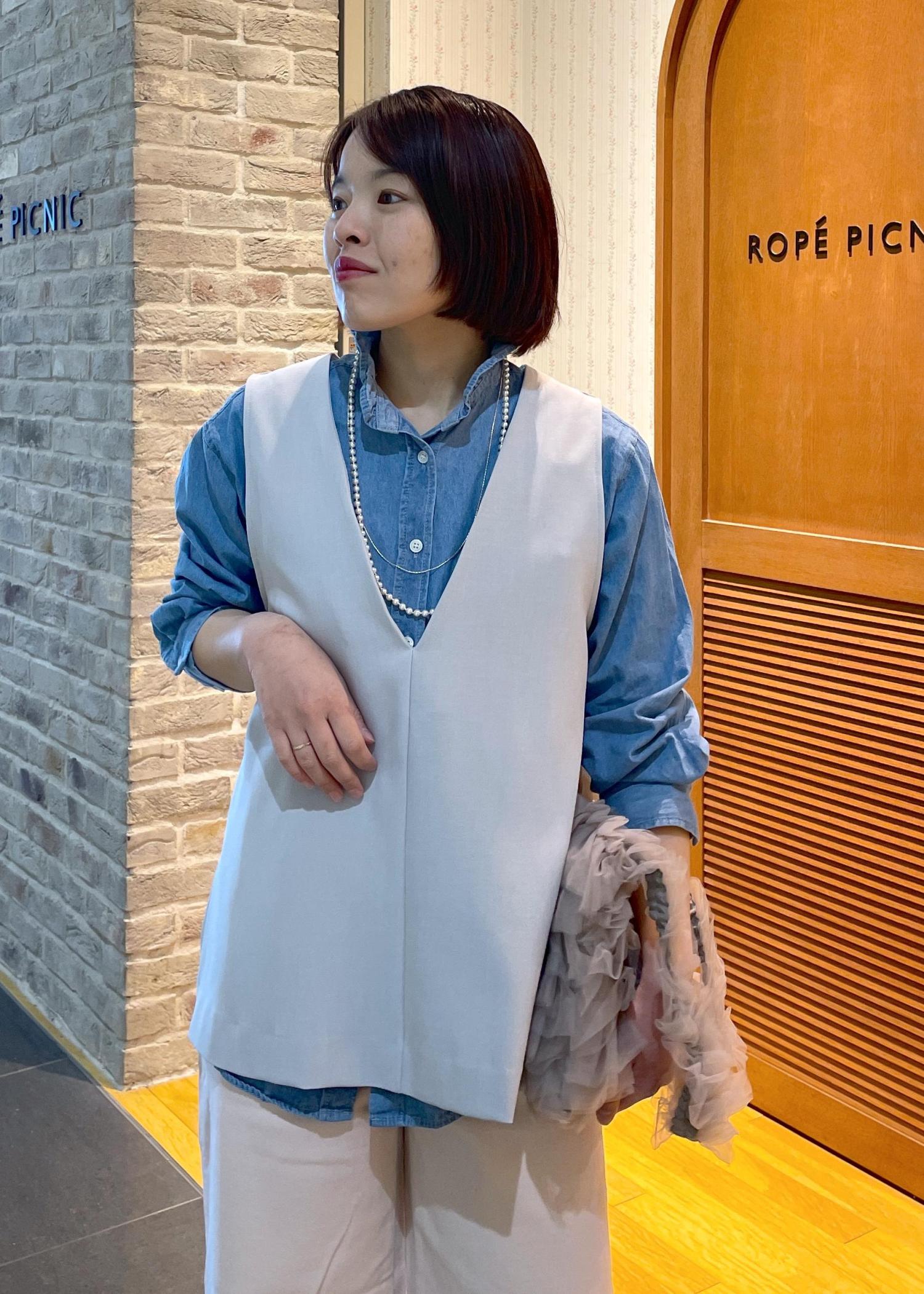 フリルカラーが女性らしいデニムシャツにライトグレーベストを合わせた、品良く決まるデニムコーデです!
