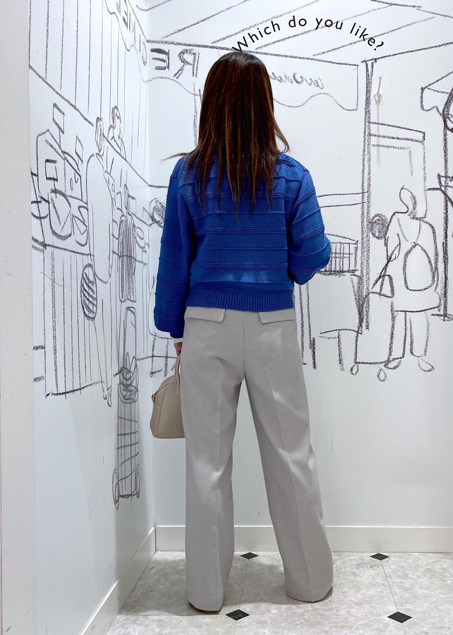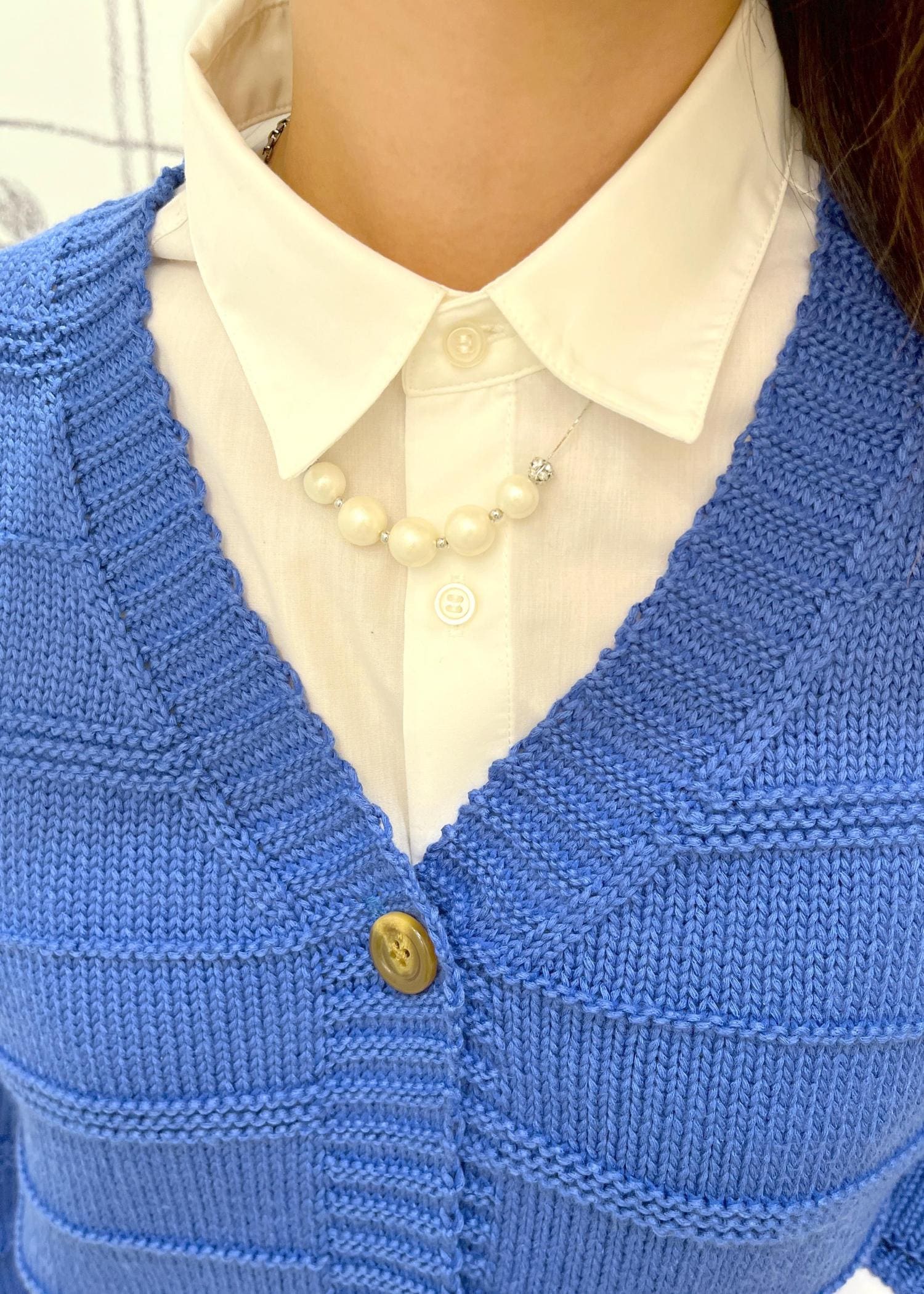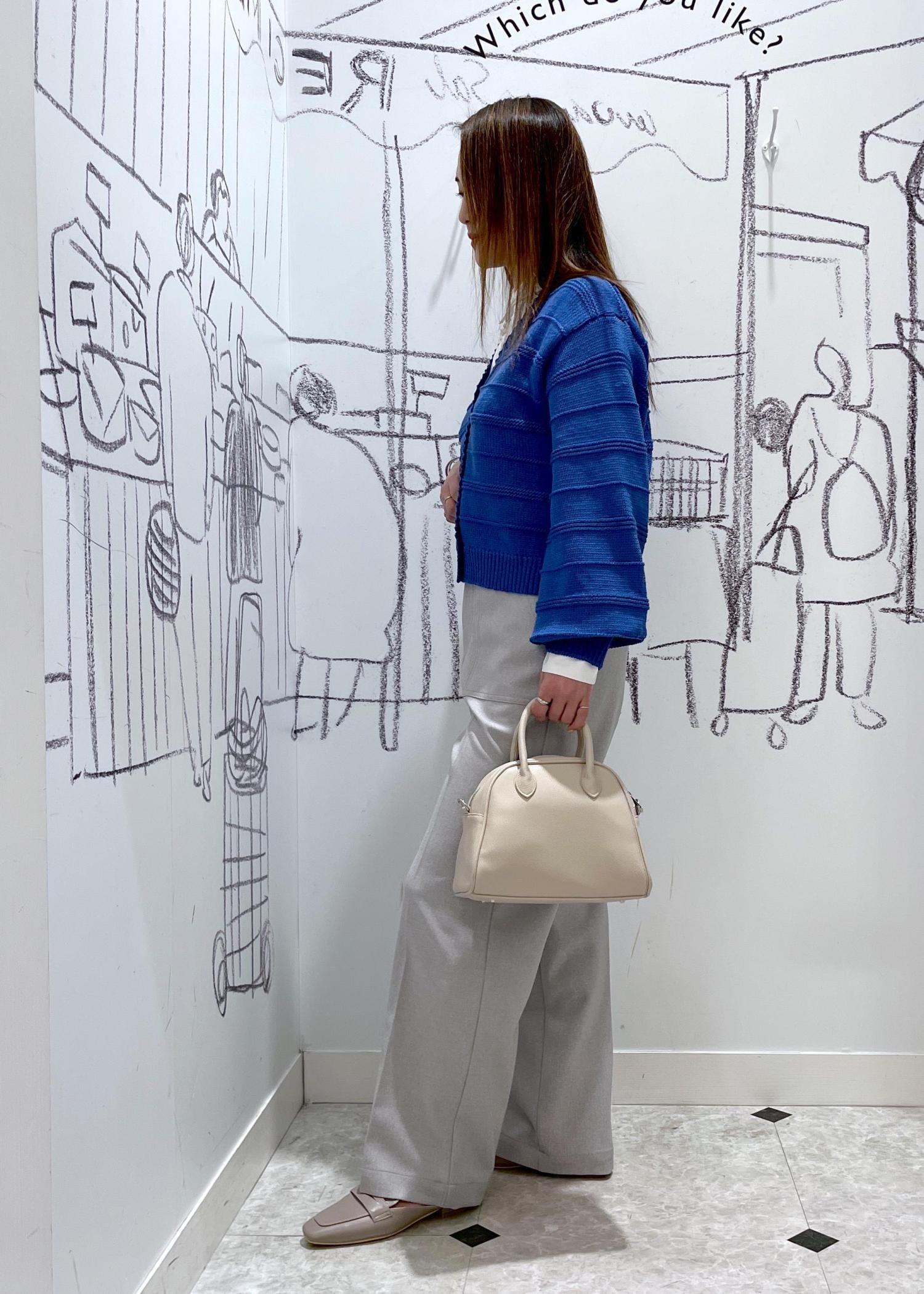 パキッとしたキレイな色のブルーのカーディガンのコーデです。白シャツと合わせて爽やかな印象に。ボトムは、グレーのベーカーパンツと合わせて、オフィスカジュアルにも使えるスタイリングにしました。オンオフ両方使えるスタイリングです。