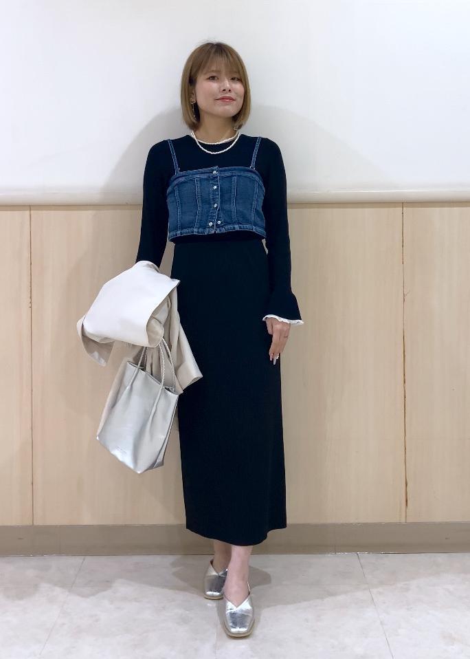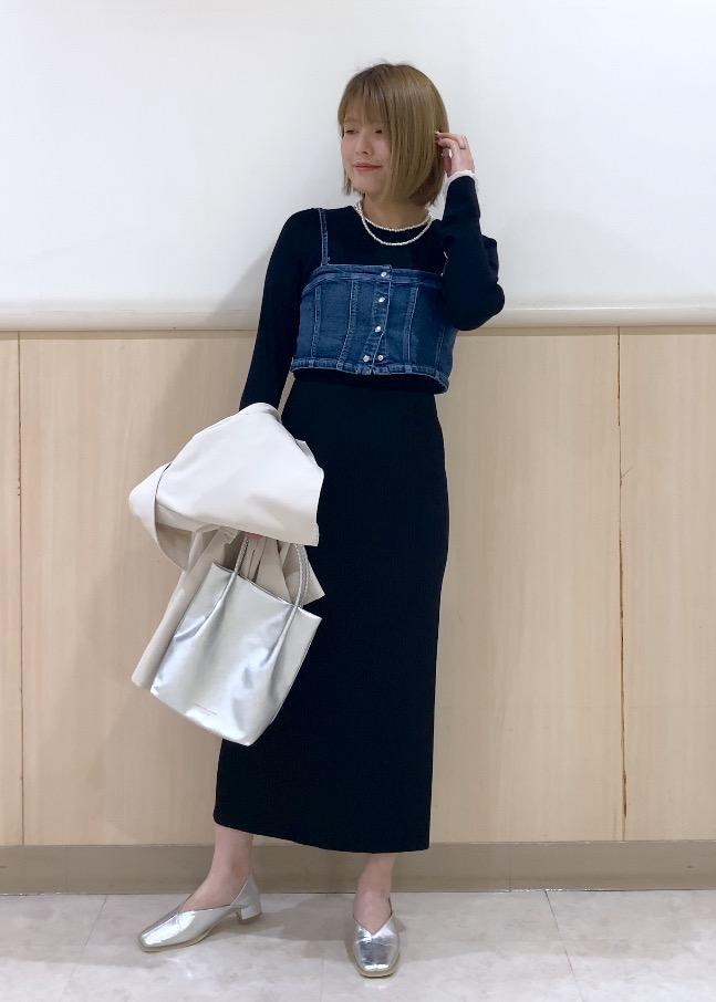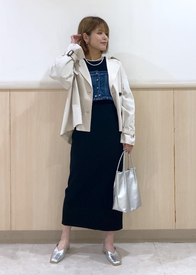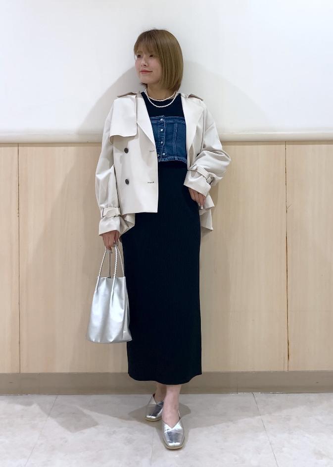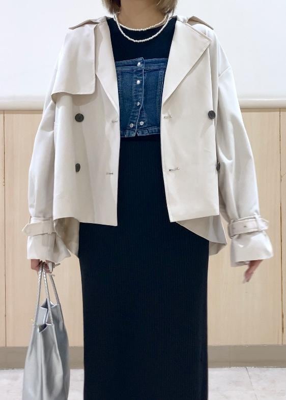 細身のトップス×タイトスカートを黒で統一して、デニムビスチェを合わせた大人っぽいコーディネートに春らしさのあるショート丈トレンチコートをあわせた綺麗めカジュアルコーディネートです!