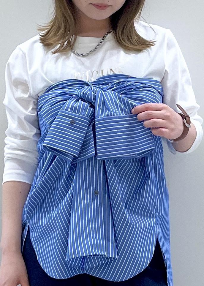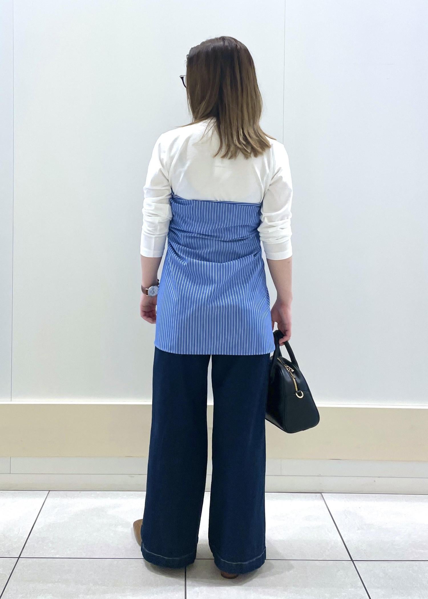 ストライプシャツを使って、ビスチェ風にアレンジしてコーデを組みました。