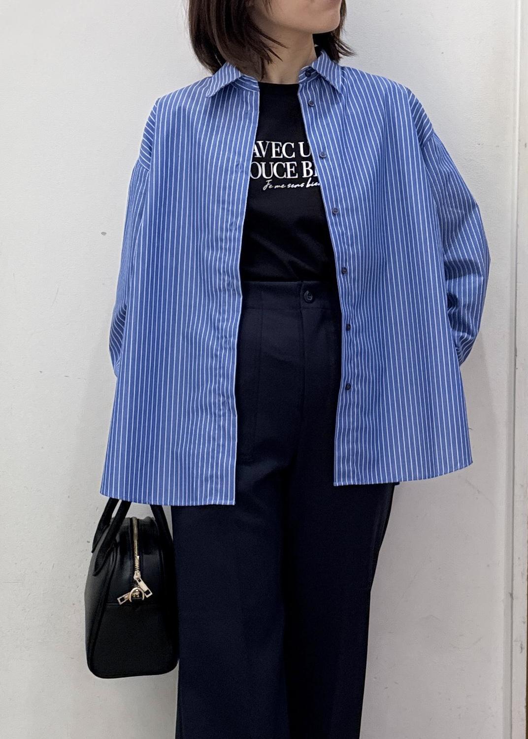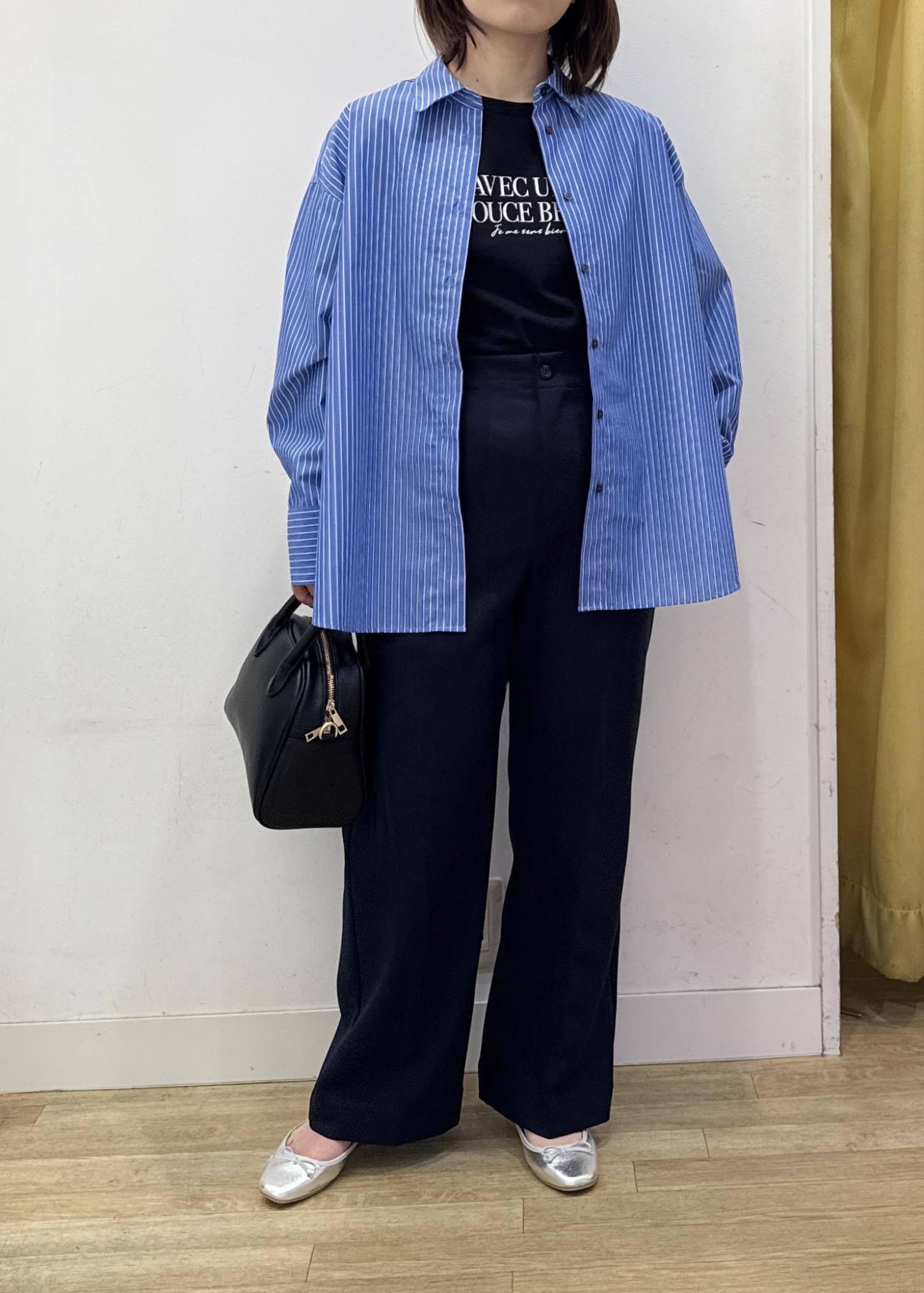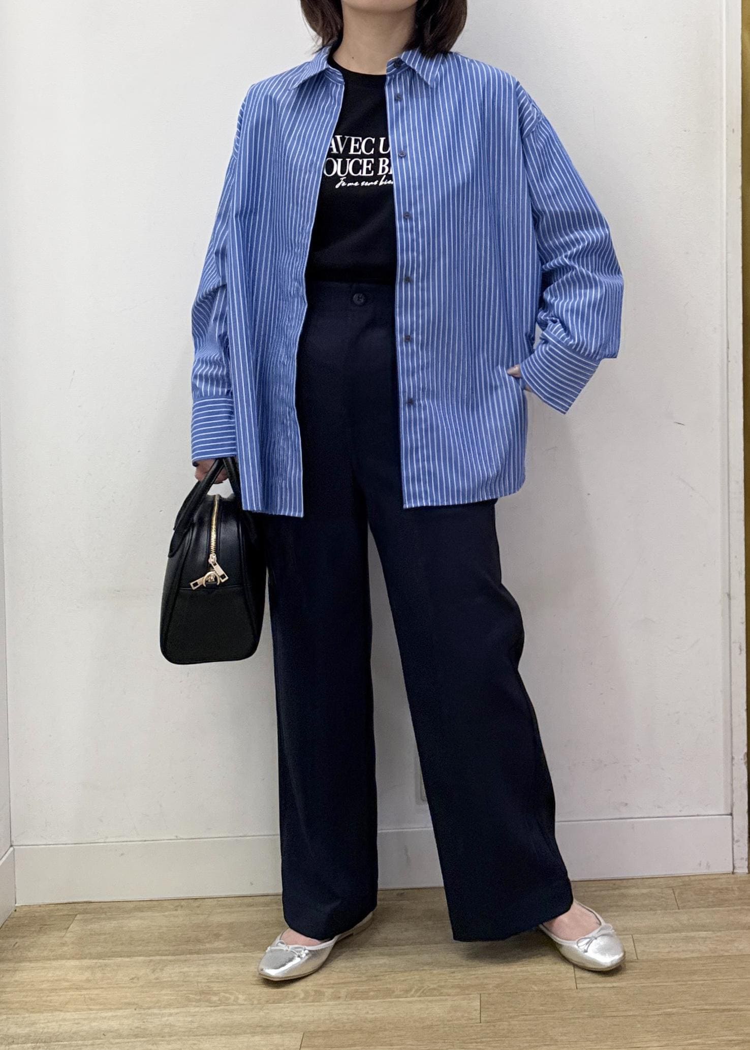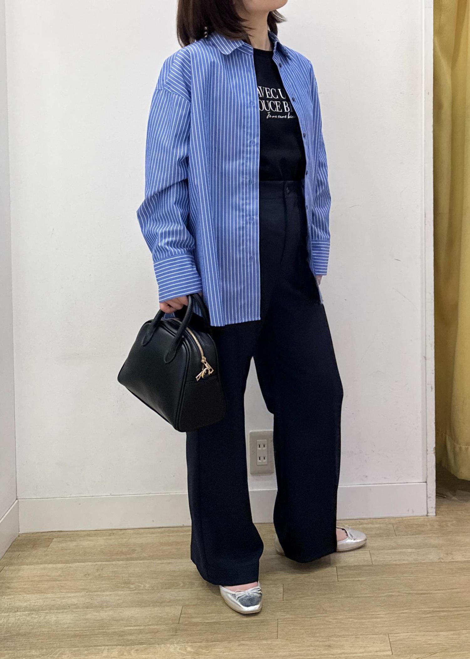 ロングTシャツとベイカーパンツはシックにまとめて、ブルーのストライプシャツを羽織れば爽やかさをプラス!