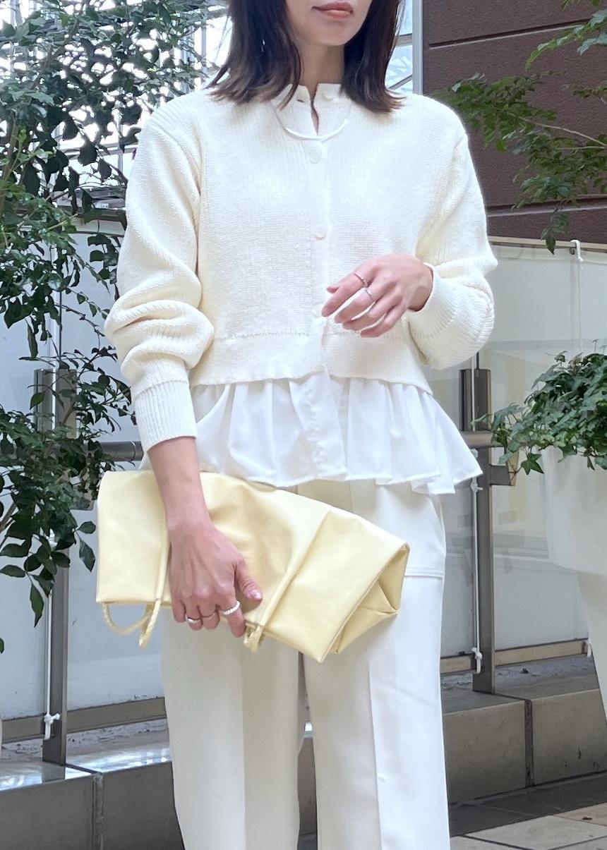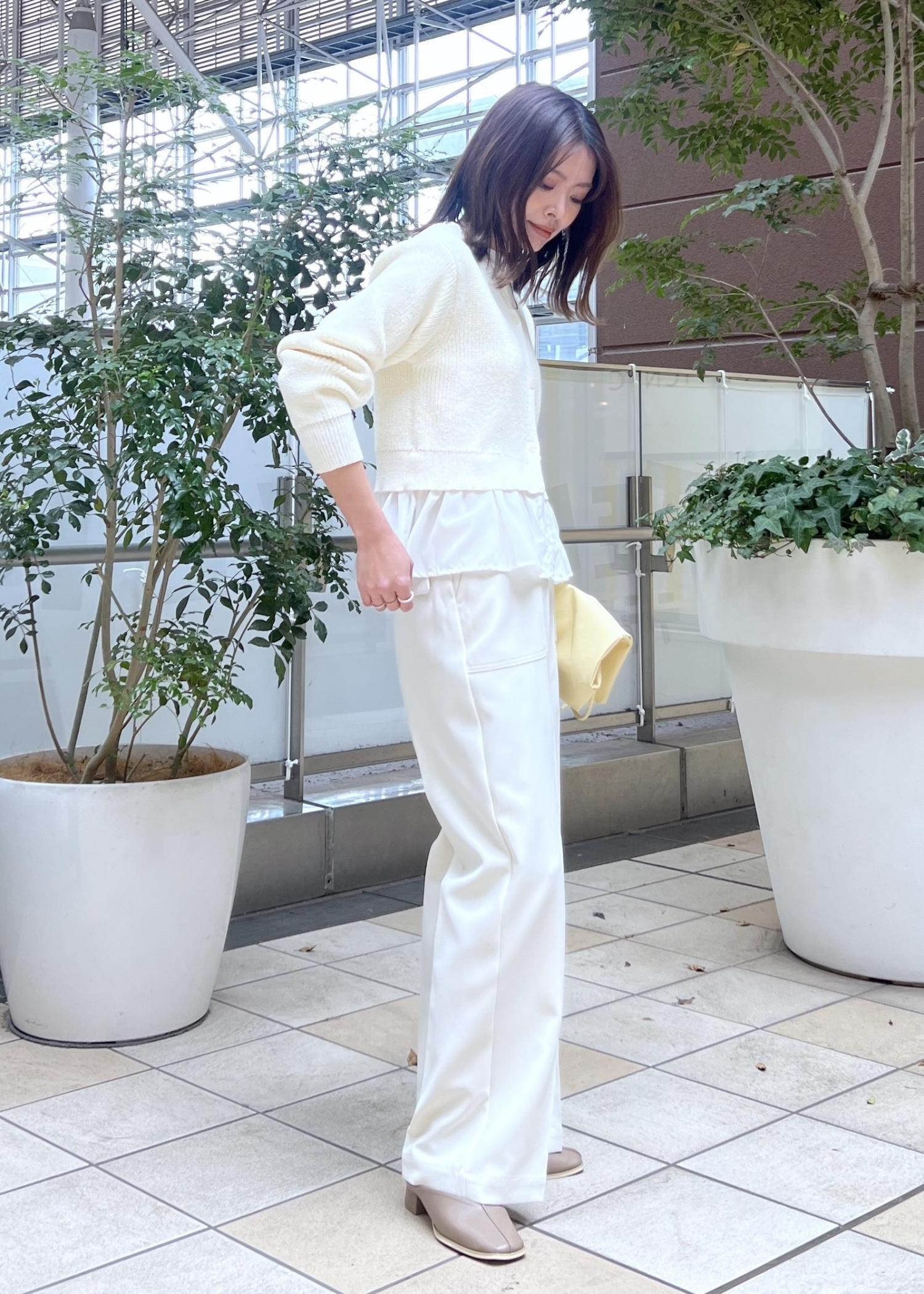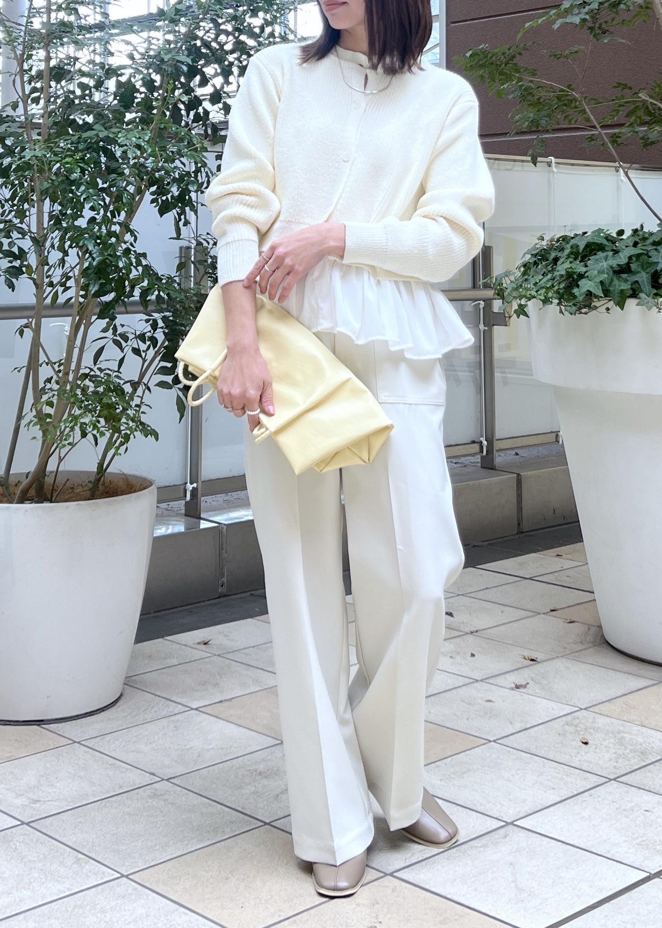 ホワイトのニットカーディガンは、前を閉めてトップスとして合わせて春のホワイトコーデに。