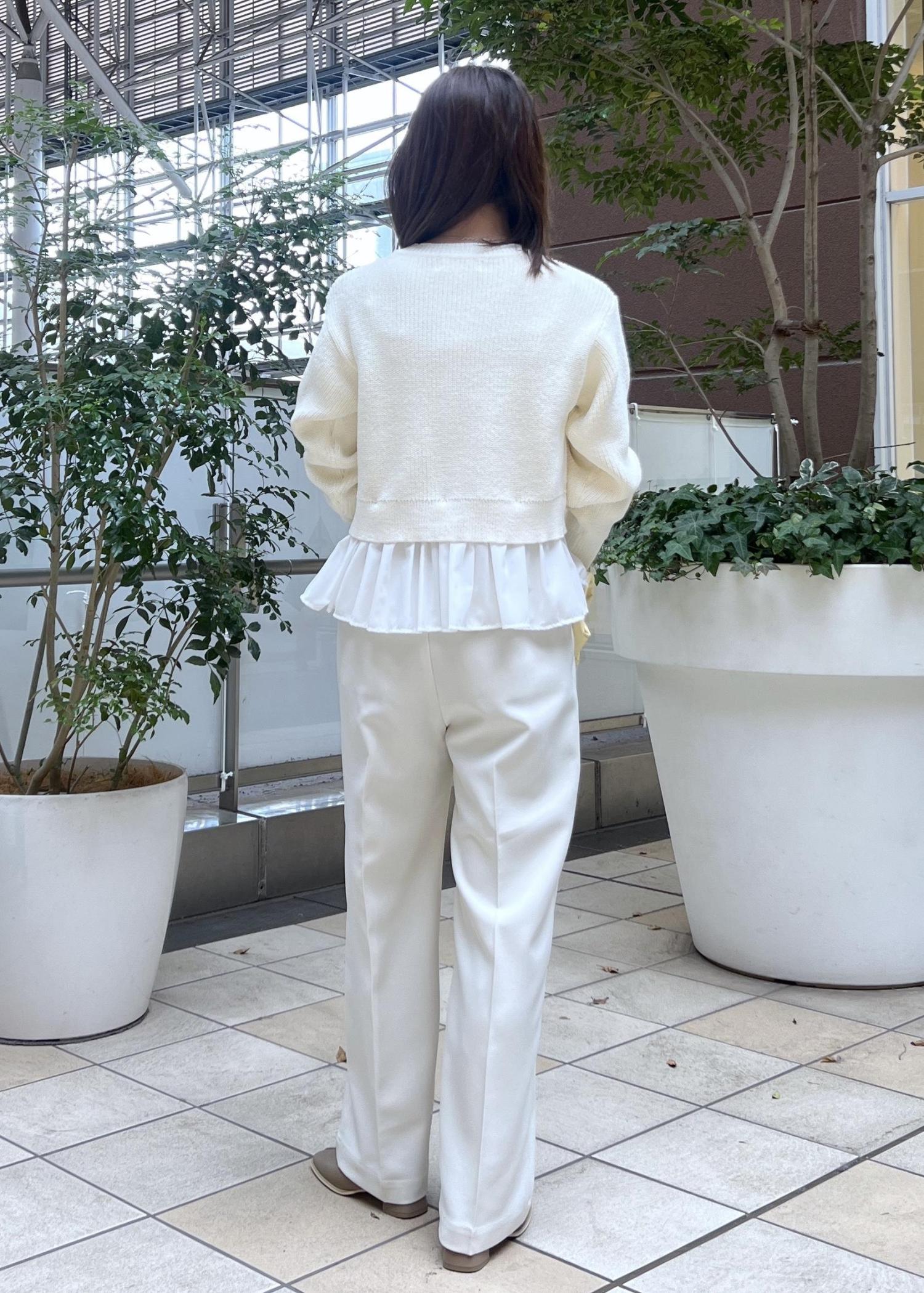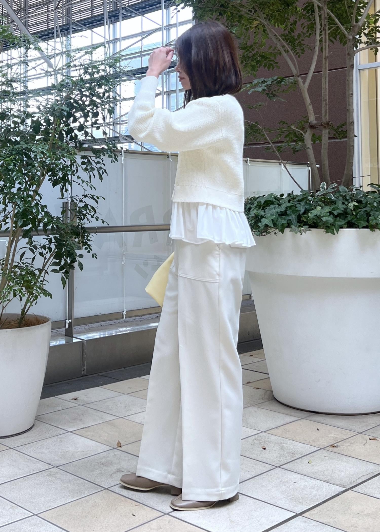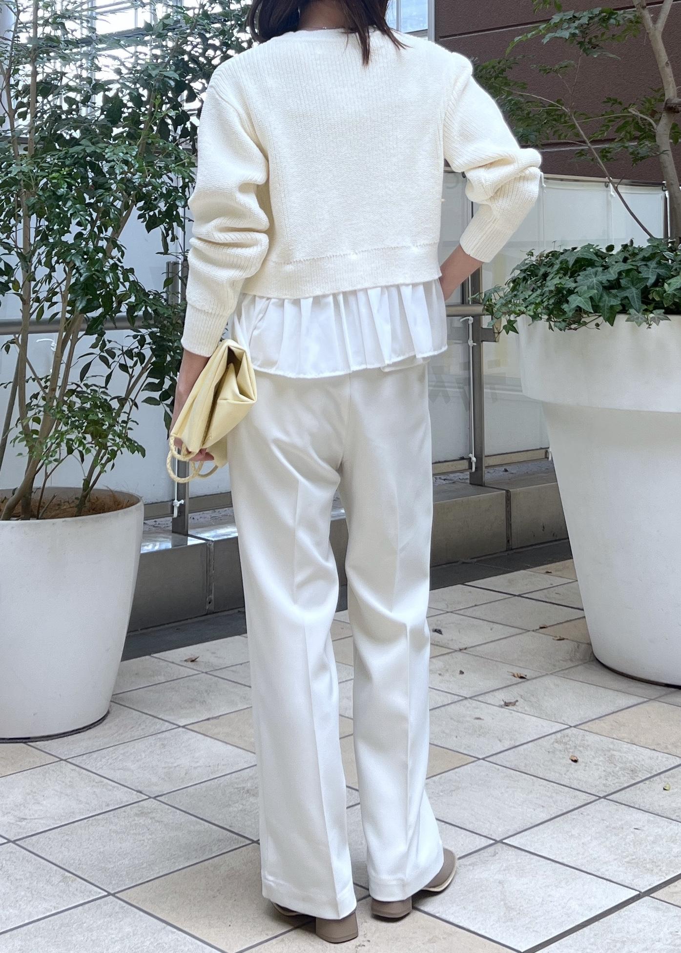 ホワイトのニットカーディガンは、前を閉めてトップスとして合わせて春のホワイトコーデに。