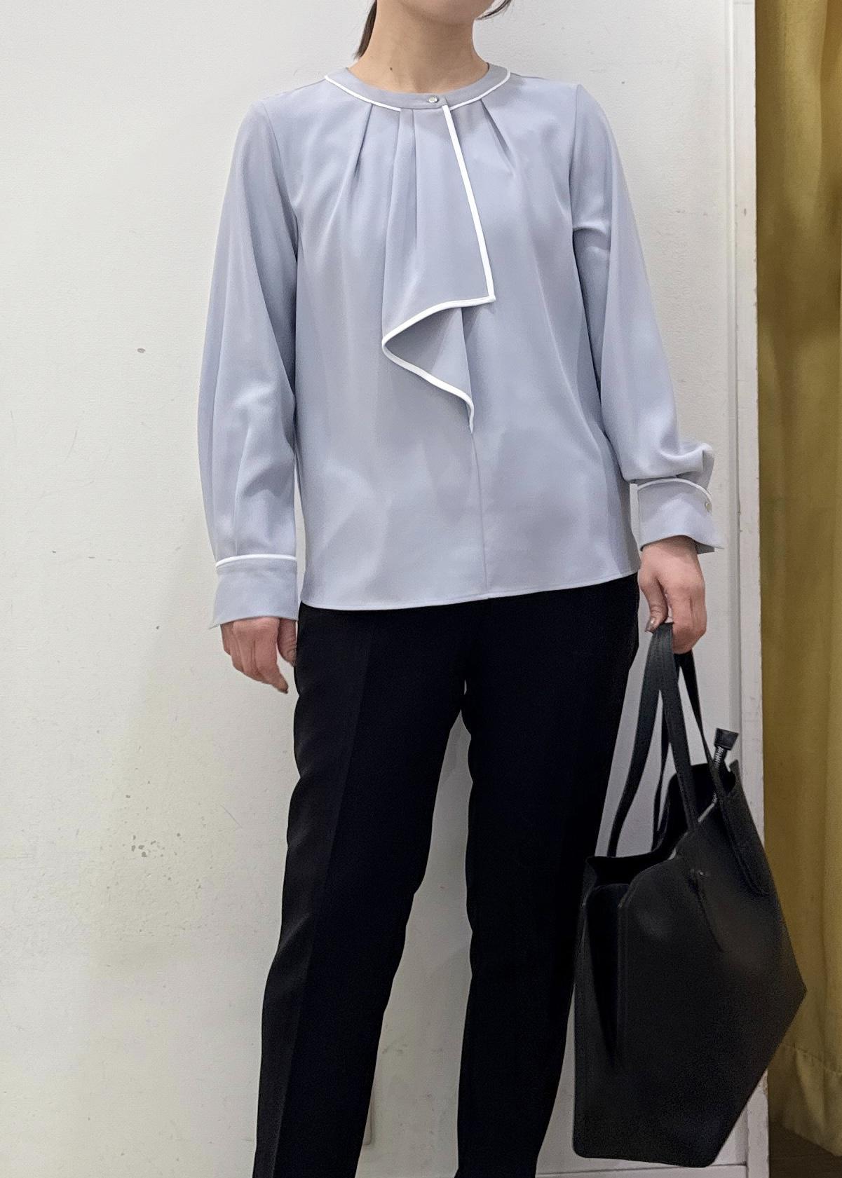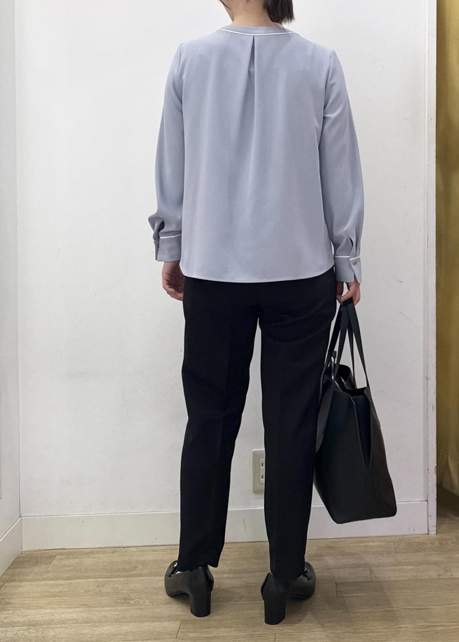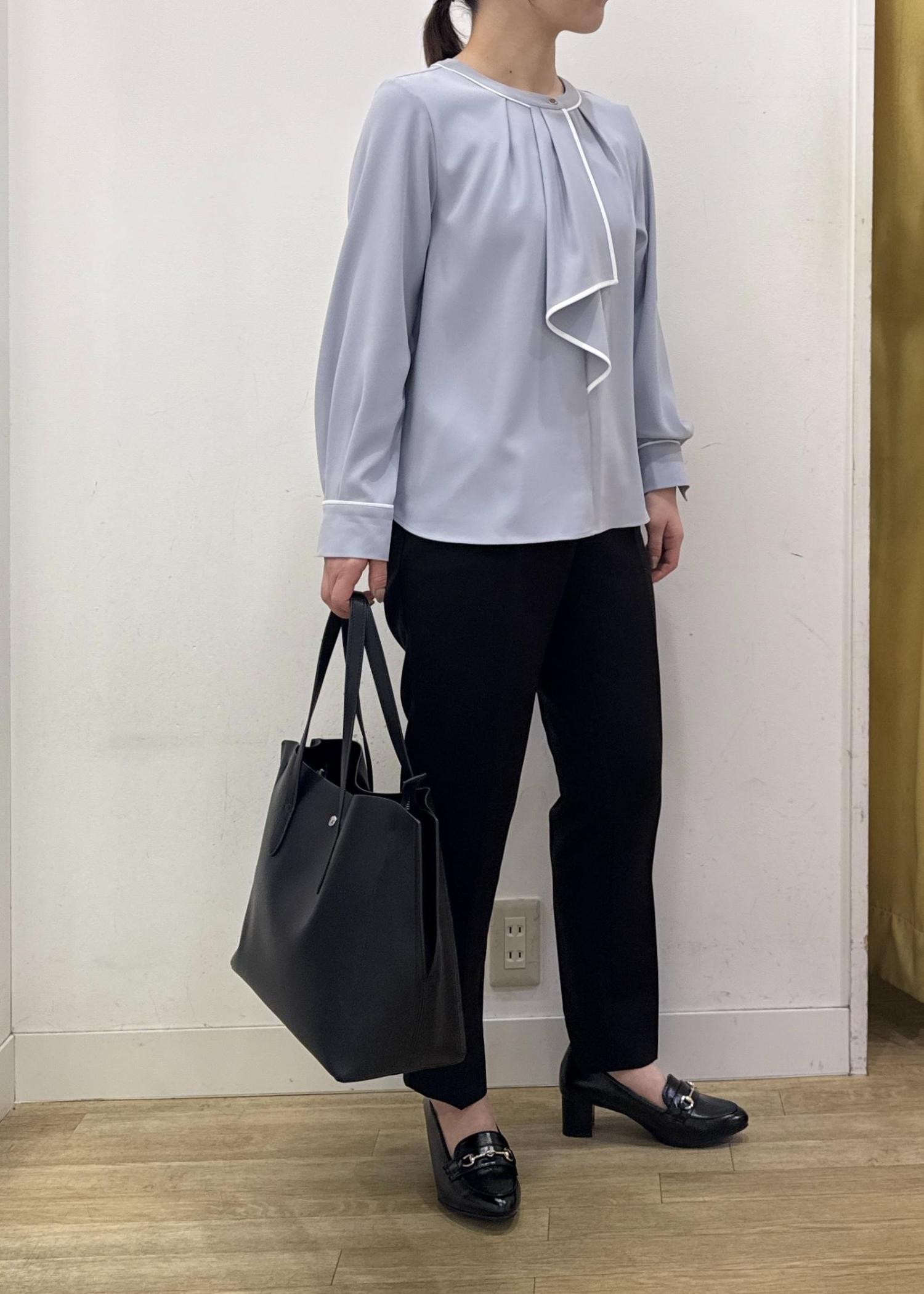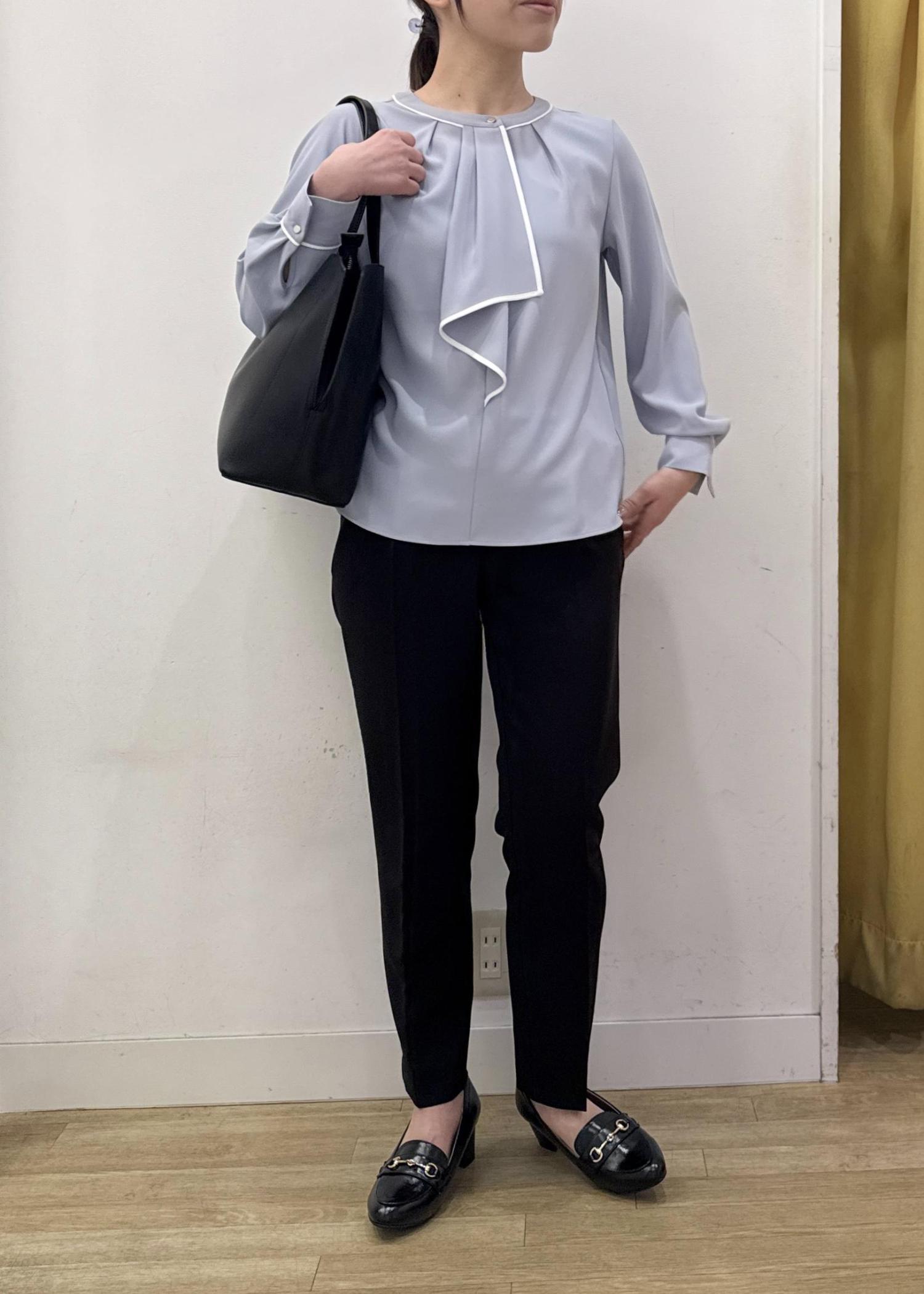 ボウタイ風の配色がポイントのブラウスは1枚でもちゃんと見え☺︎