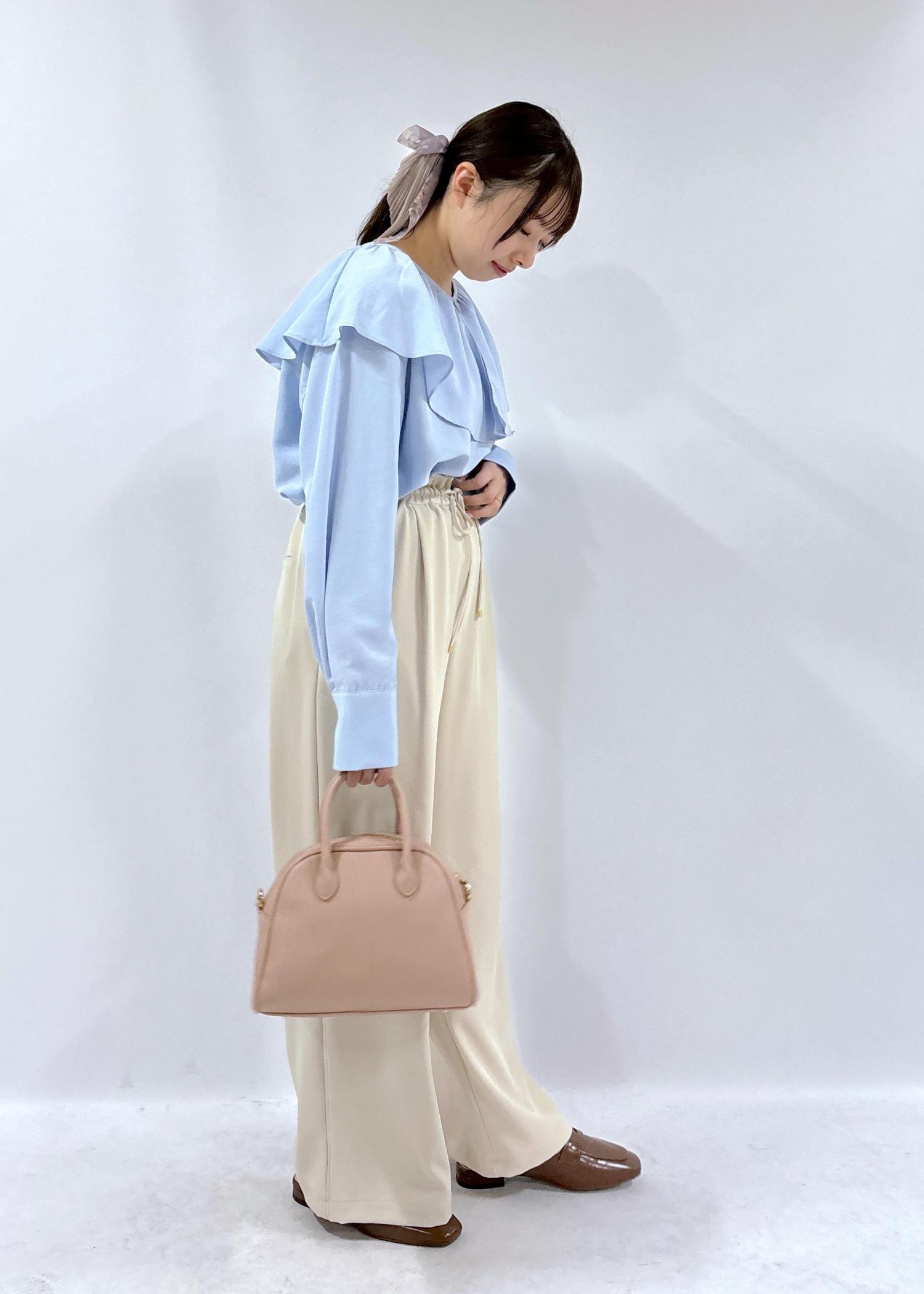 春らしい柔らかい色味のブラウスに、シンプルなボトムスを合わせた着回ししやすいコーデです。