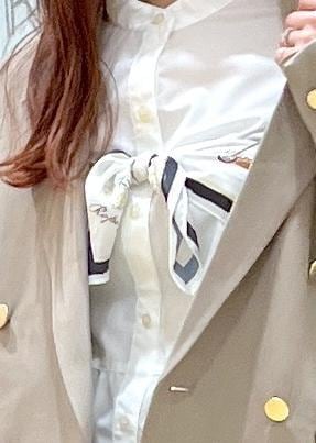 裾がふんわり広がるデザインで、腰回りにボリュームのあるシャツです。