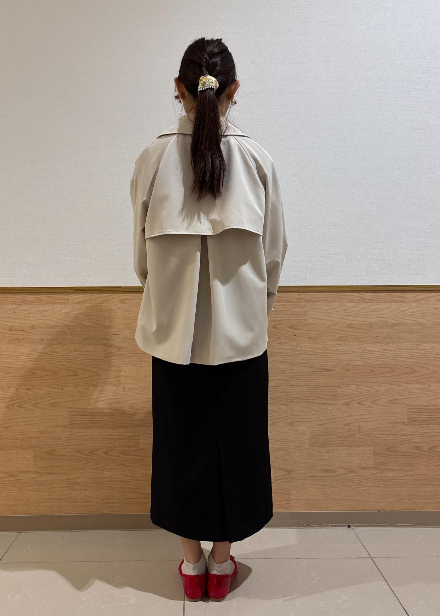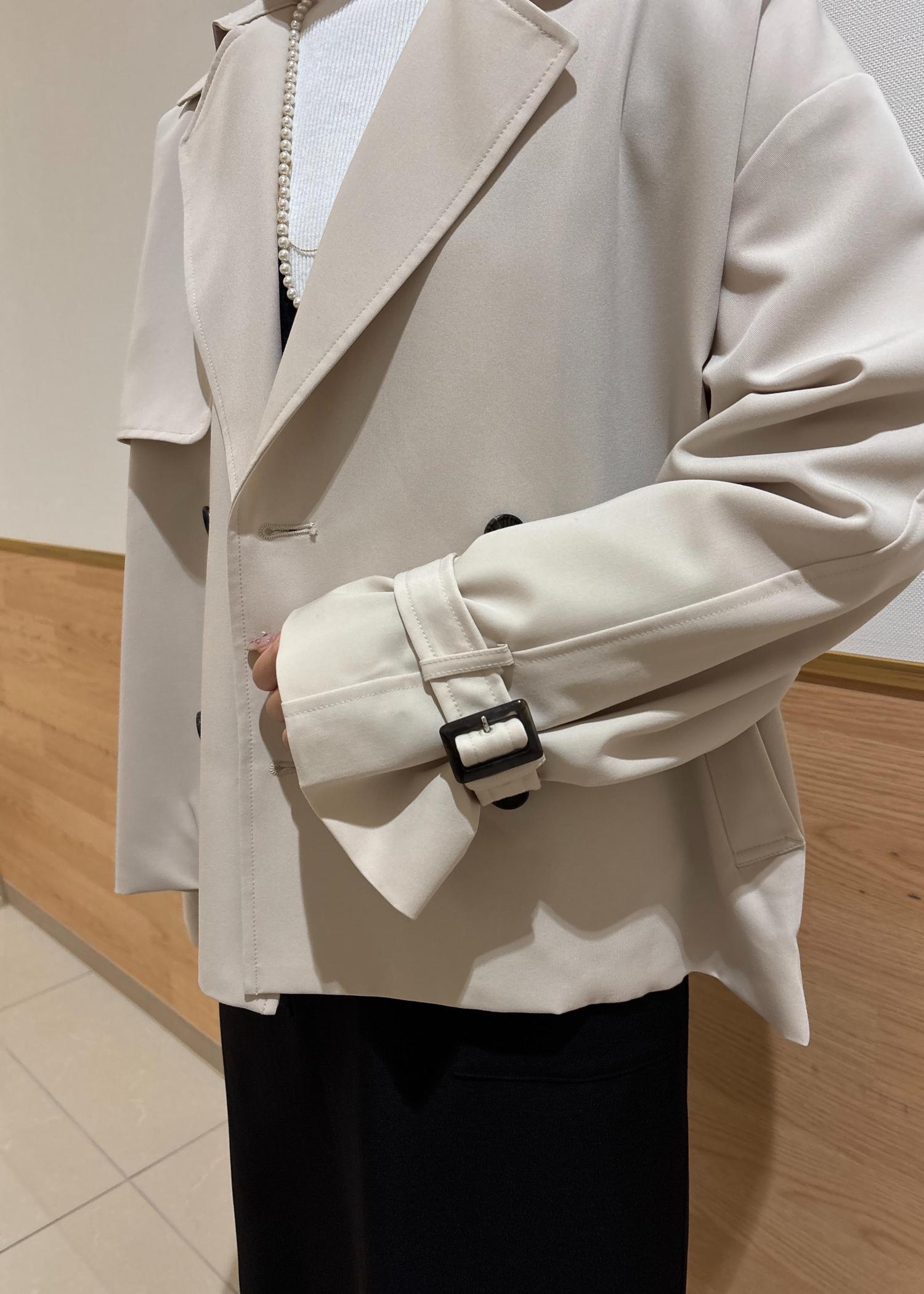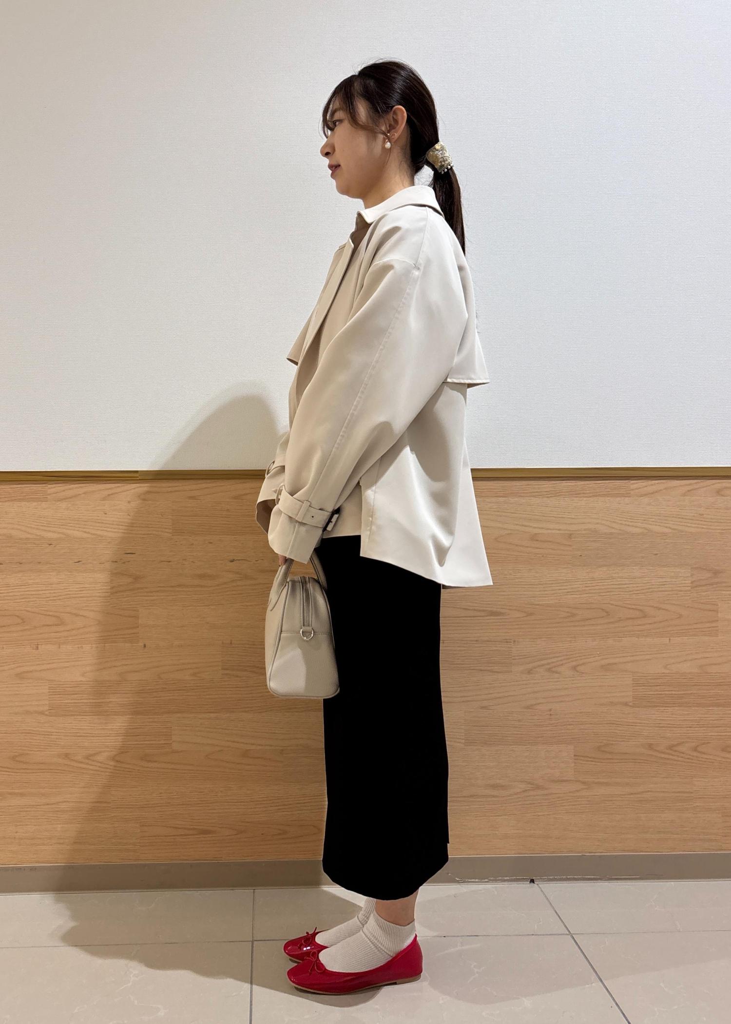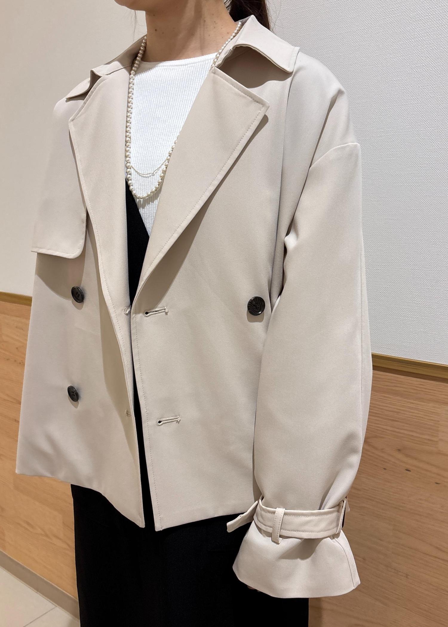 そこに柔らかいベージュのふんわりとしたショートトレンチを合わせました。
