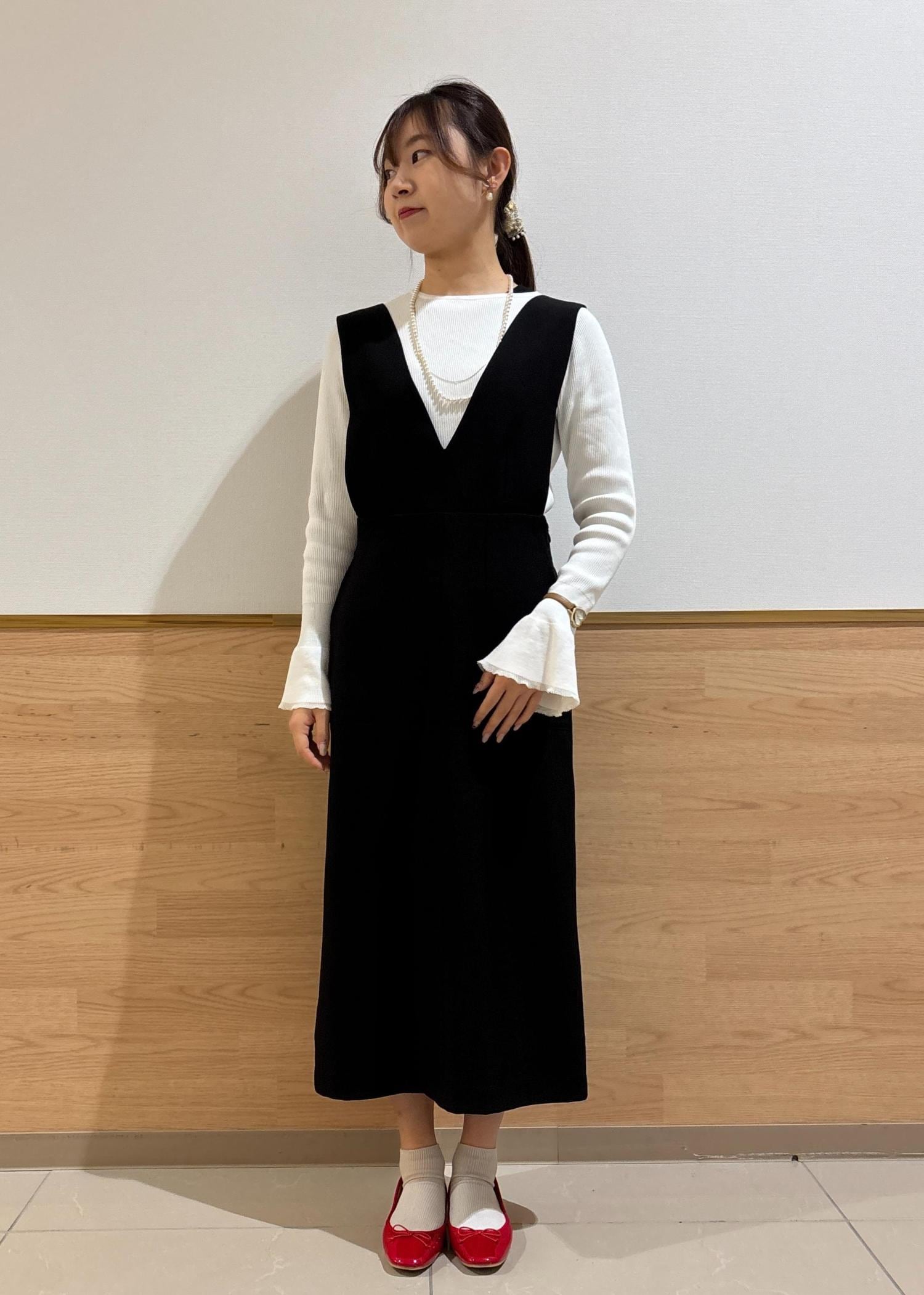 ホワイトのリブトップスにブラックのジャンスカを合わせ、スッキリとしたモノトーンコーデにしました。