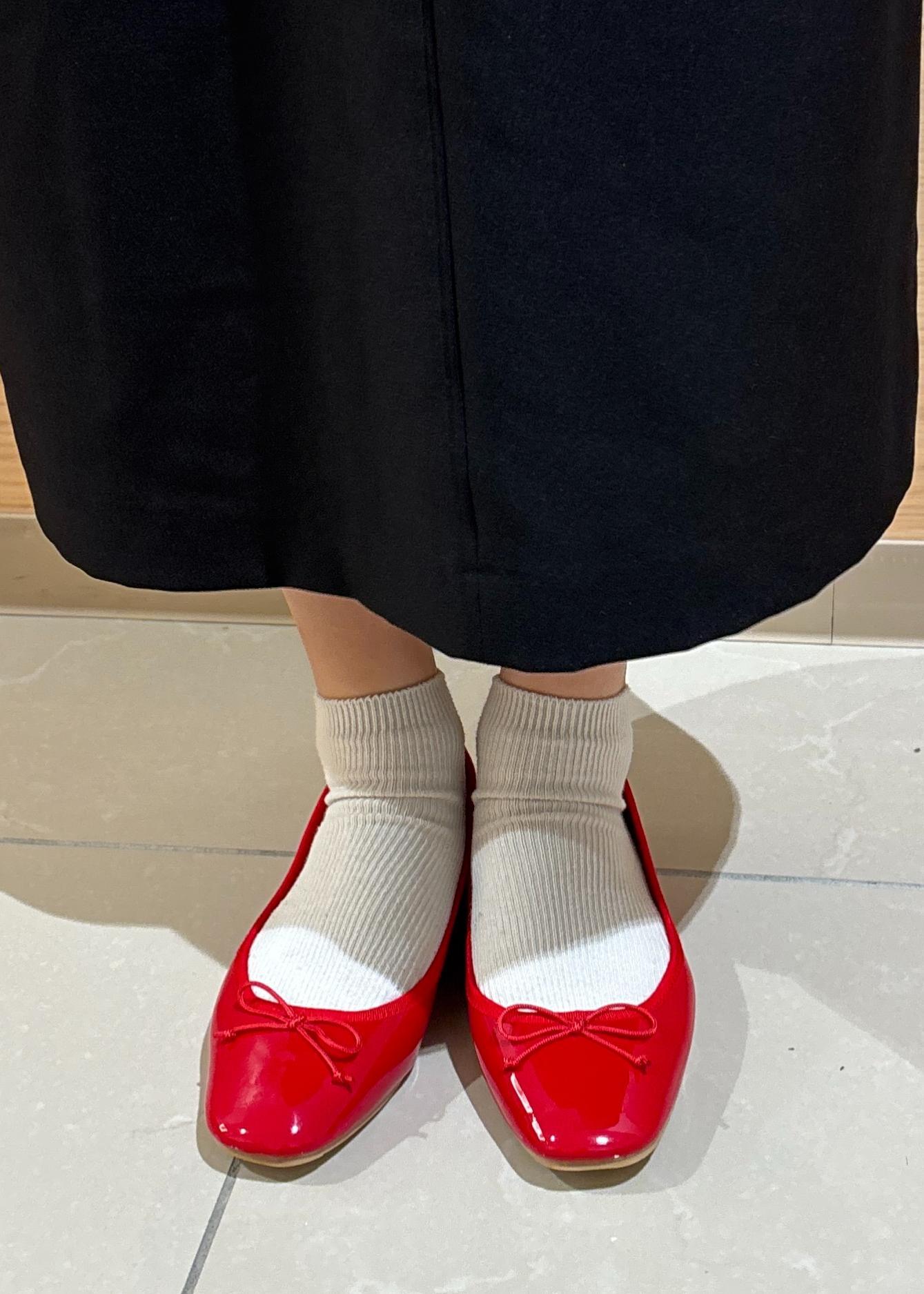 足元には赤のバレエシューズをアクセントにしました。