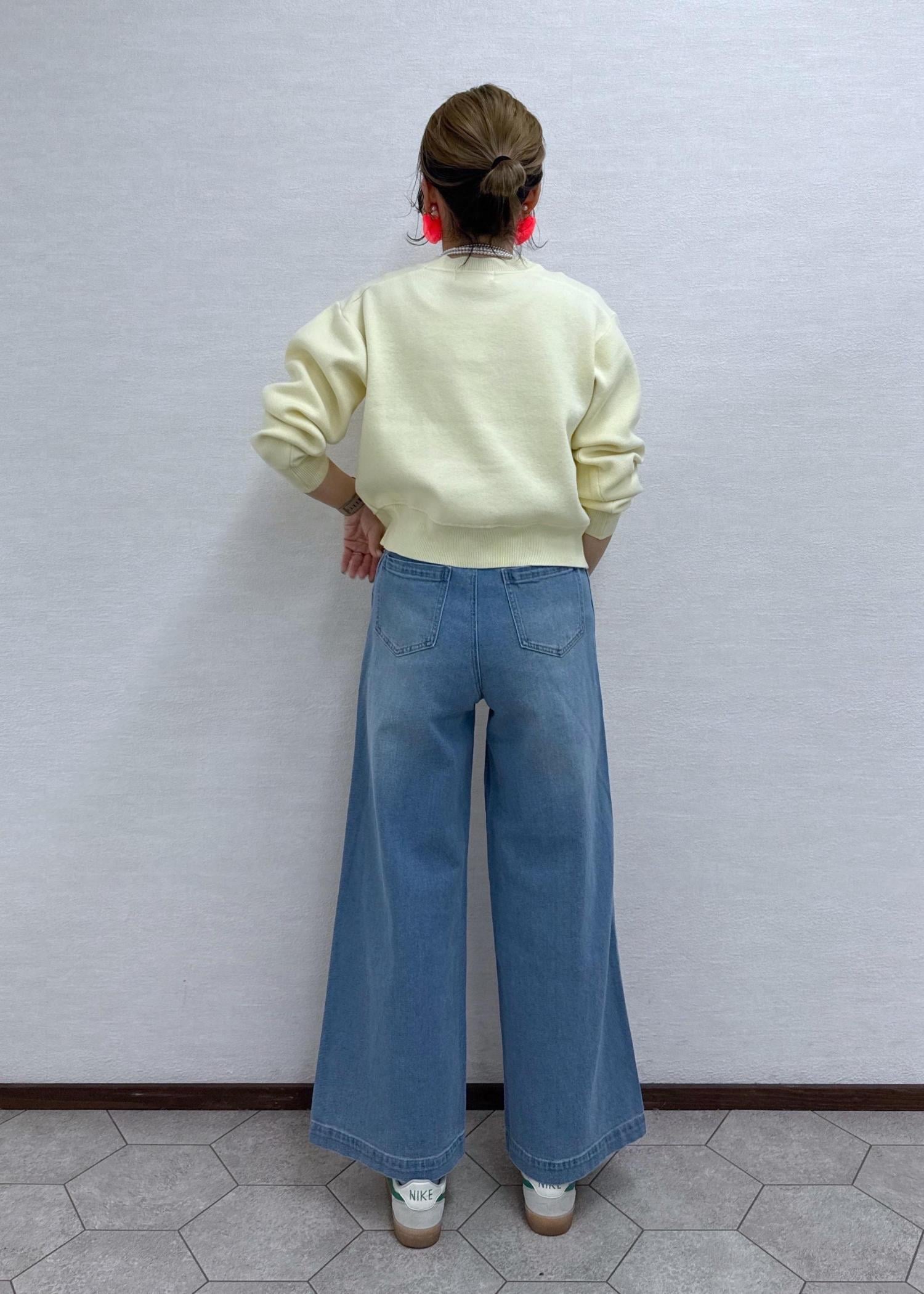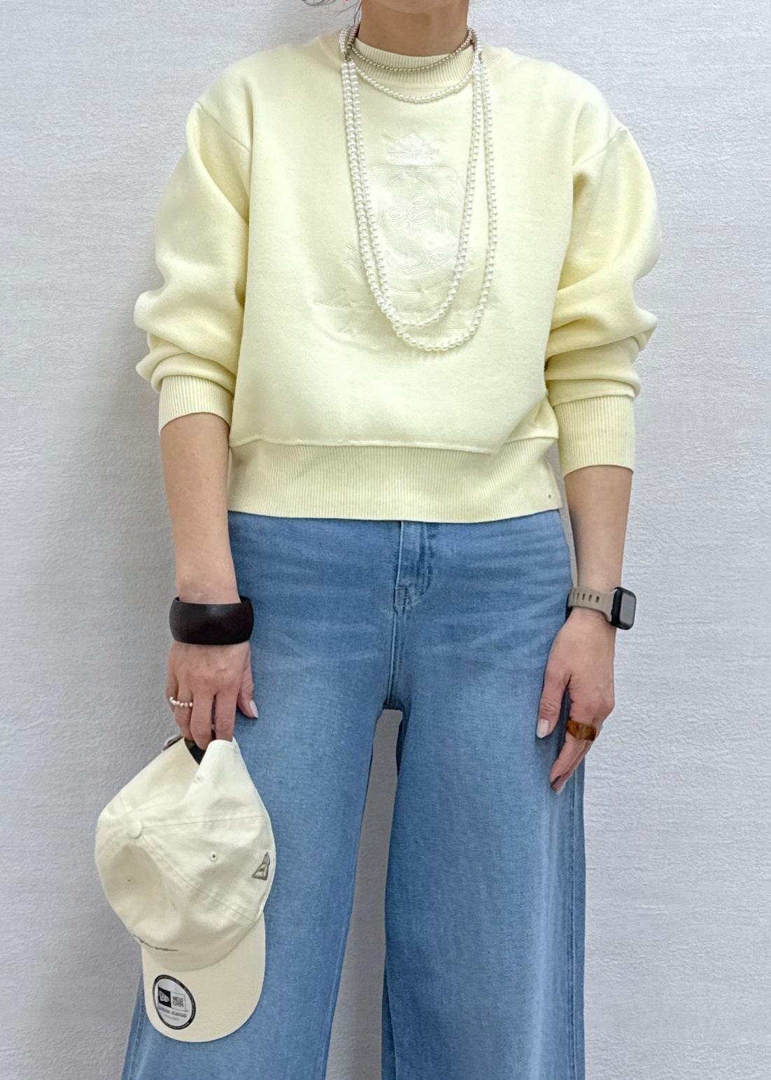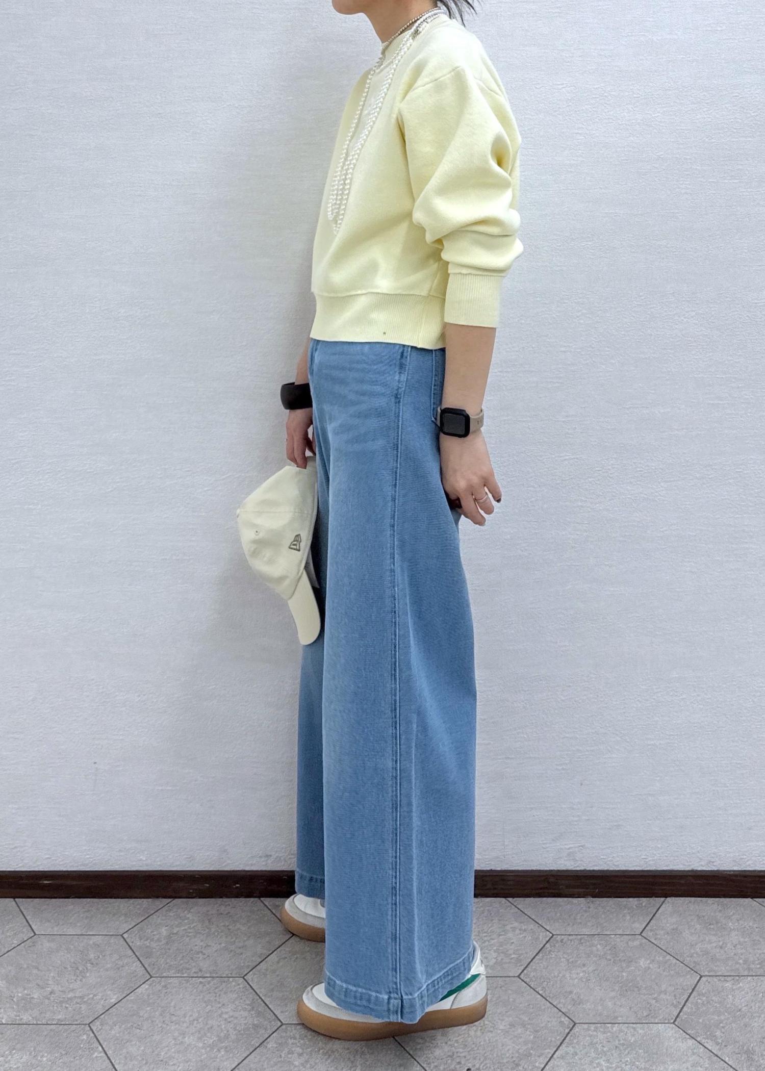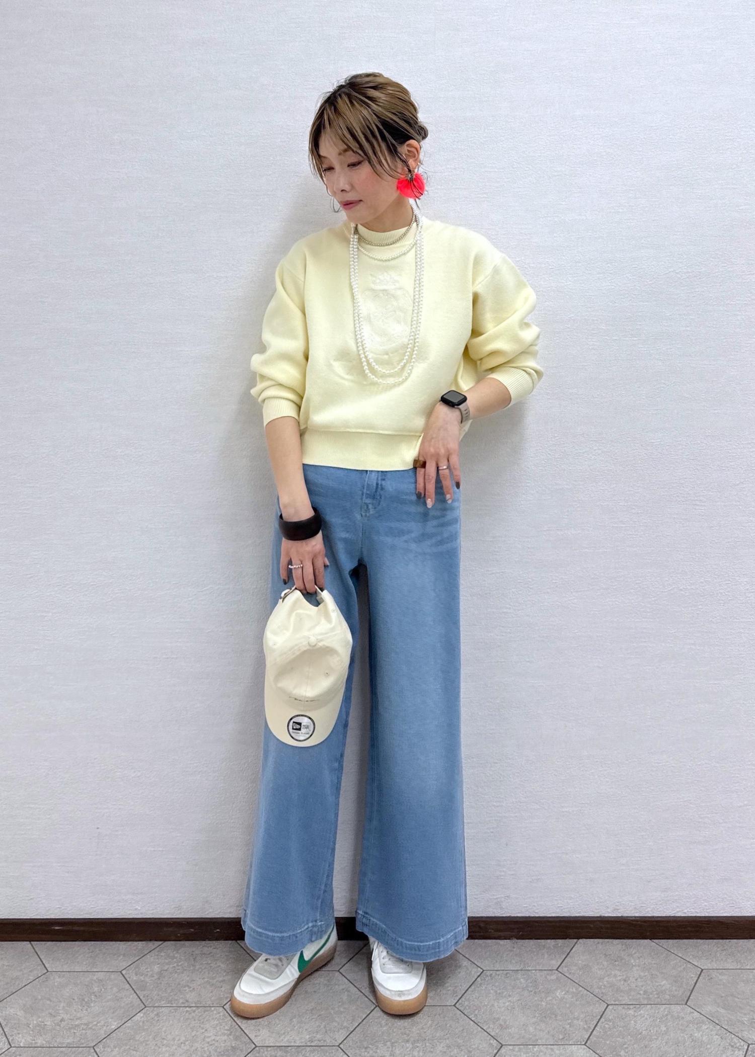 パッと目を惹く春らしいイエローのニットがポイントのカジュアルコーデ。コンパクトなシルエットのトップスに、ワイドデニムパンツを合わせて、スタイルアップも叶えてくれるコーデにしました。