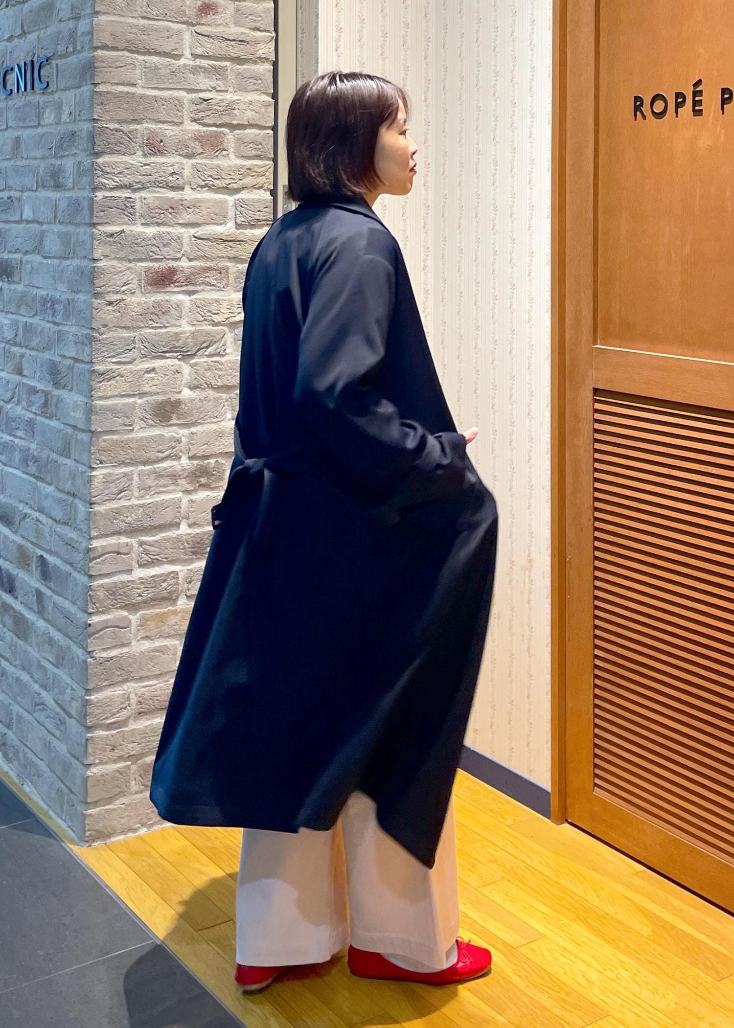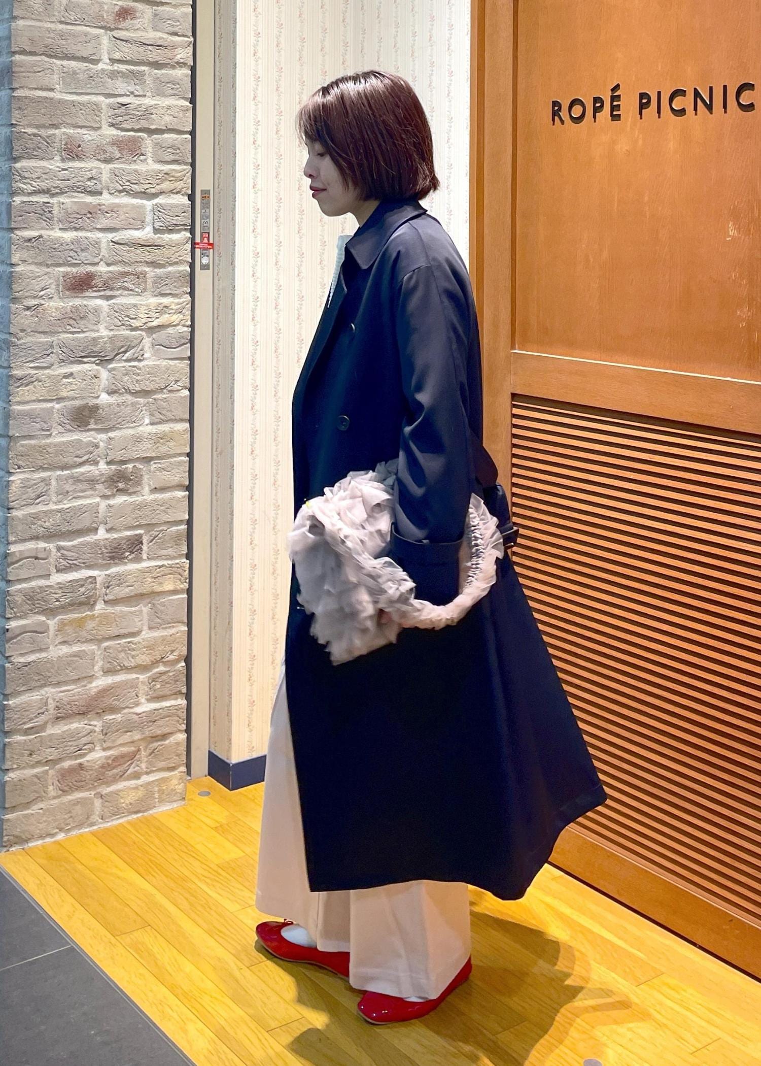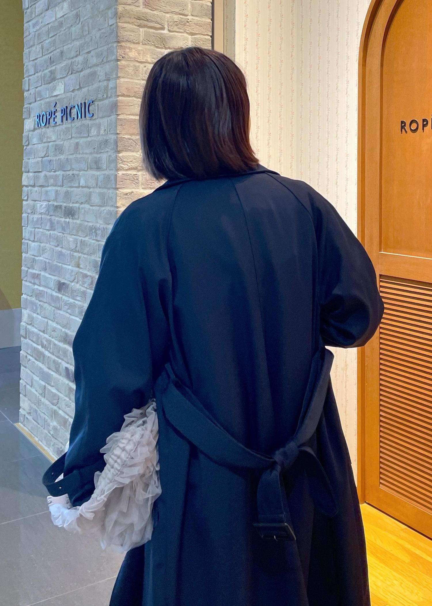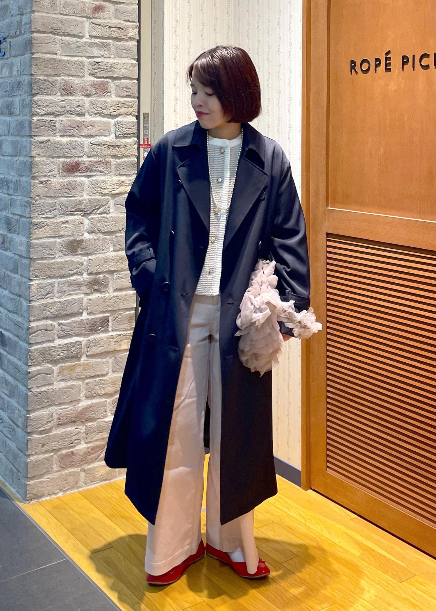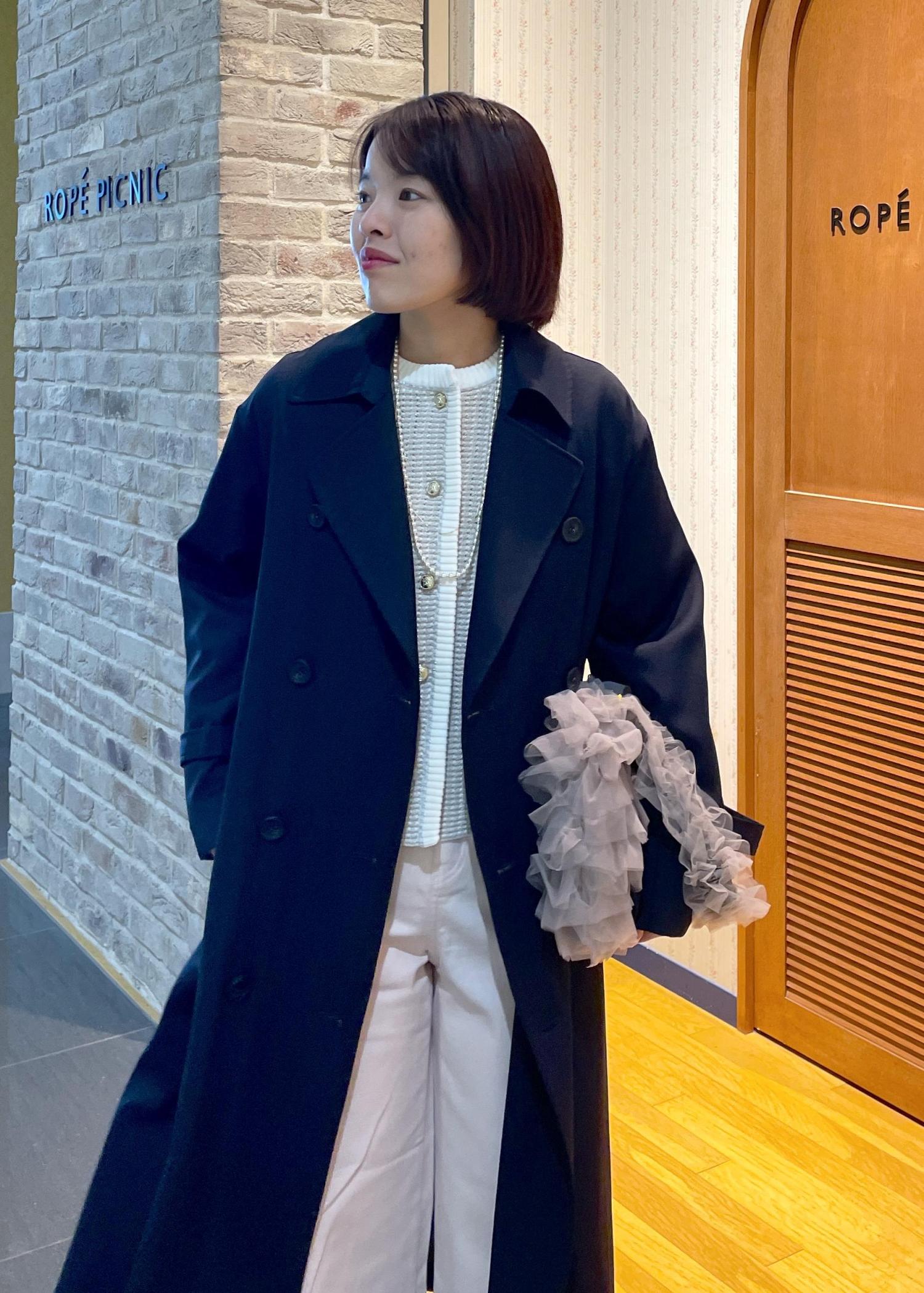 アウターはネイビーのトレンチコートを合わせて、引き締めつつ甘くなり過ぎないコーデに◎