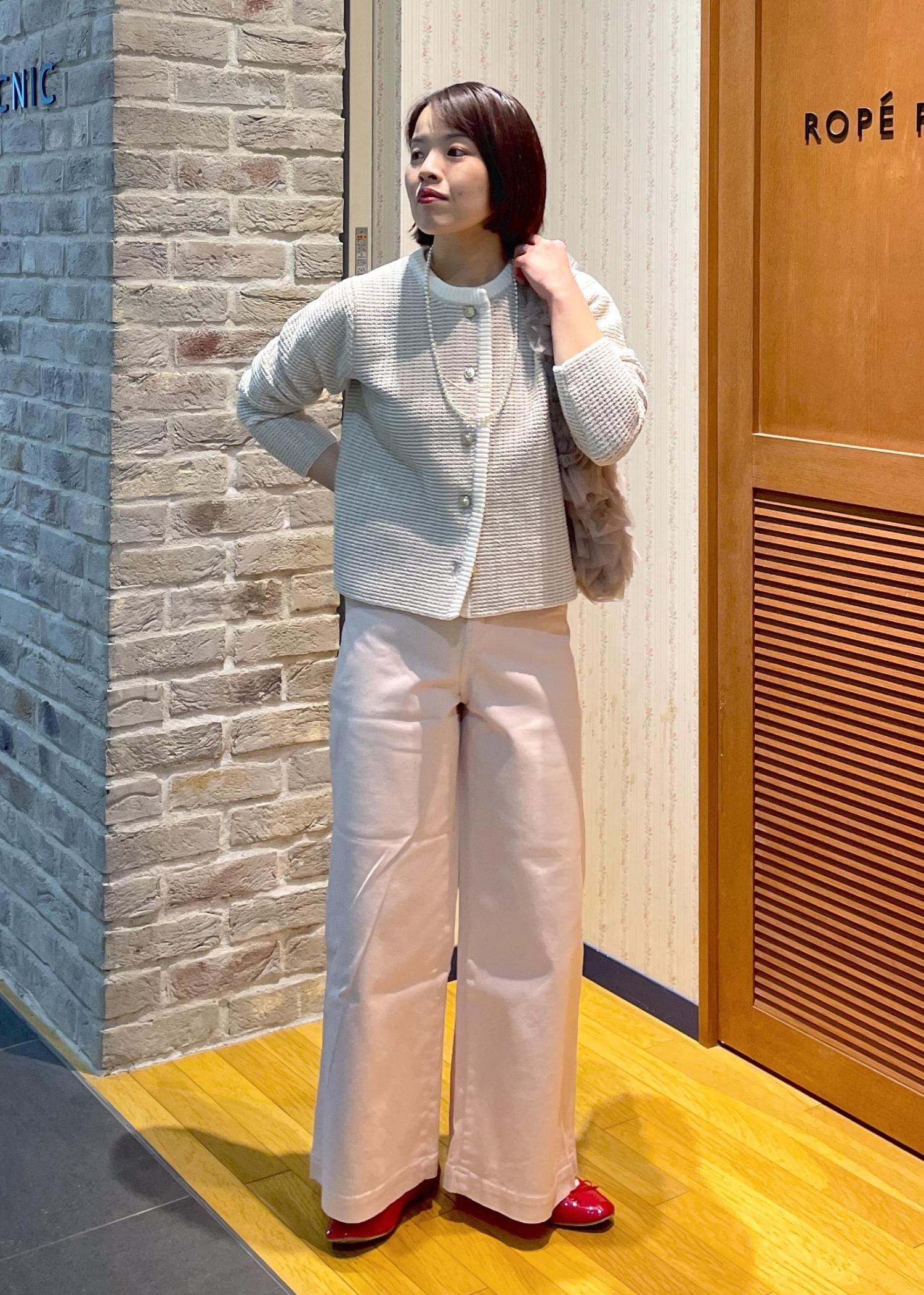 春にぴったりのピンクのデニムにサマーツイードのカーディガンを合わせたちょっと華やかさもある大人カジュアルコーデです!