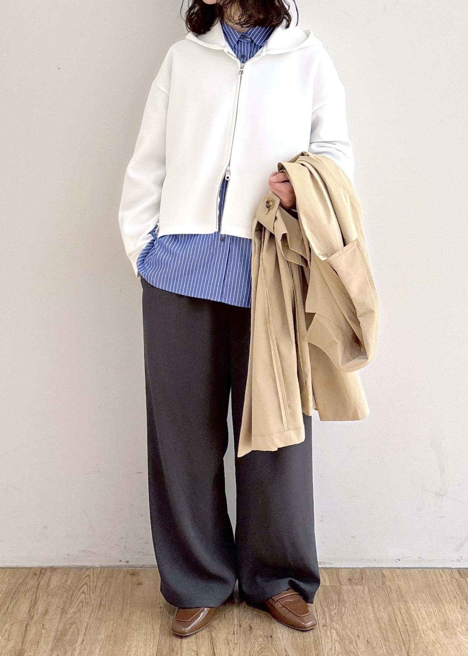 上がストレートで下がウェーブ寄りな骨格のわたしのおすすめバランスコーデをしてみました!腰回りに日々悩んでいますが、柔らかい素材でゆったりなワイドストレートは腰位置が高く見え、脚長効果があるのでとてもおすすめです!プラスでトップスを短丈で合わせると自然とスタイルよく見えますよ!ジップアップパーカは柔らかい印象にしてくれるのでこなれ感がでます!