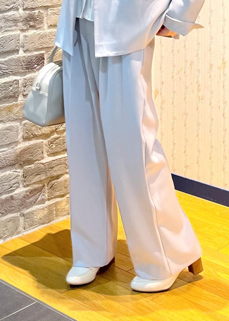 ゆったりめなワイドですがセンターラインが入っていて、サラッと落ち感のある素材なのですっきり見えます。 -
