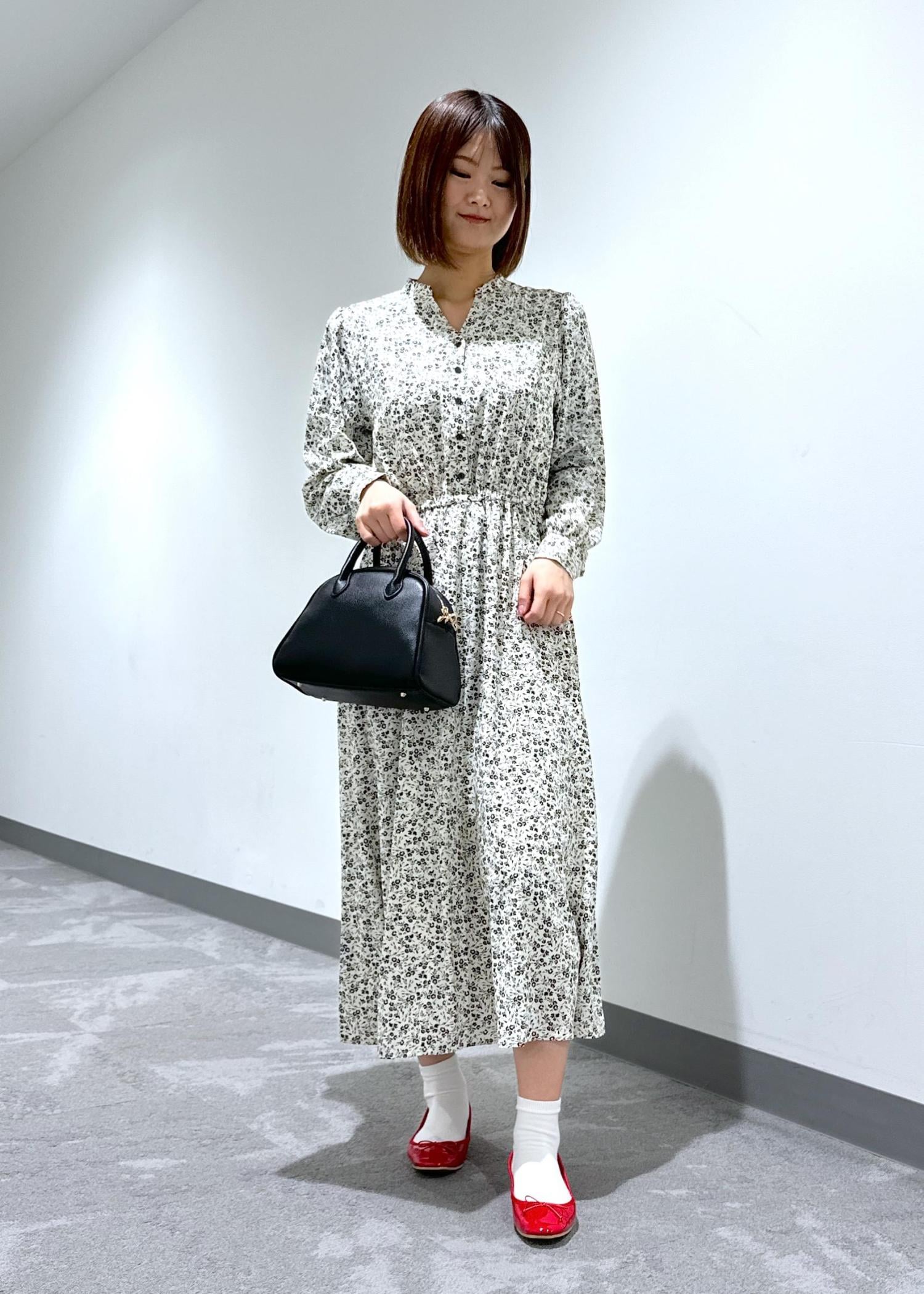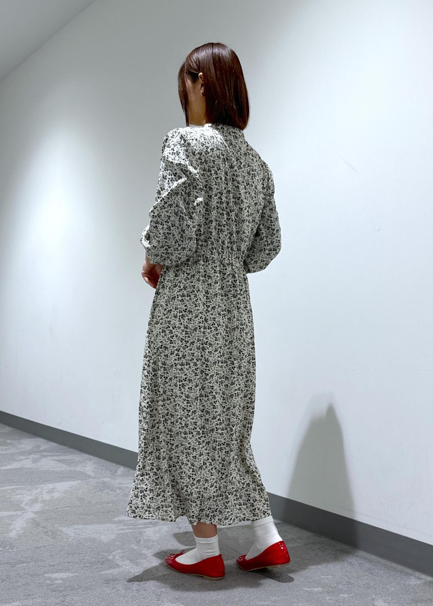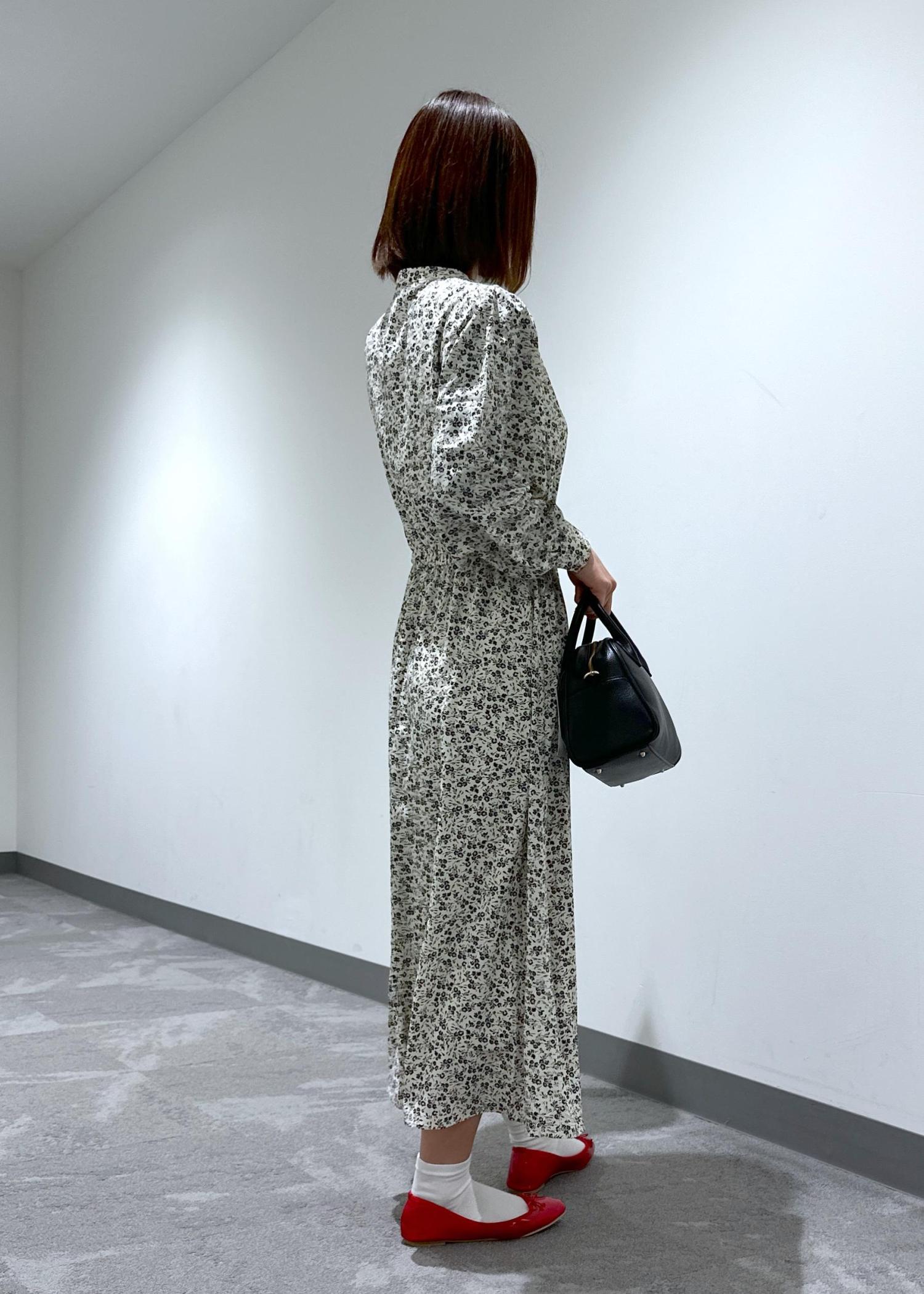 小花柄のスキッパーロングワンピースにバレエシューズを合わせてデートやお出かけにぴったりなコーデにしてみました。