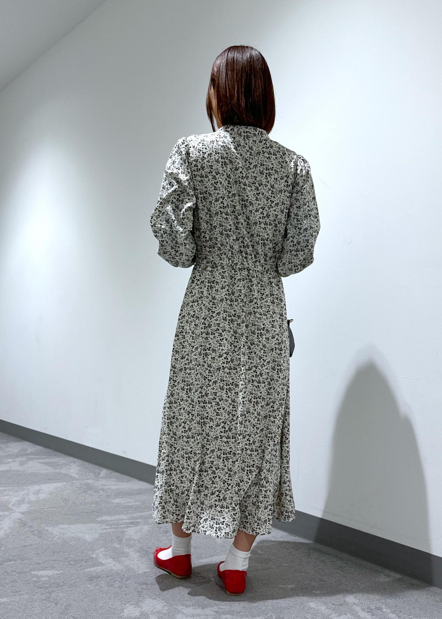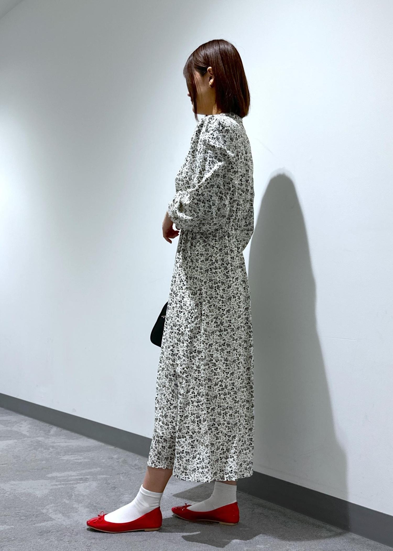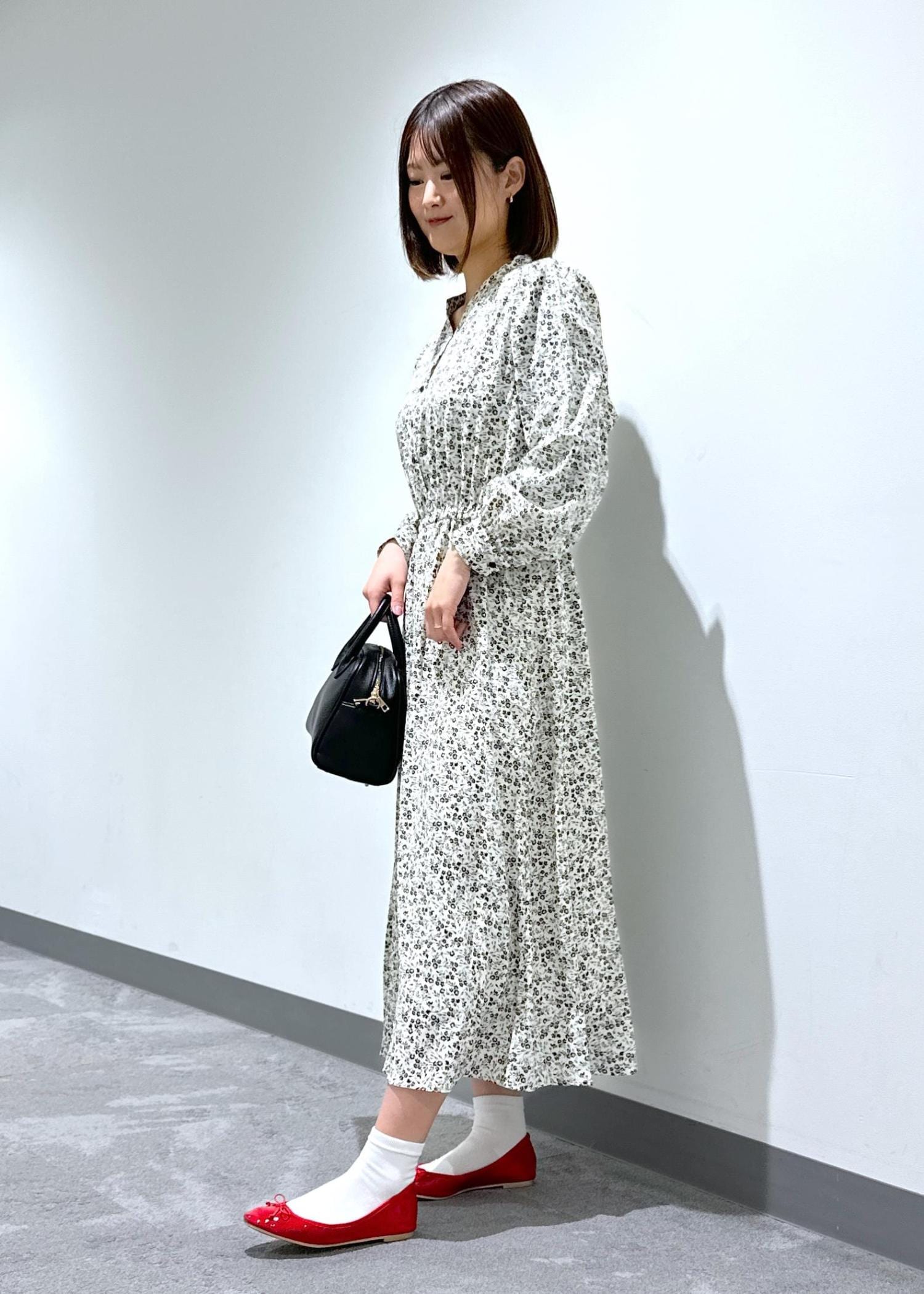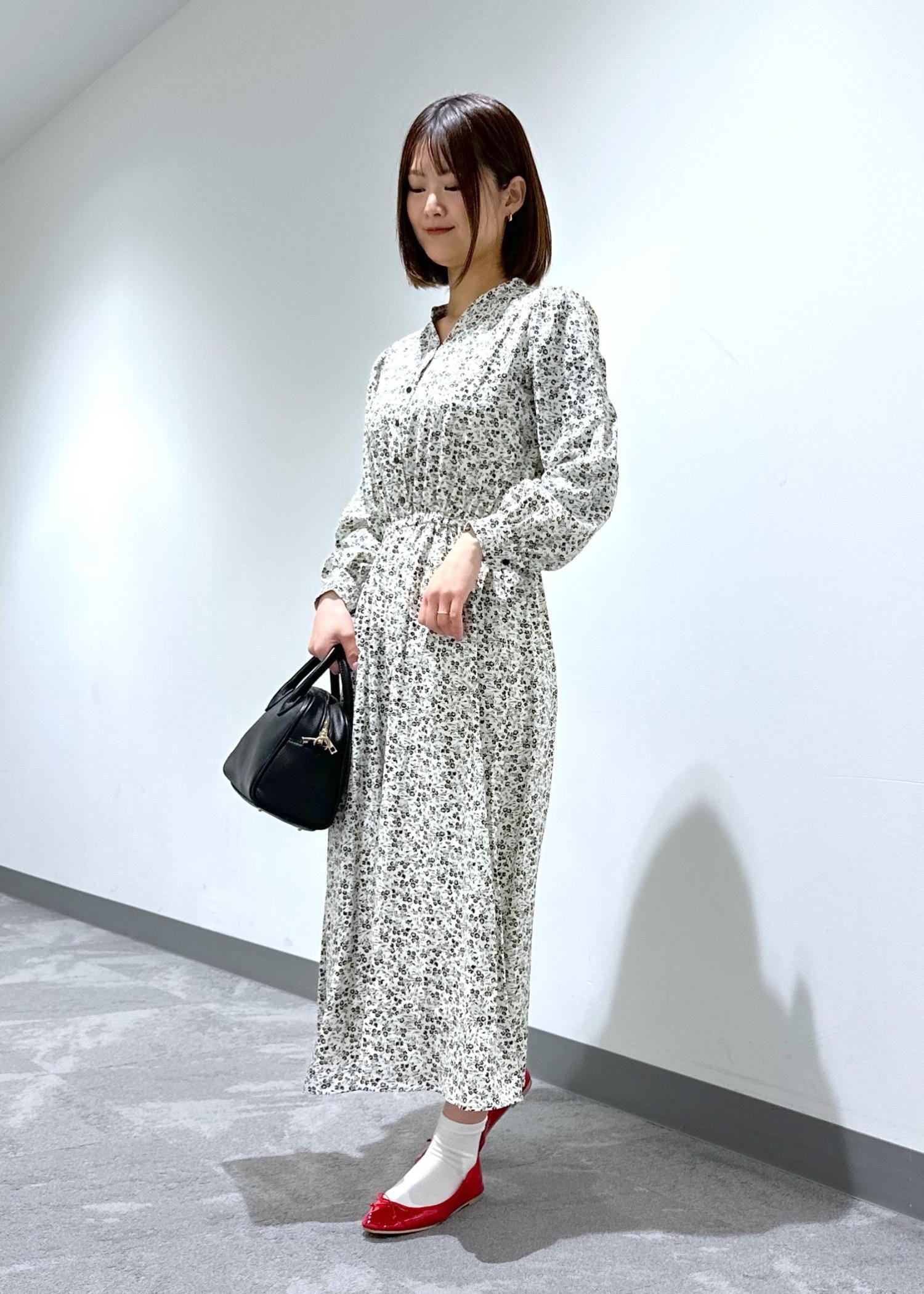 小花柄のスキッパーロングワンピースにバレエシューズを合わせてデートやお出かけにぴったりなコーデにしてみました。