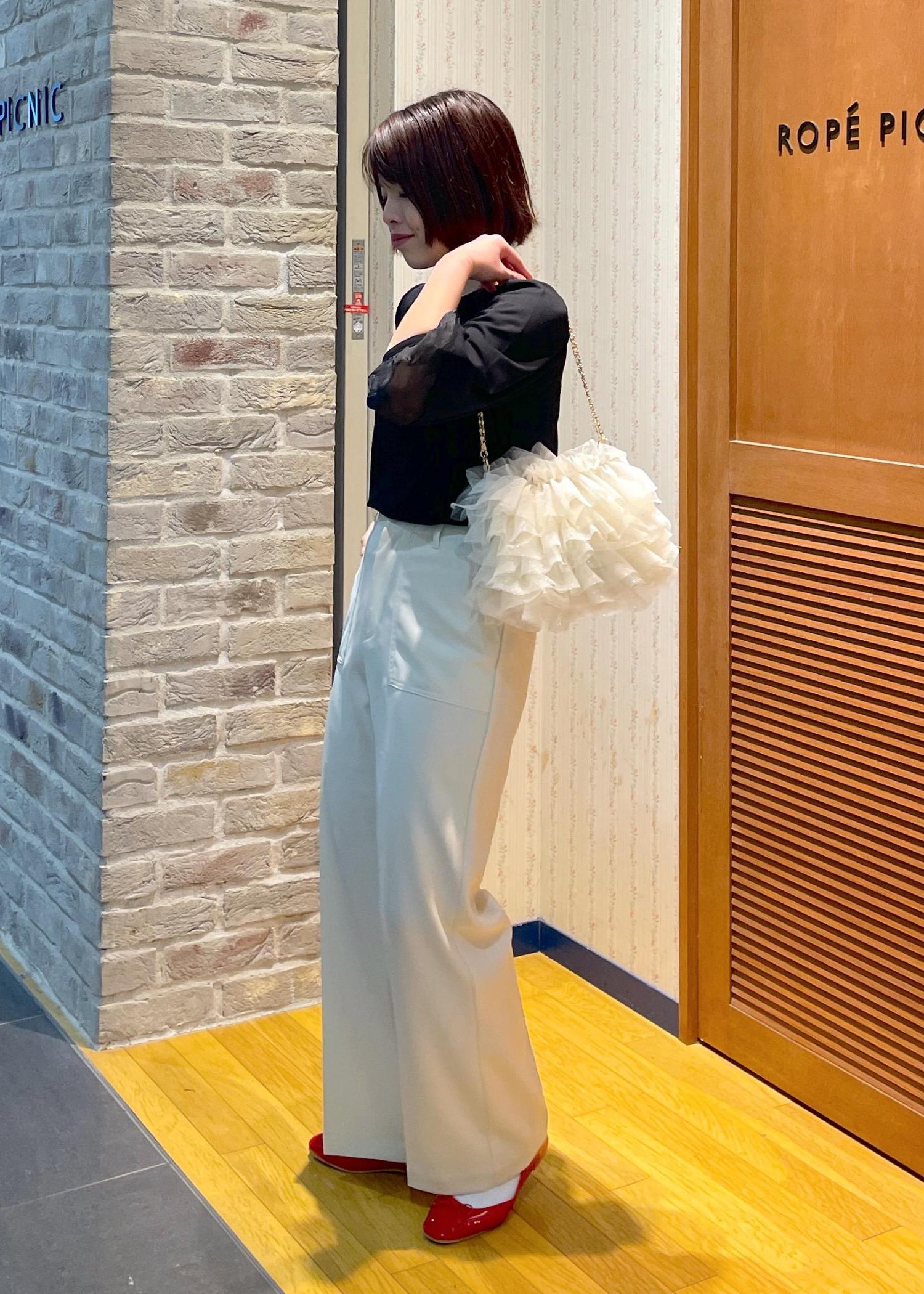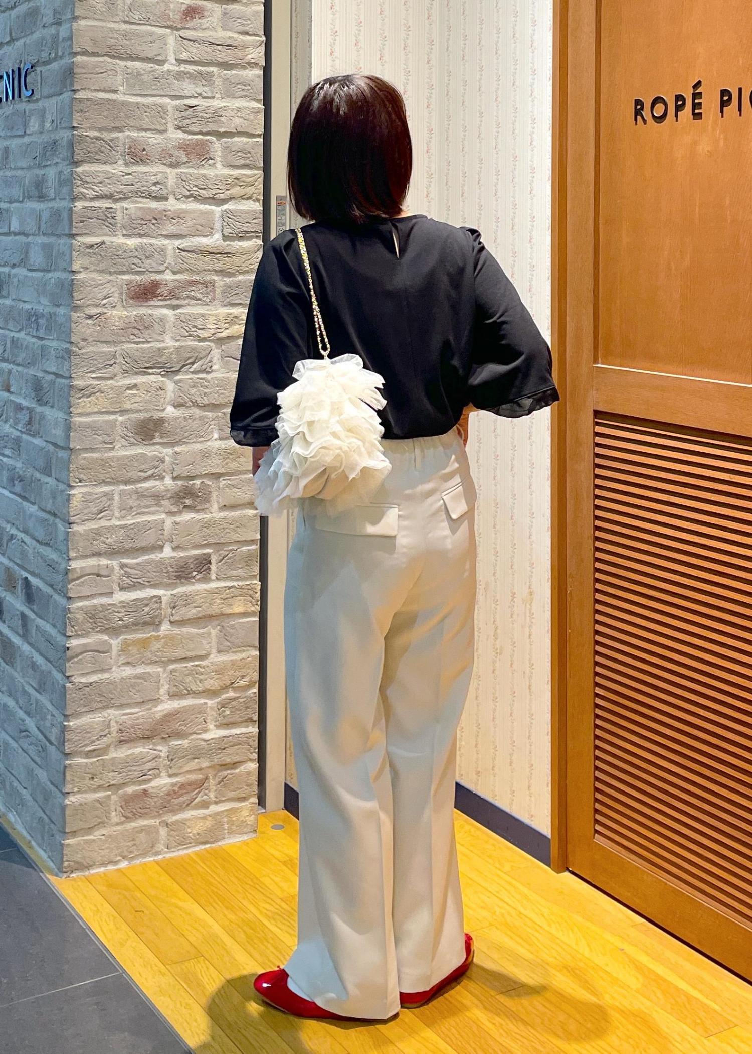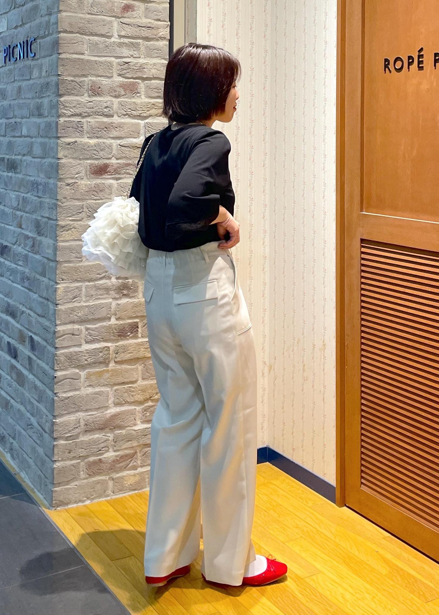 トップスとパンツは黒白でまとめてシンプルで大人な印象でまとめて、足元も赤のバレエシューズをアクセントで合わせました◎