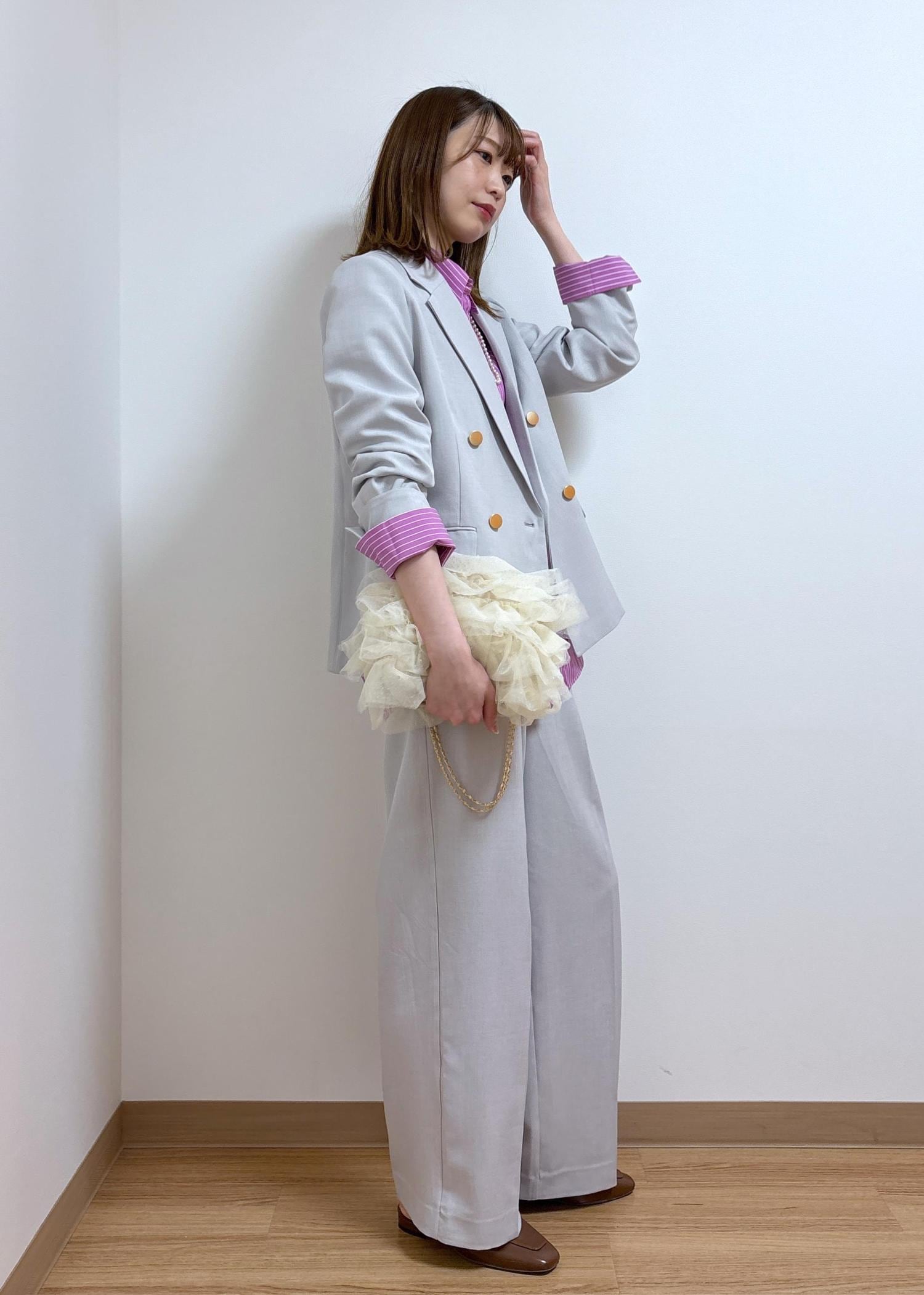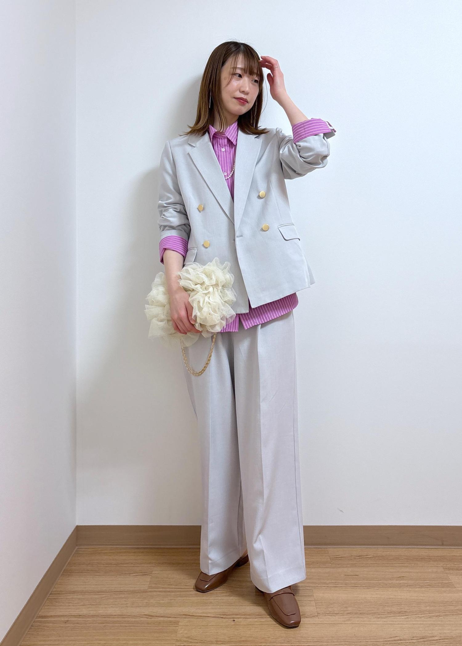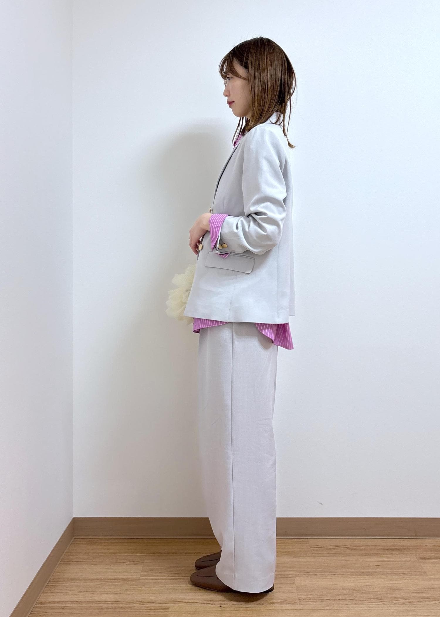 シンプルなセットアップなので、ローズピンクのシャツを合わせて差し色にしました。