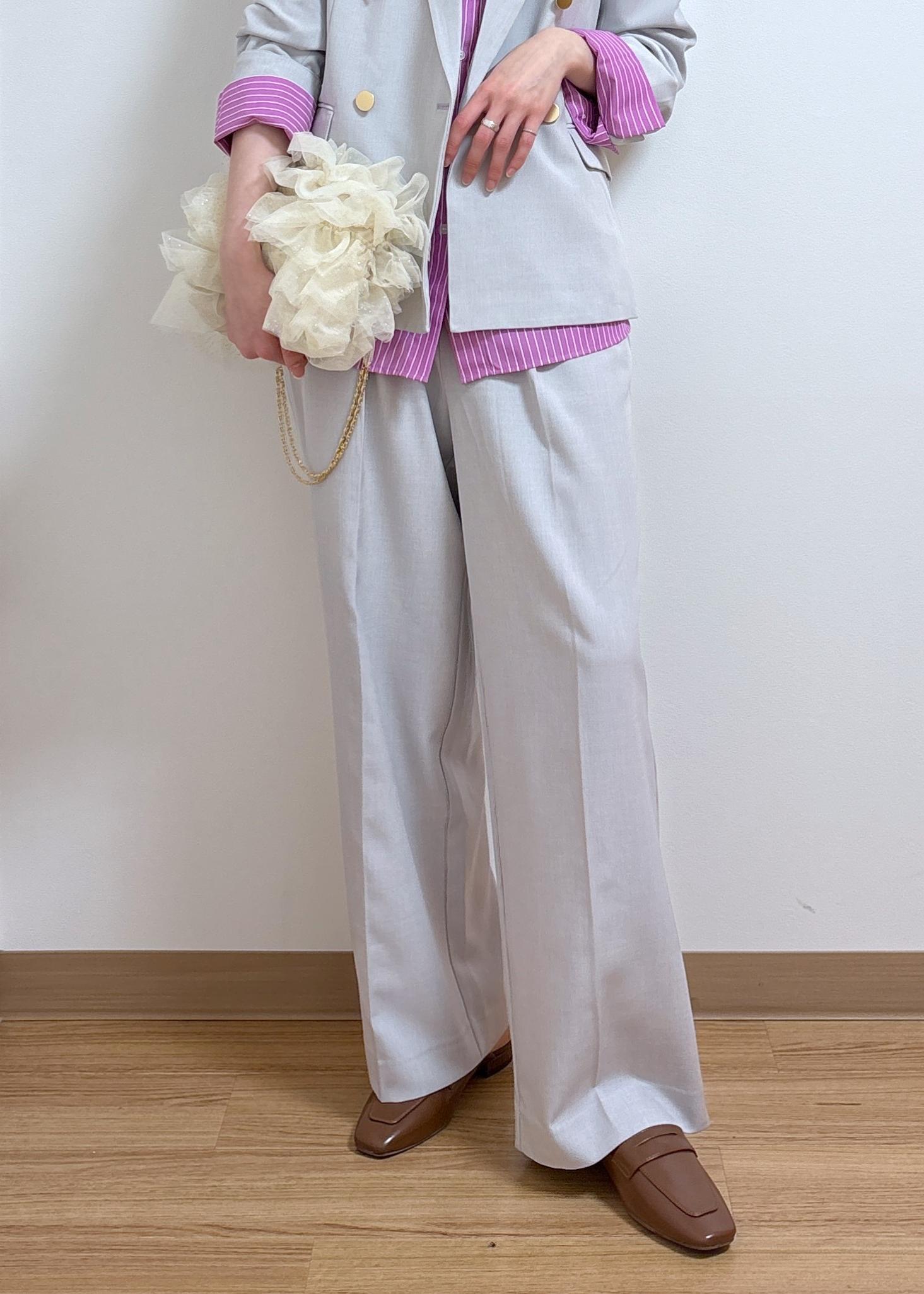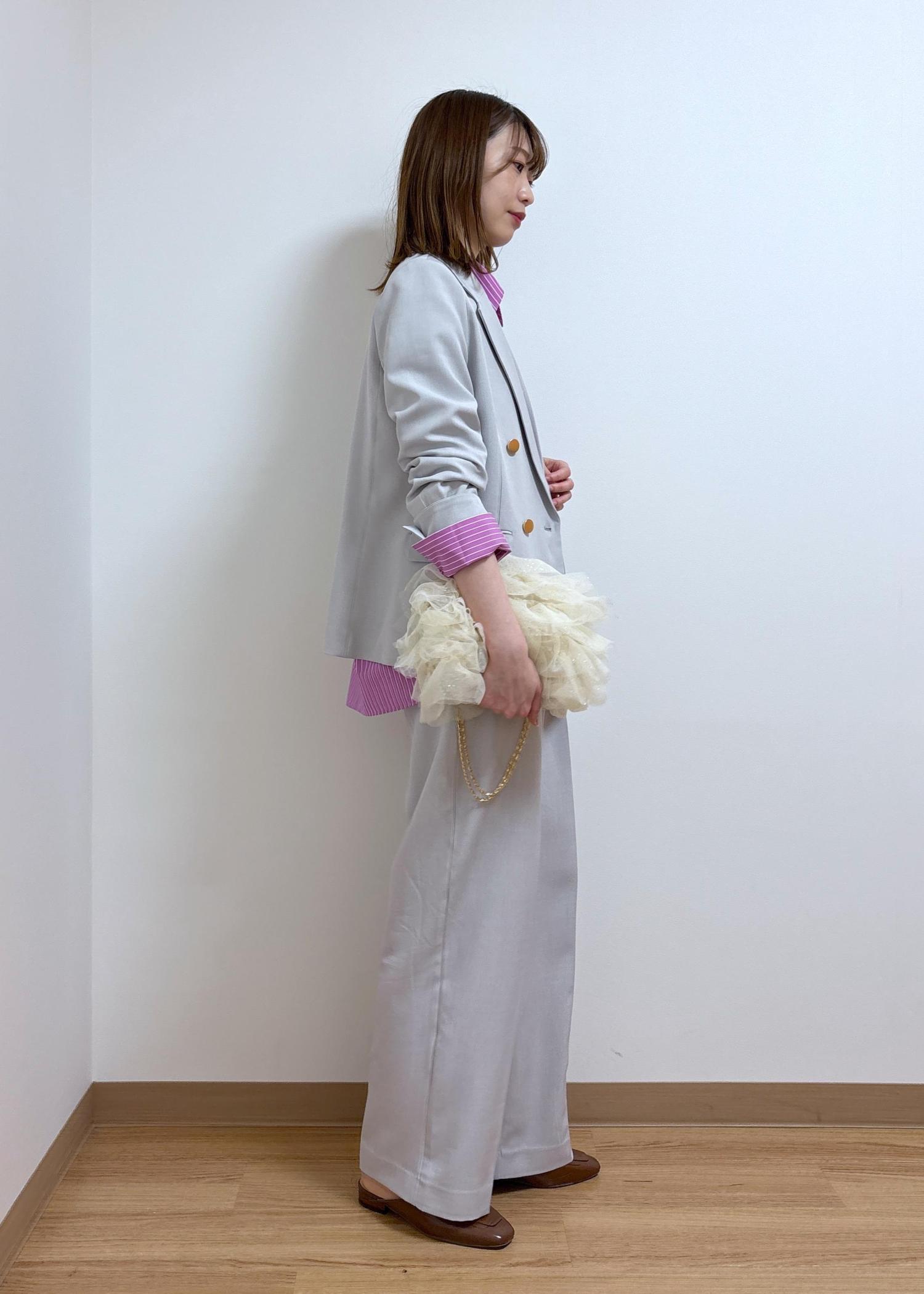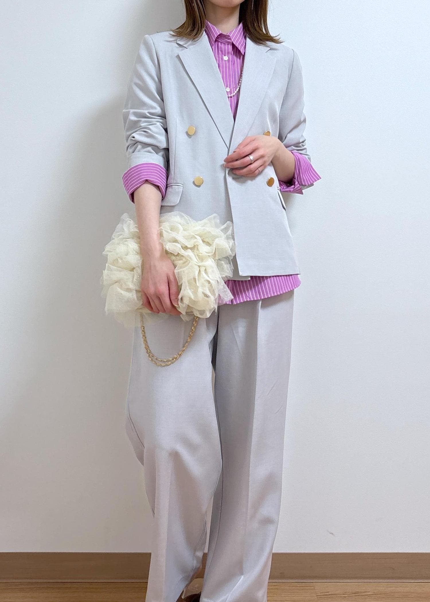 シンプルなセットアップなので、ローズピンクのシャツを合わせて差し色にしました。