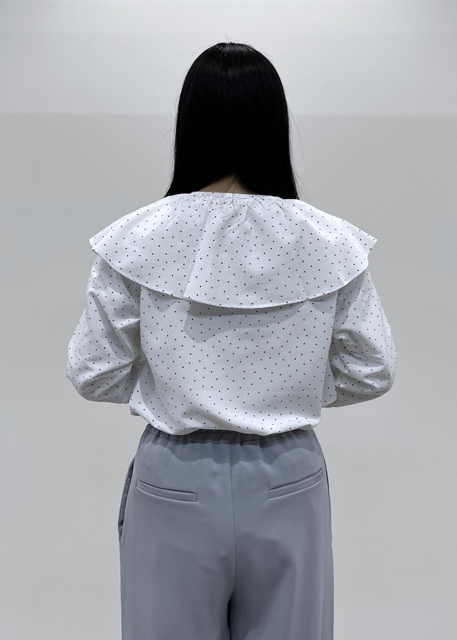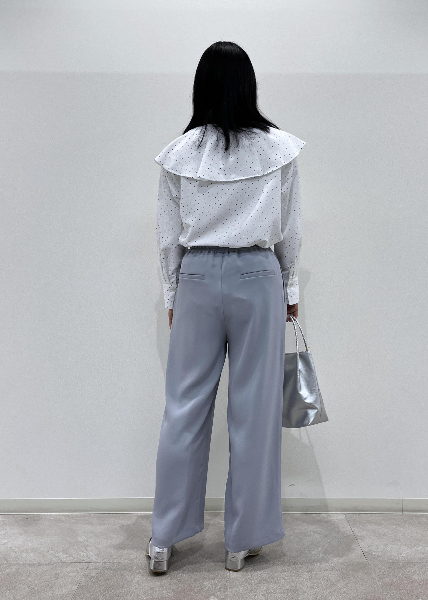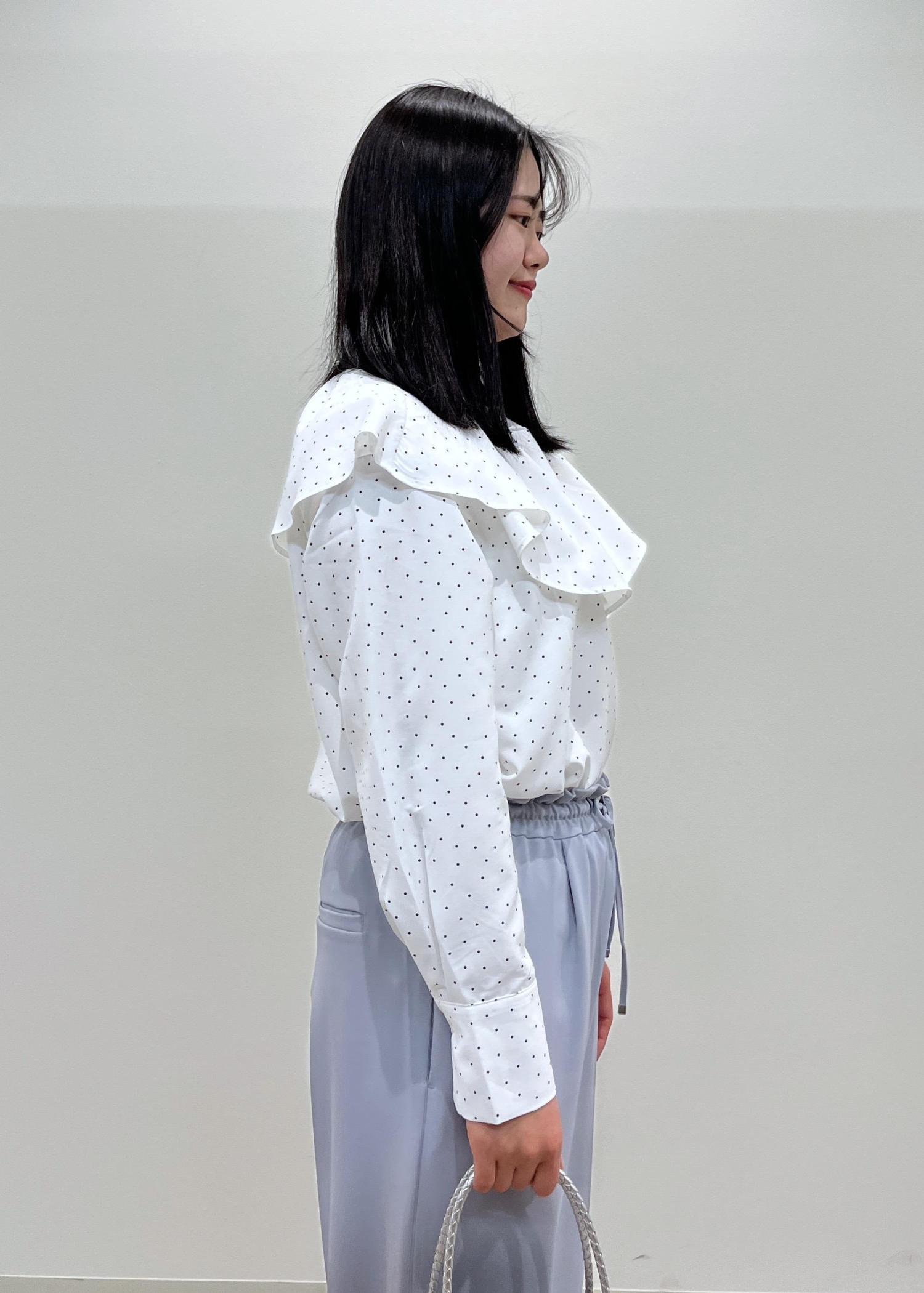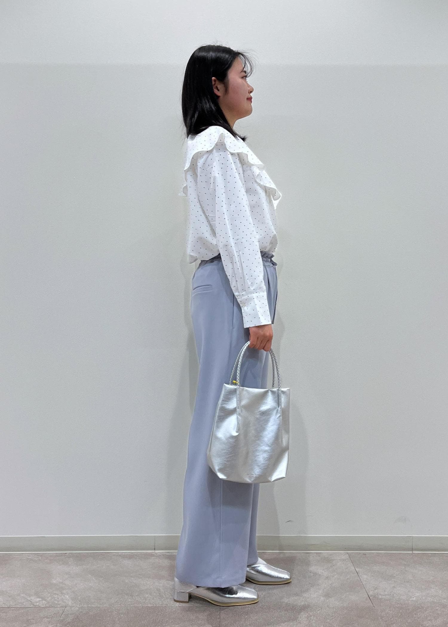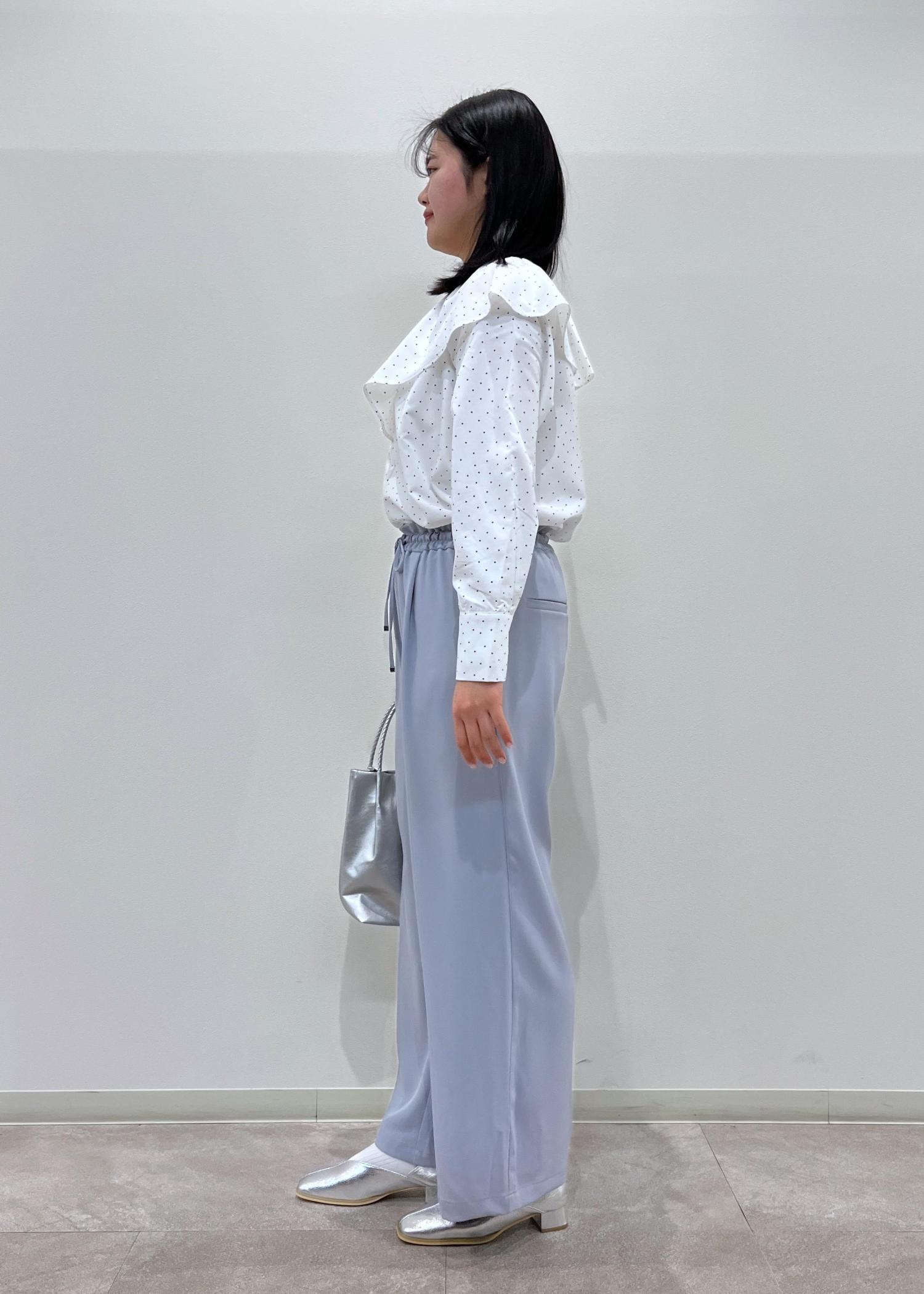 ドットブラウスと爽やかなブルーのパンツで春っぽいコーディネートにしました。