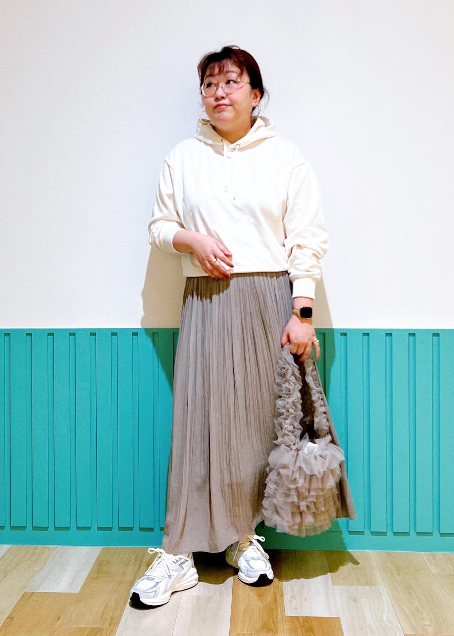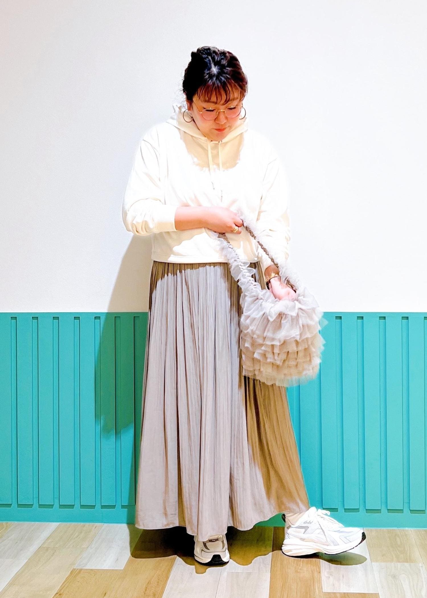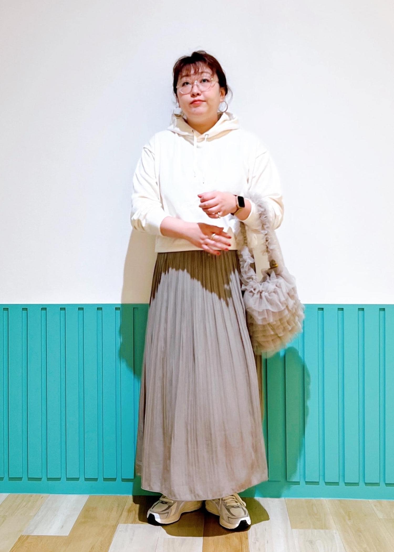ホワイトのパーカーにブラウン寄りの