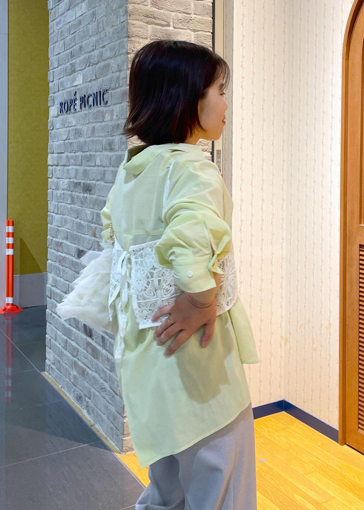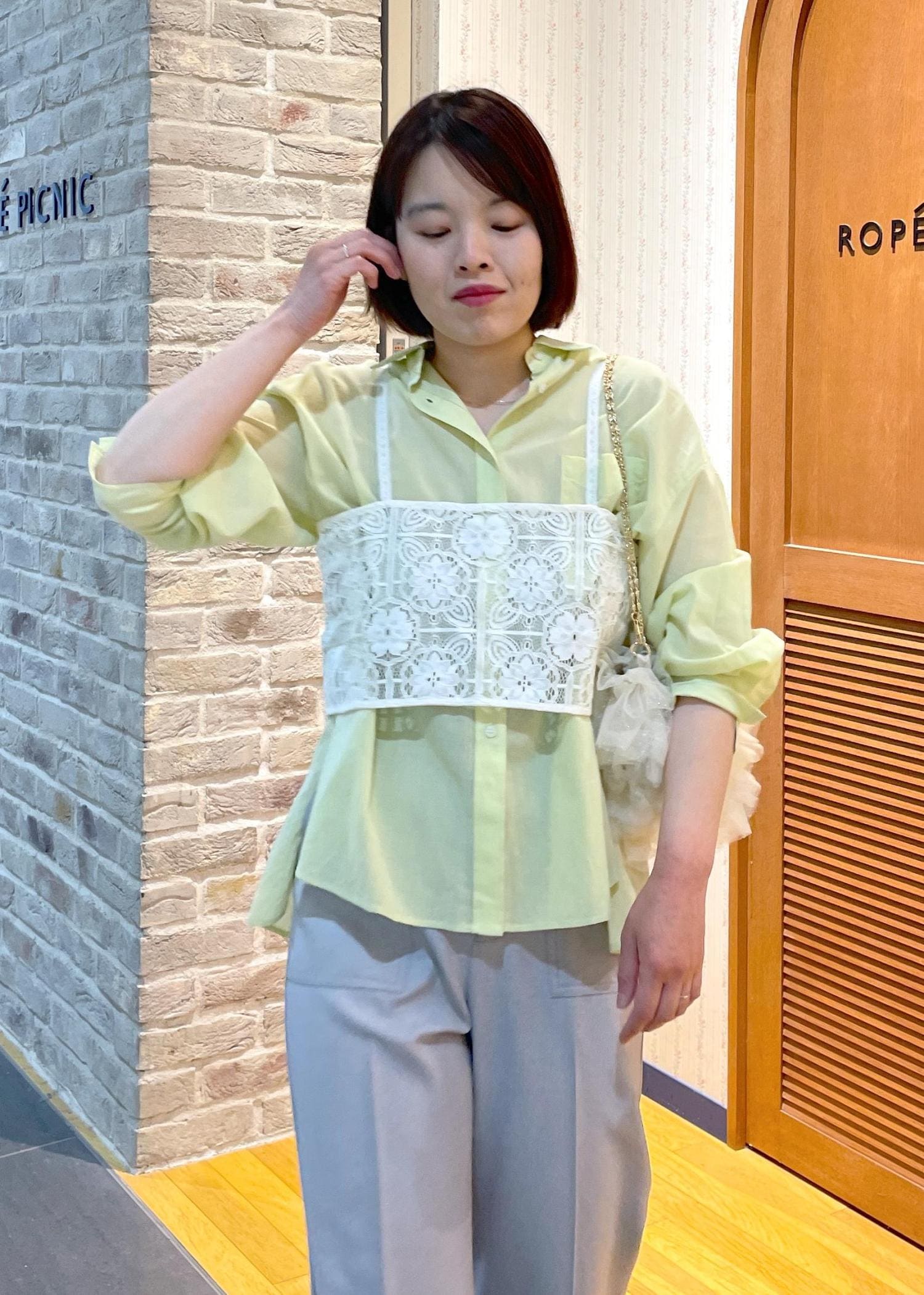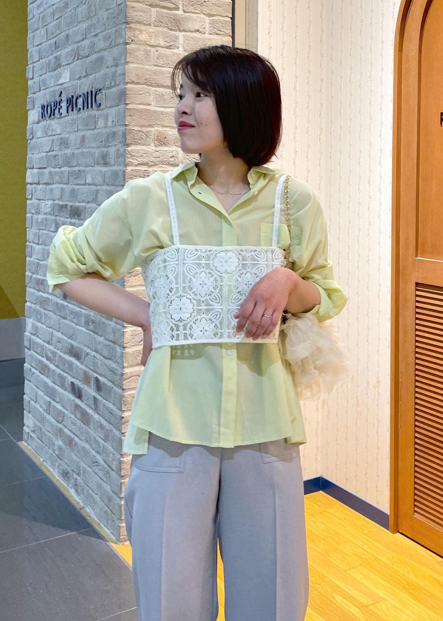 春夏に着たくなる爽やかなイエローのシャツにレースのビスチェを合わせて、女性らしさもあるカジュアルコーデです!