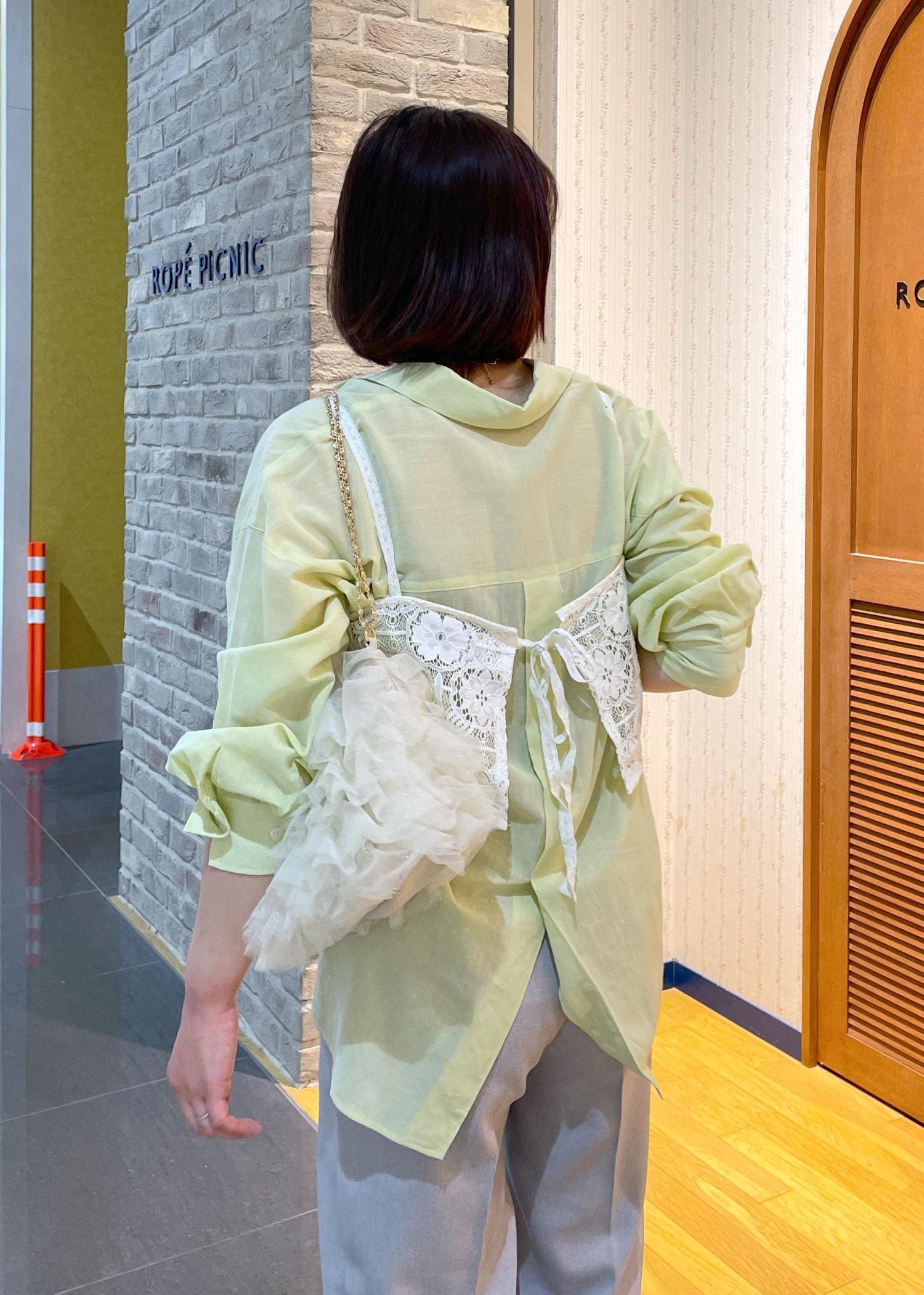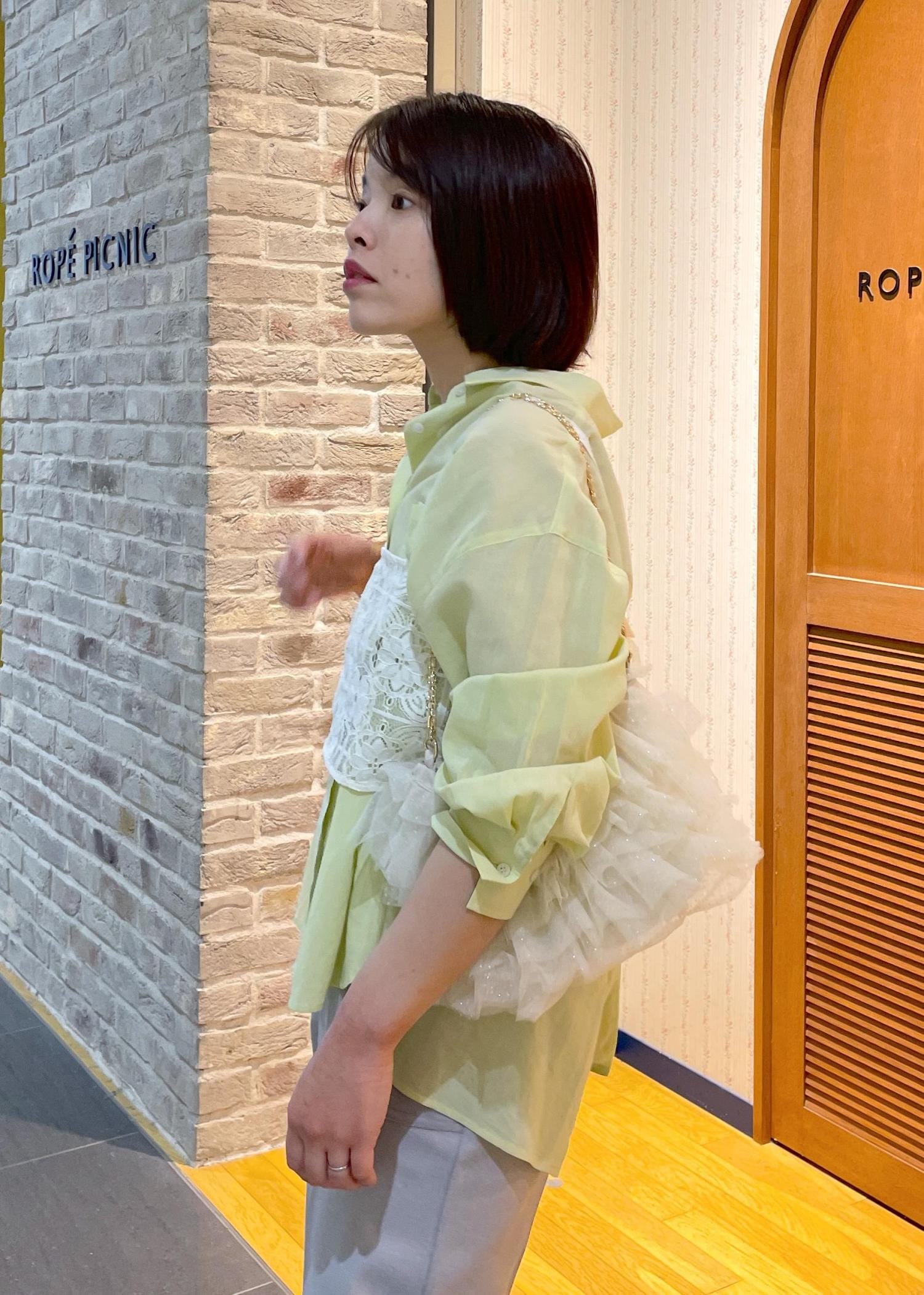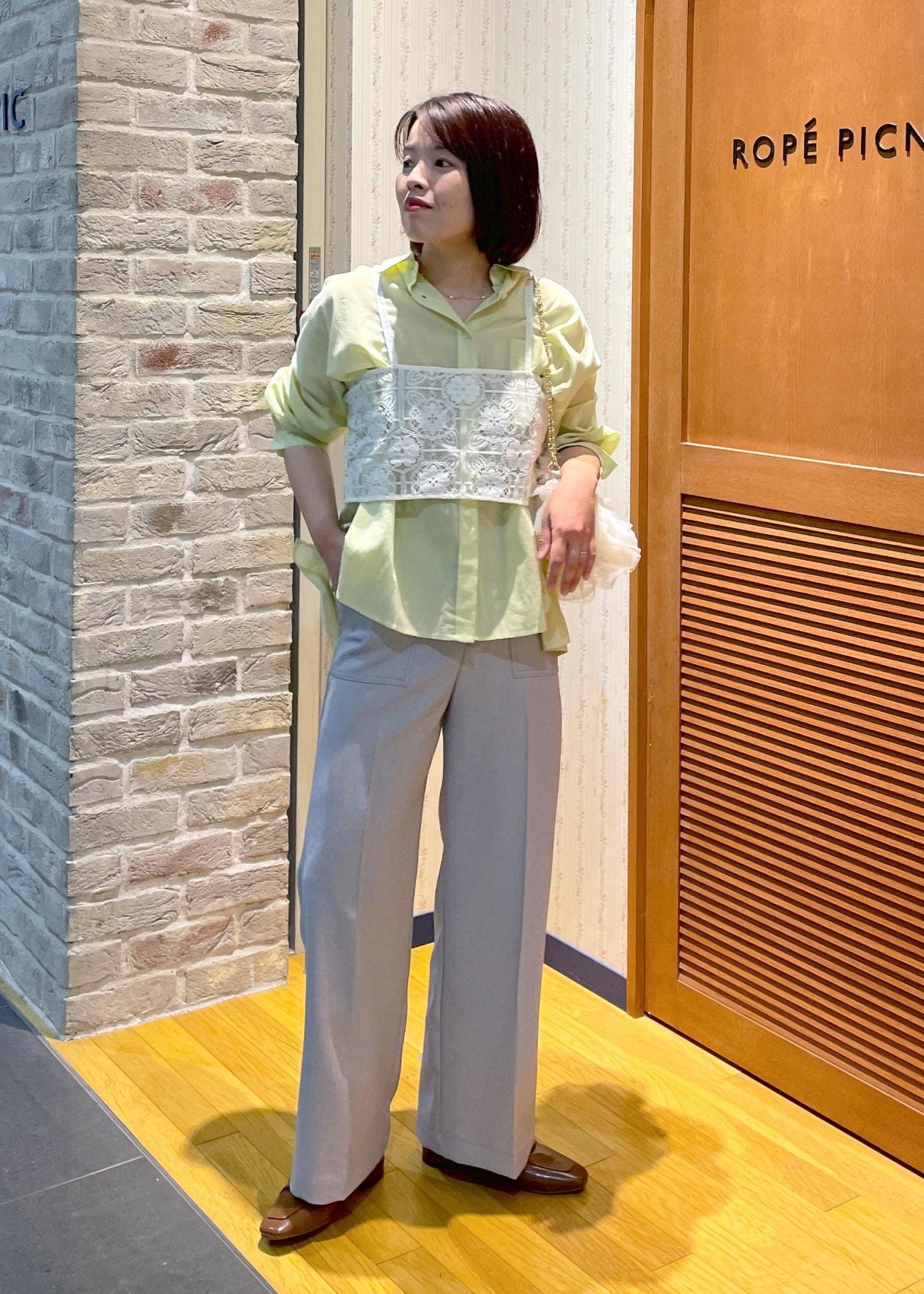 春夏に着たくなる爽やかなイエローのシャツにレースのビスチェを合わせて、女性らしさもあるカジュアルコーデです!