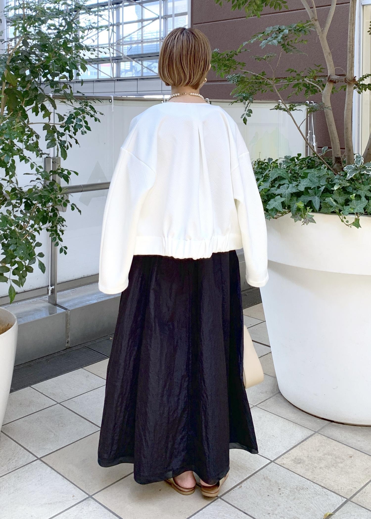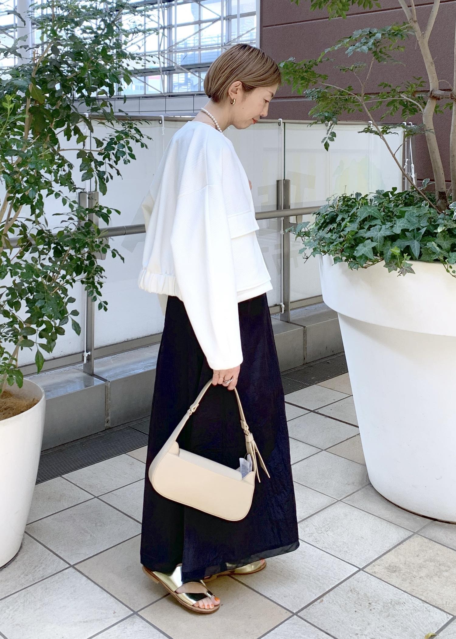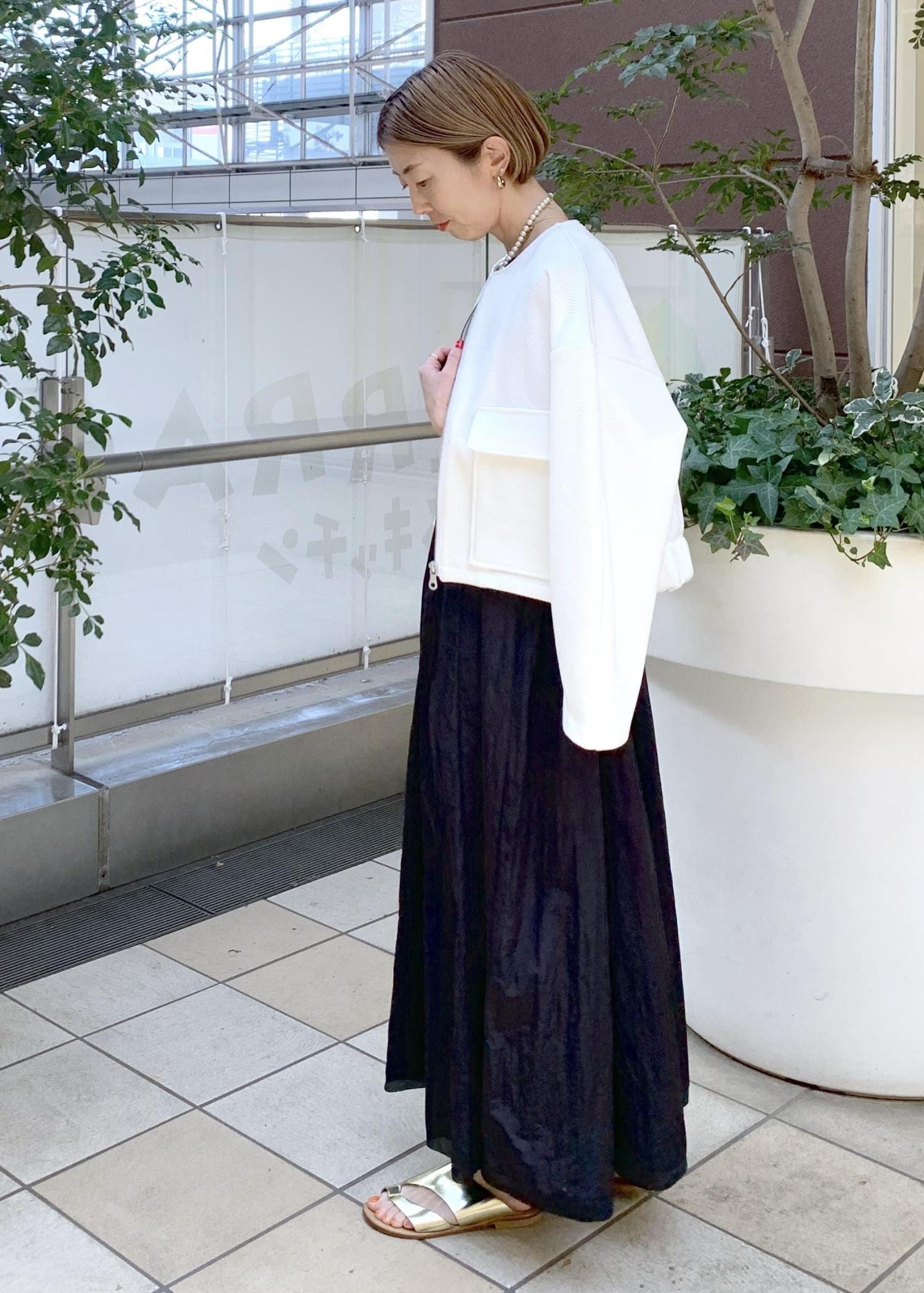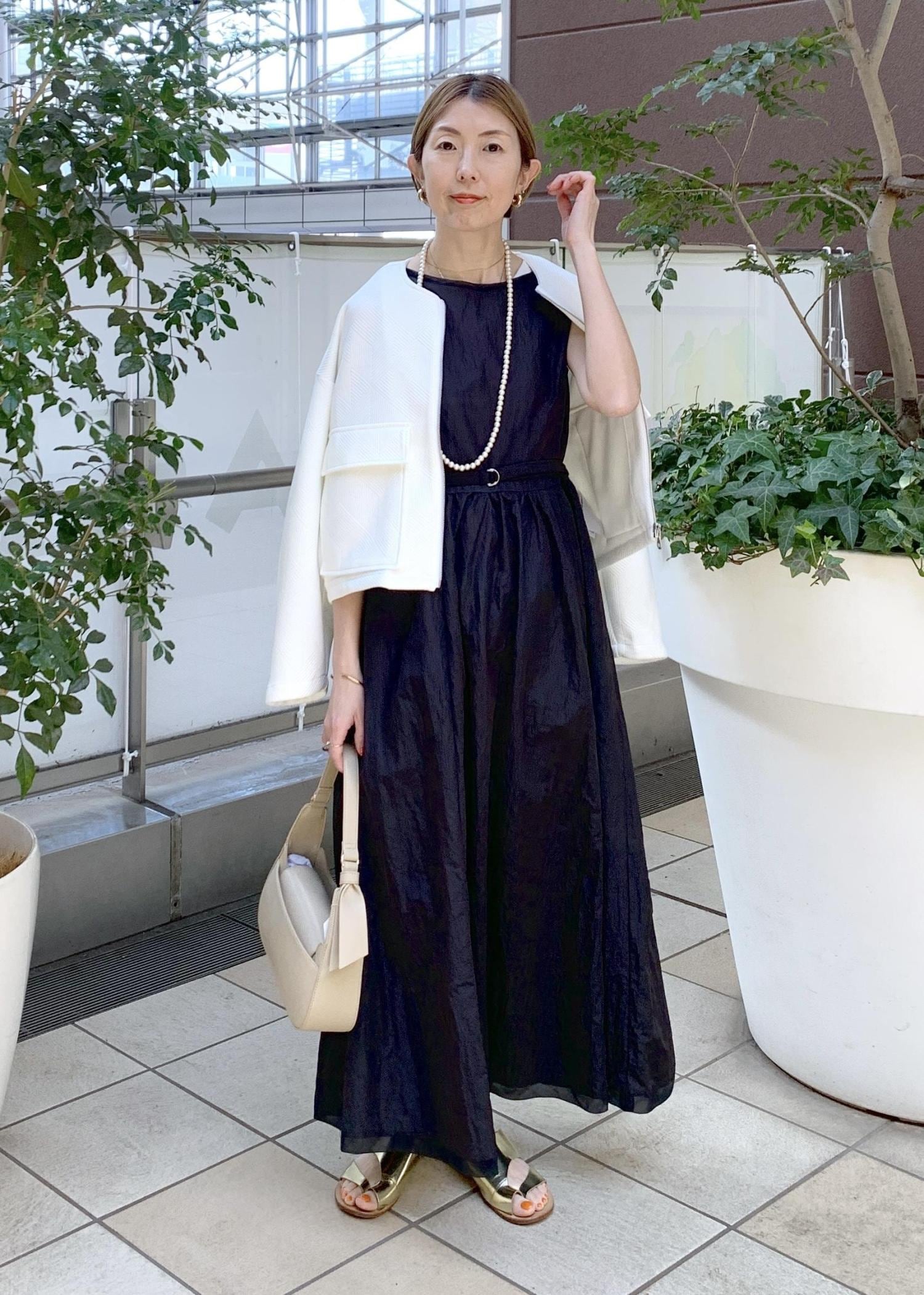 シンプルなブラックのワンピースにホワイトのブルゾンを合わせた大人のモノトーンスタイリング。
