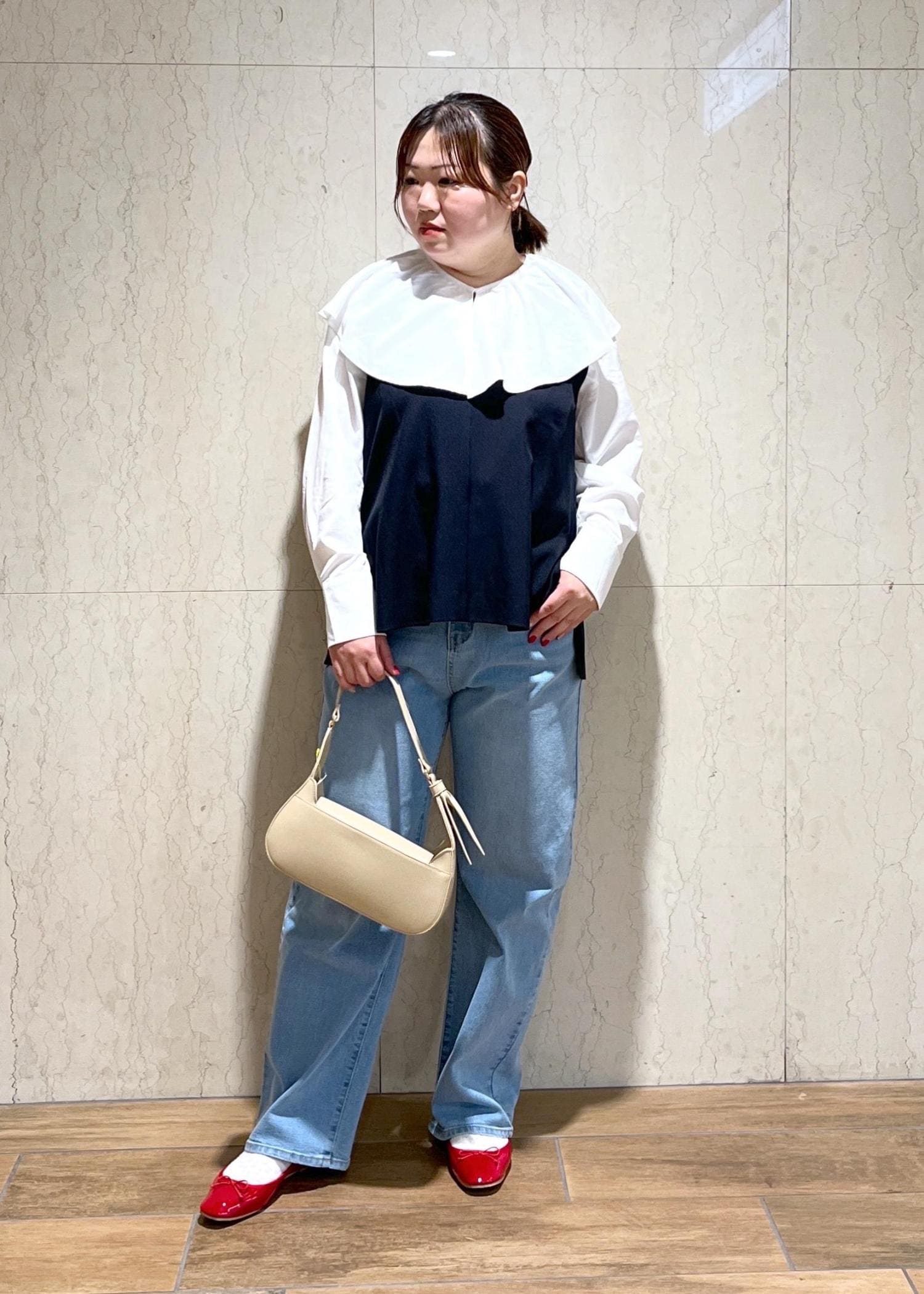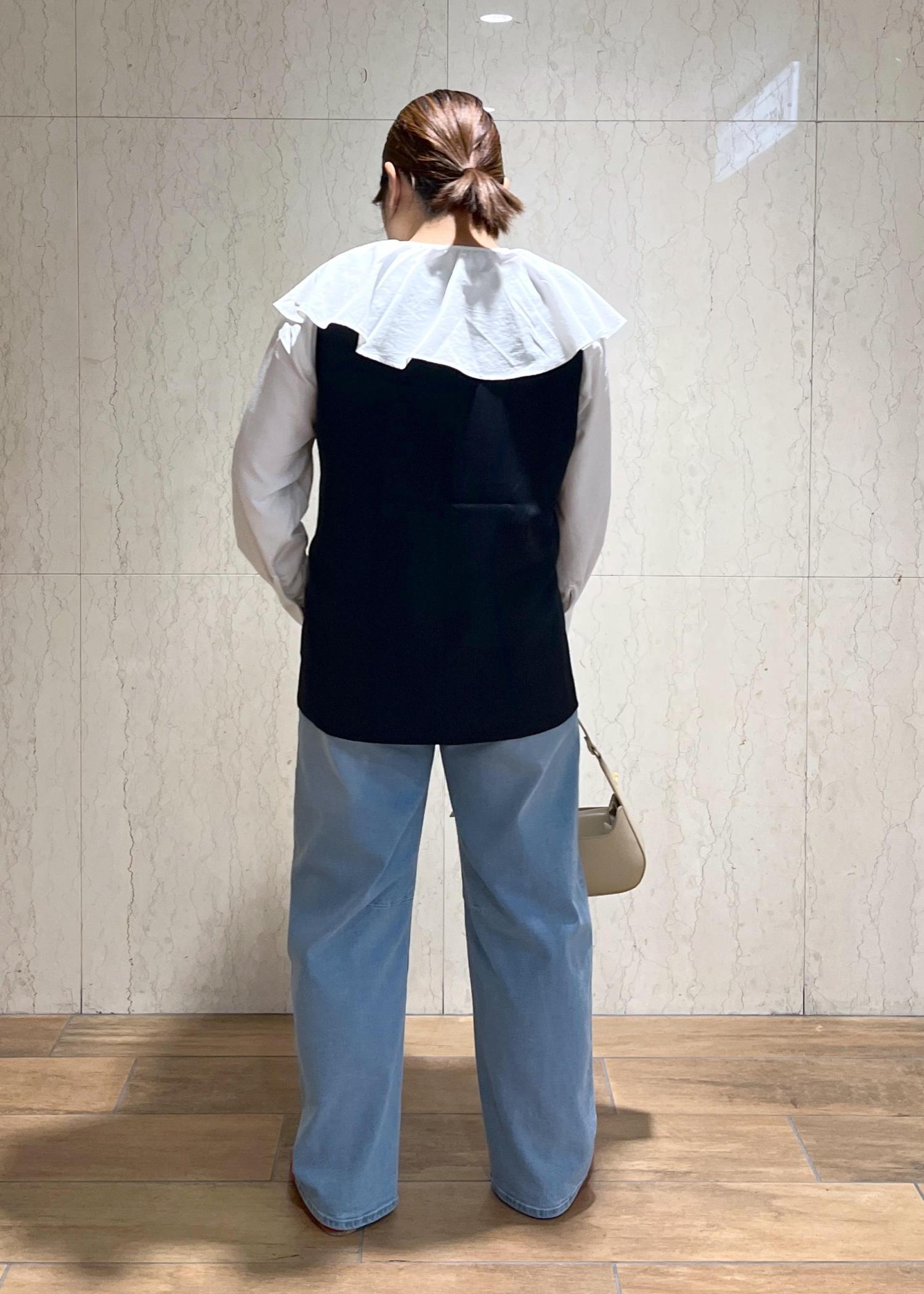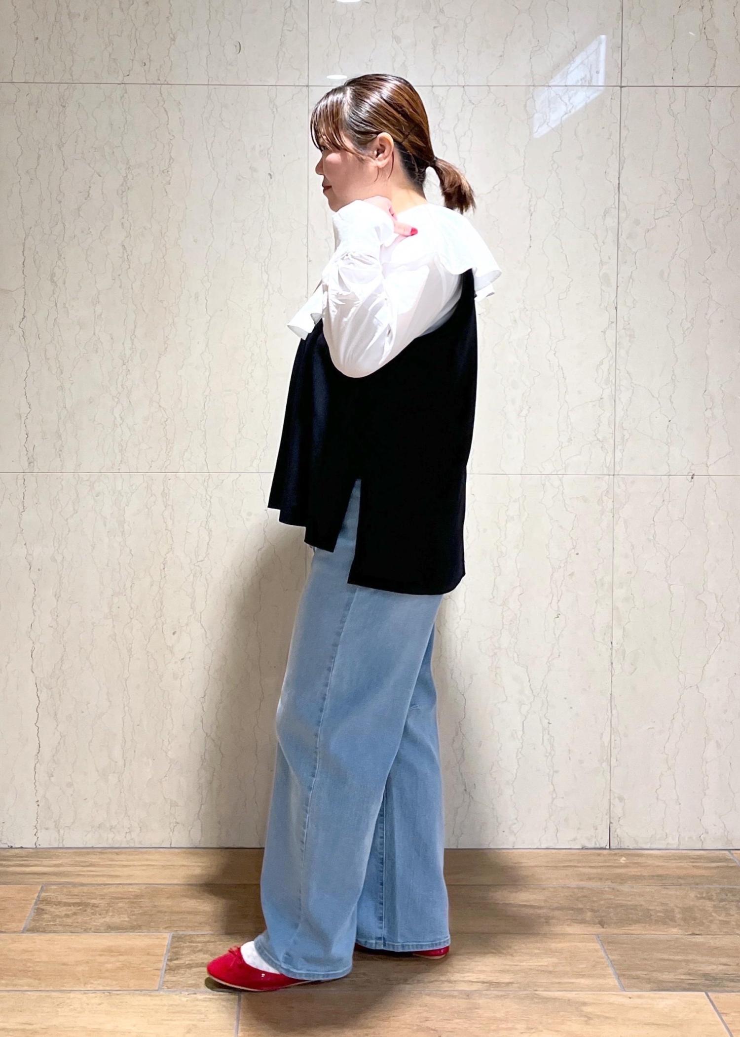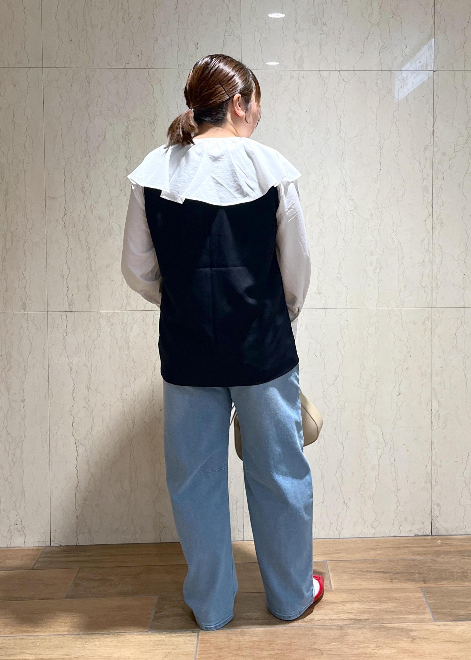顔まわりが華やかなフレアカラーブラウスにデニムを合わせた春におすすめコーディネートです♪