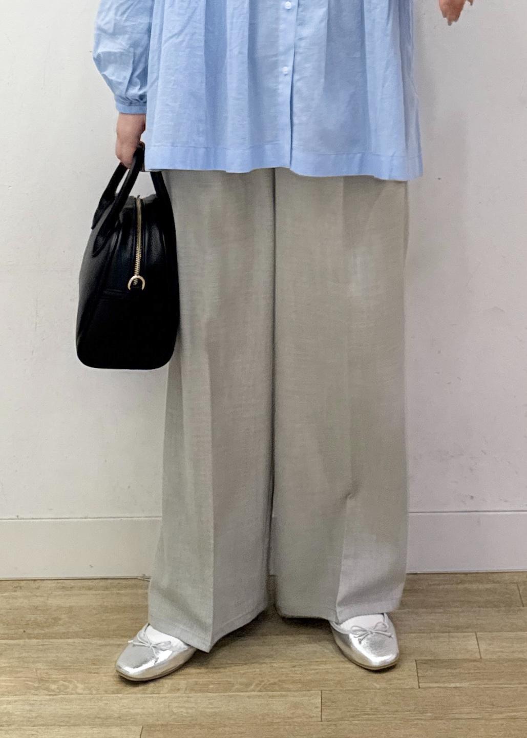 広がり過ぎないストレートめなワイドパンツはセンターライン入りとハイウエストなデザインでスッキリ見えするシルエットになります。 -