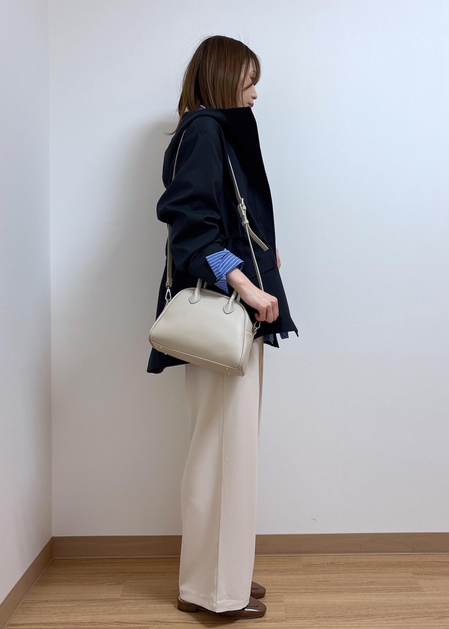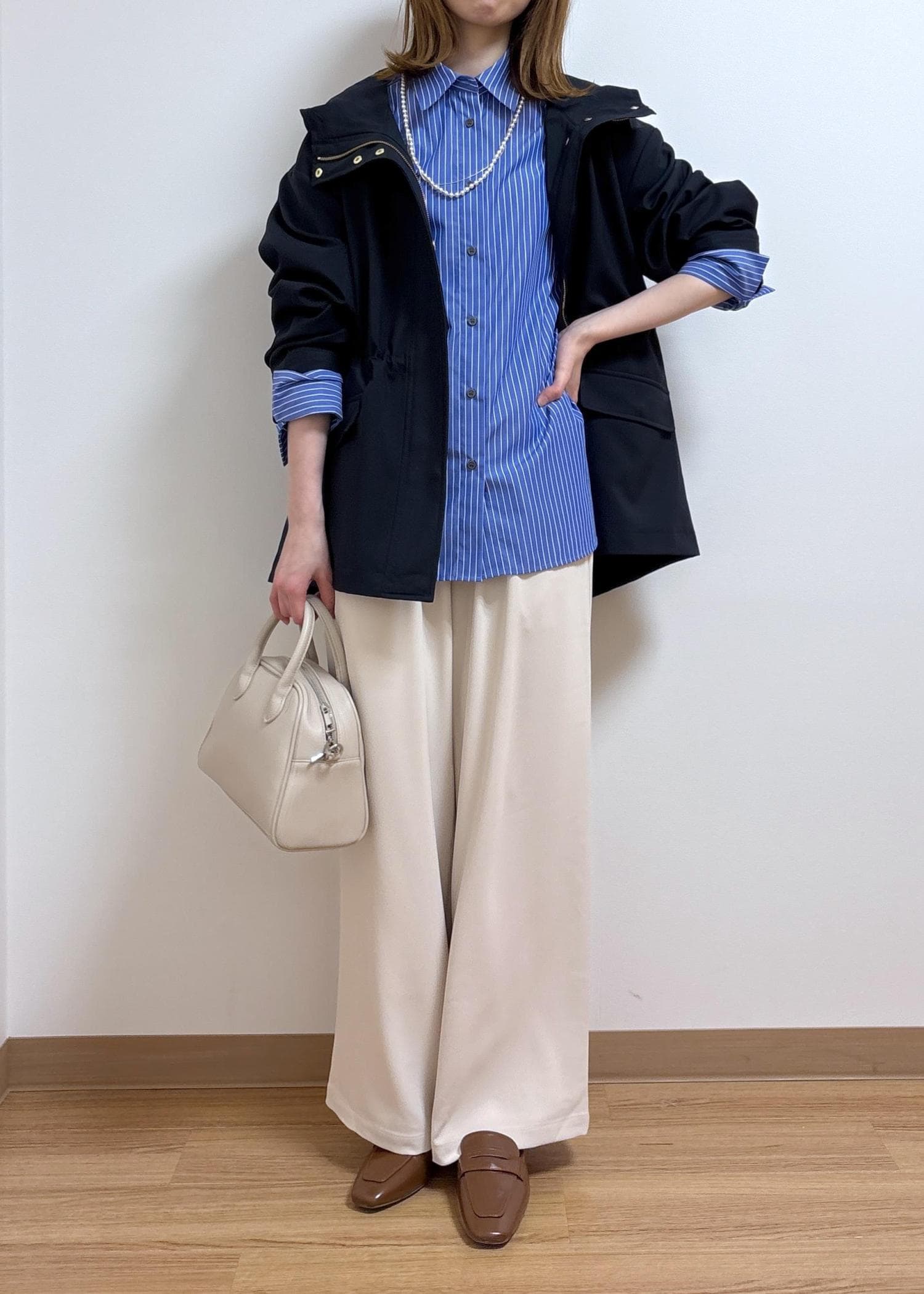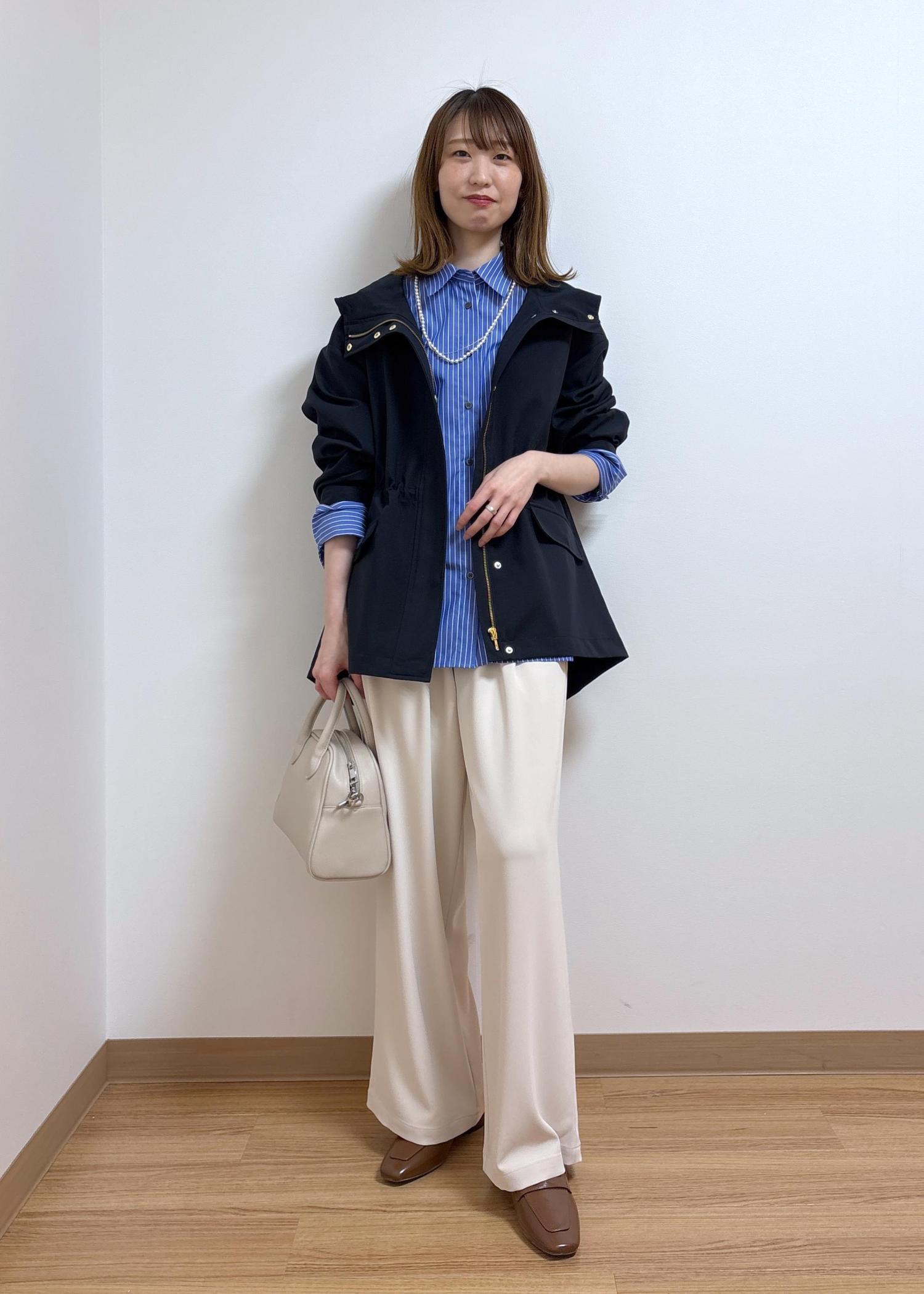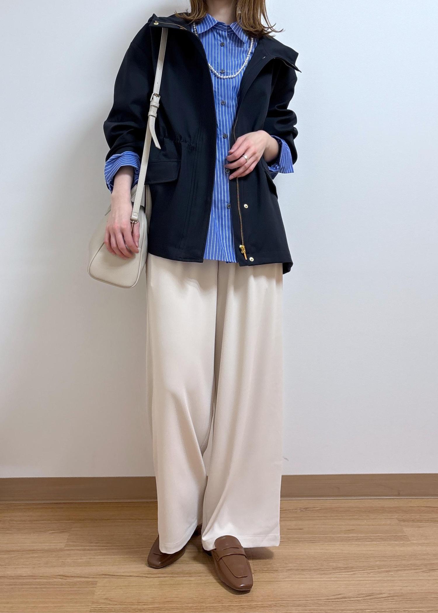 落ち着いたカラーのアウターなので、インナーは差し色になるブルーのシャツを合わせました。