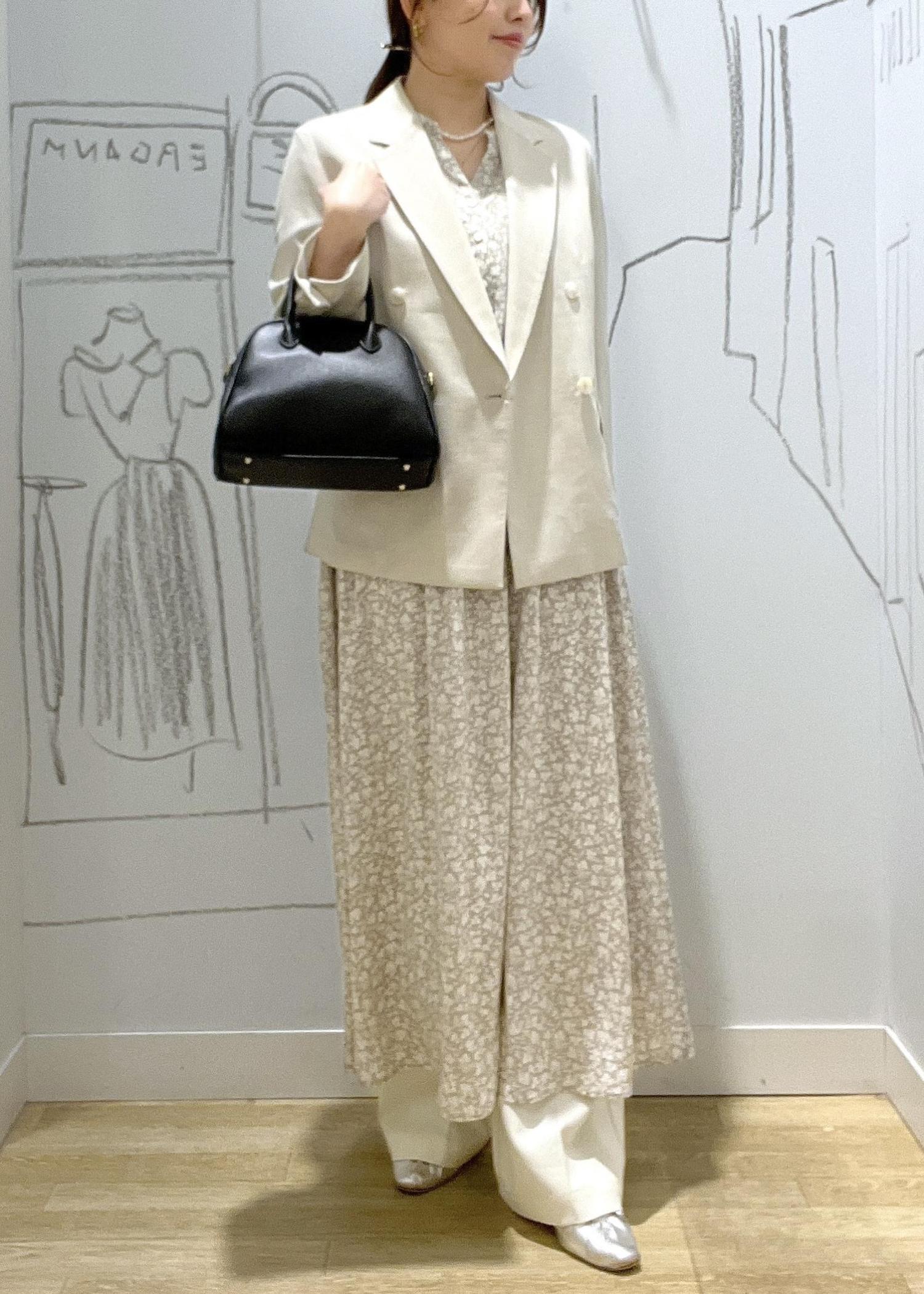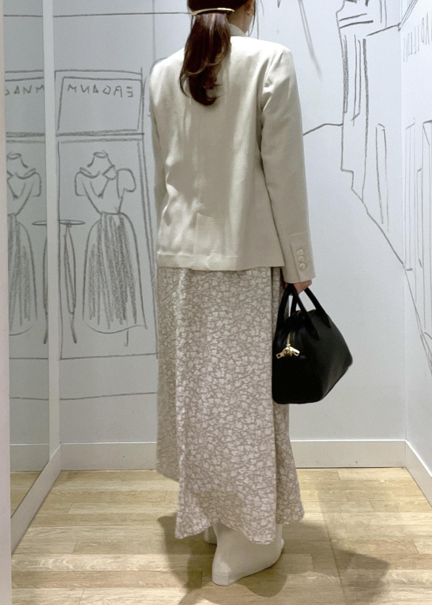 ベージュの小花柄ワンピースに、ベージュのジャケットを羽織りワントーンコーデにしてみました。