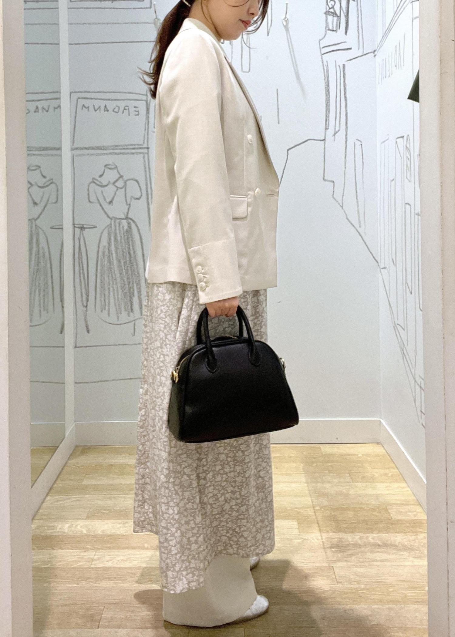 色を統一したことにより全体的に柔らかい雰囲気になるので、バッグは黒にして引き締めました。