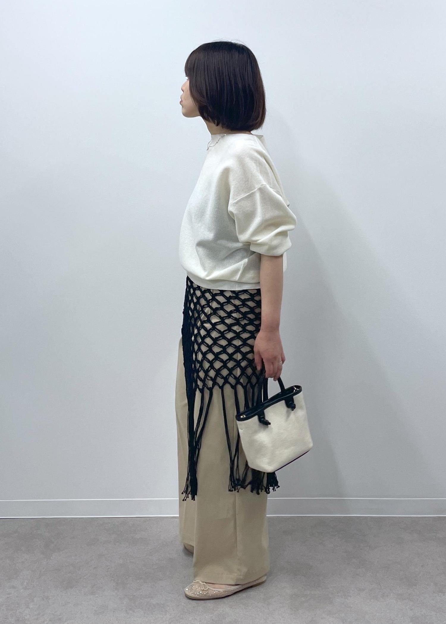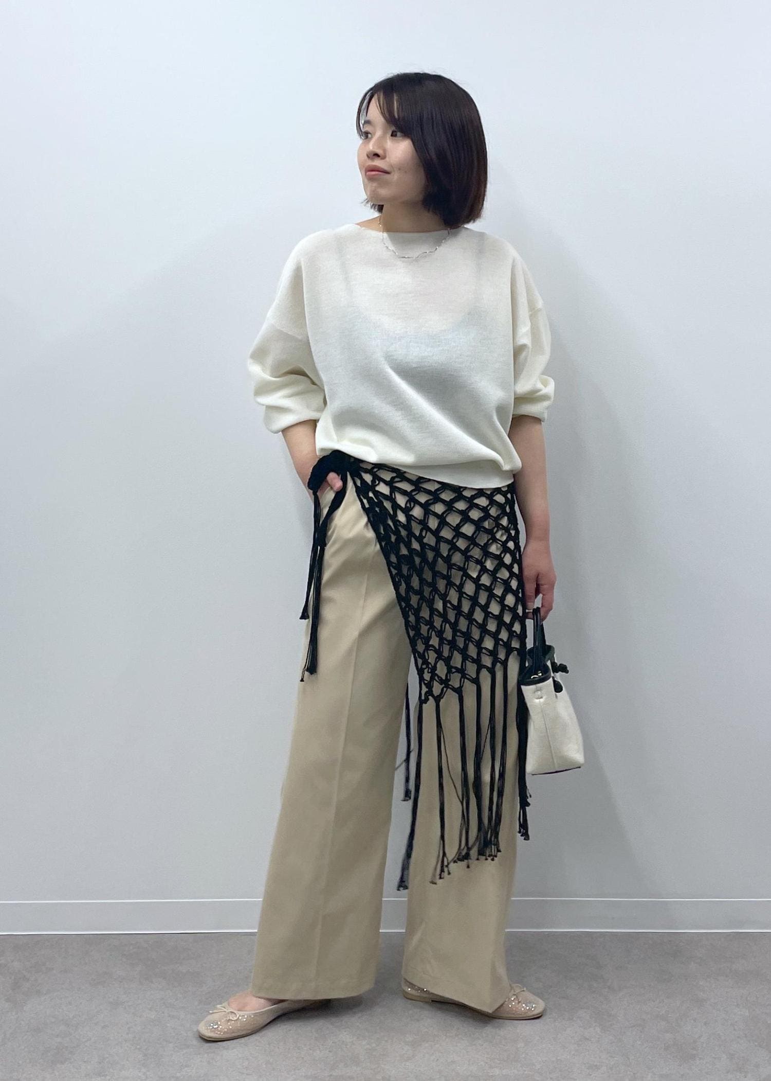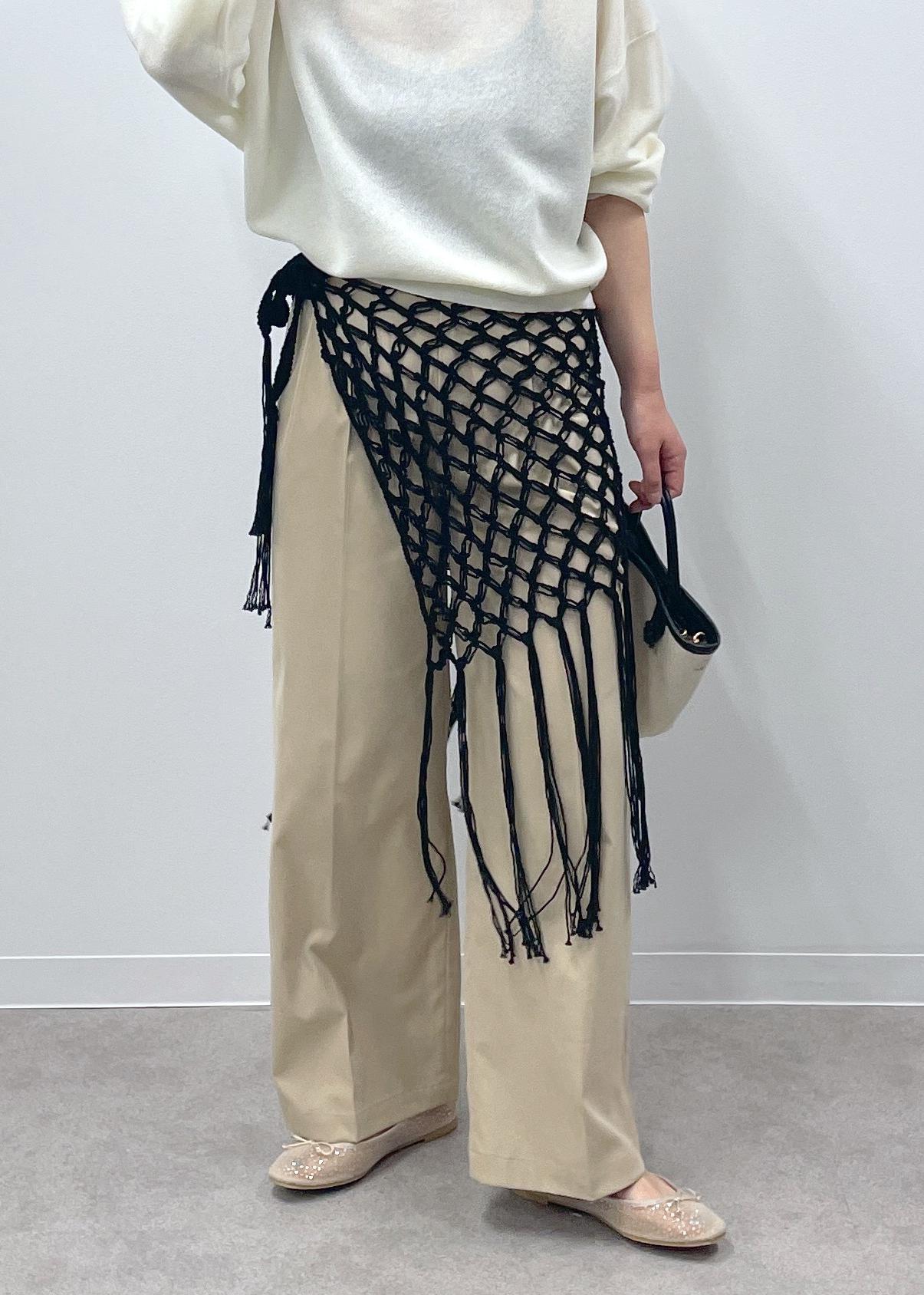 シンプルなチノライクパンツにかぎ針の巻きスカートを合わせた、トレンド感あるカジュアルスタイルです。