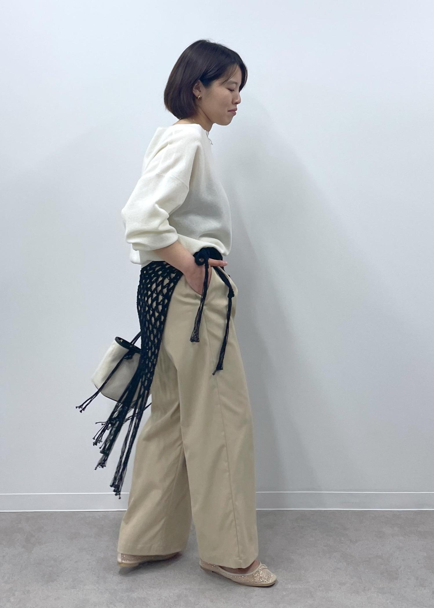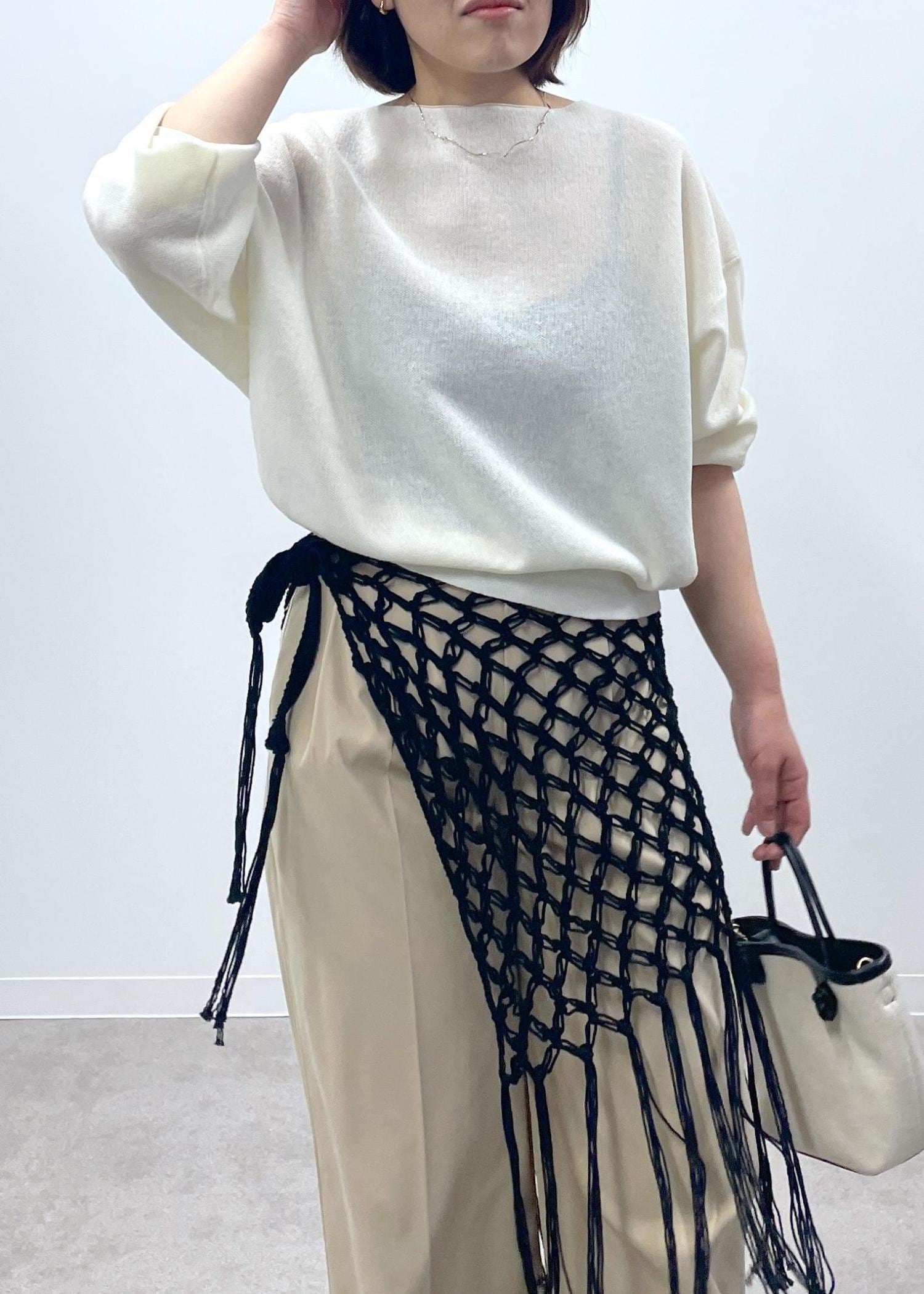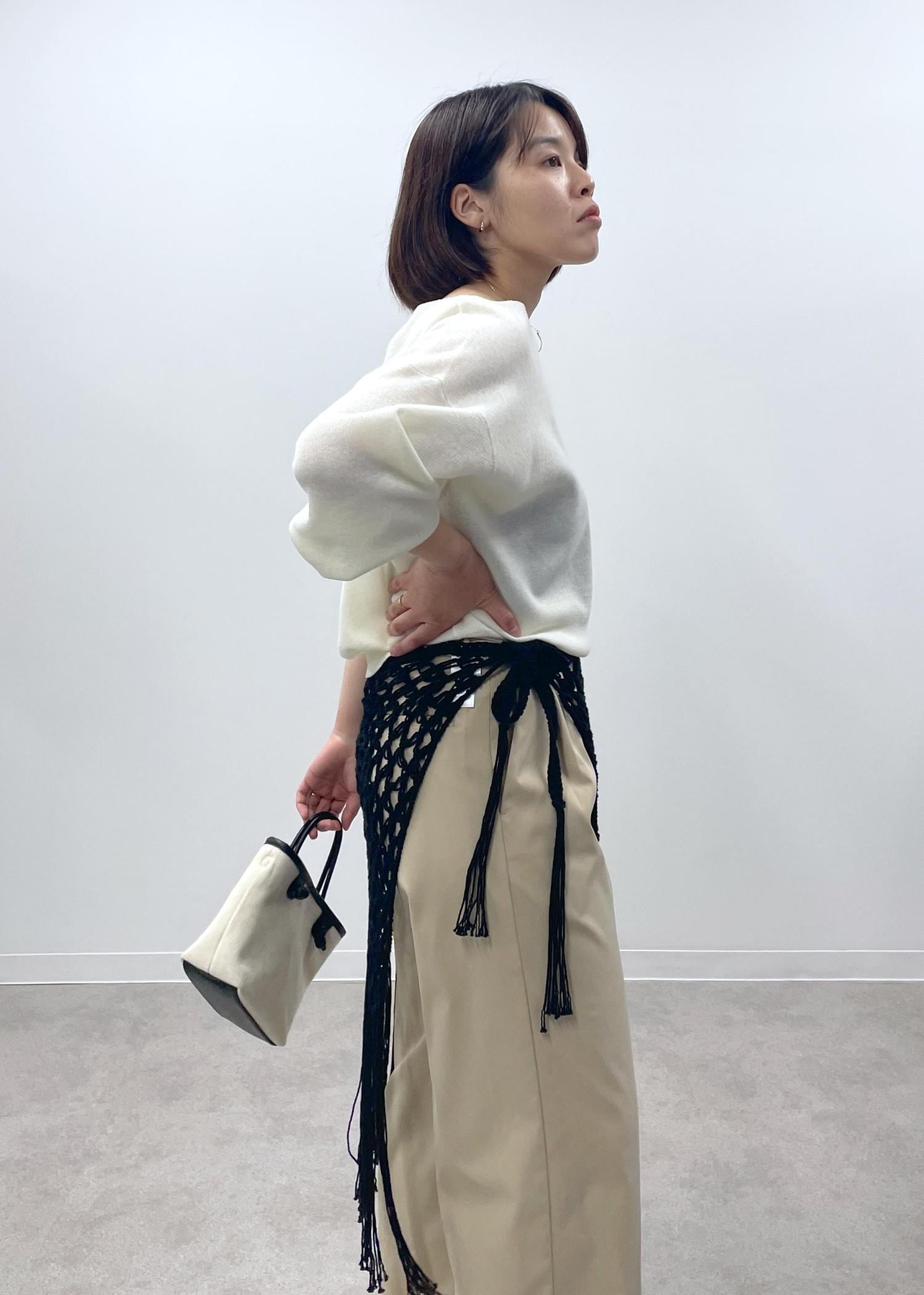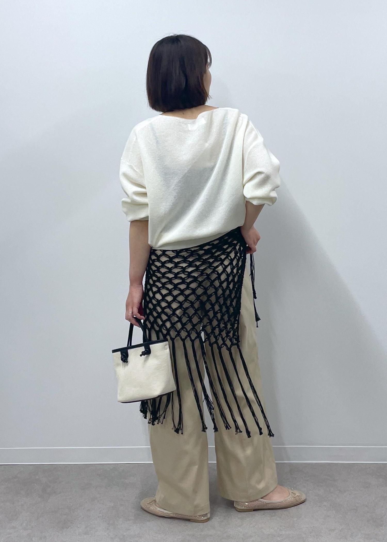 シンプルなチノライクパンツにかぎ針の巻きスカートを合わせた、トレンド感あるカジュアルスタイルです。