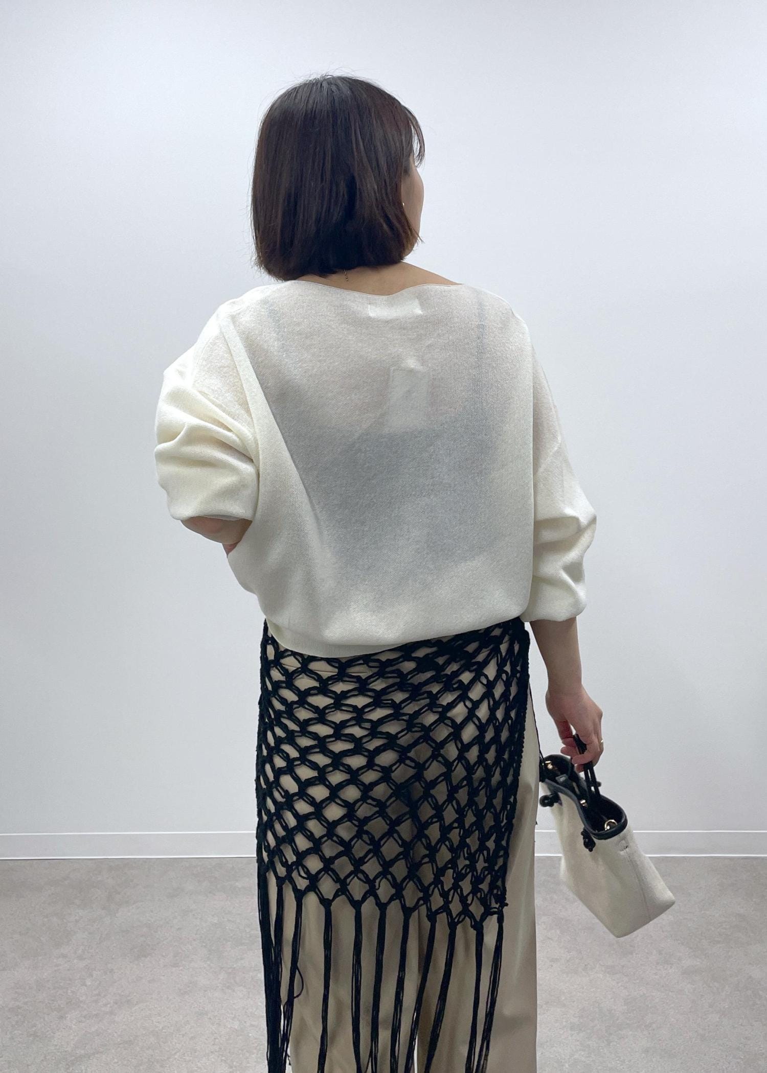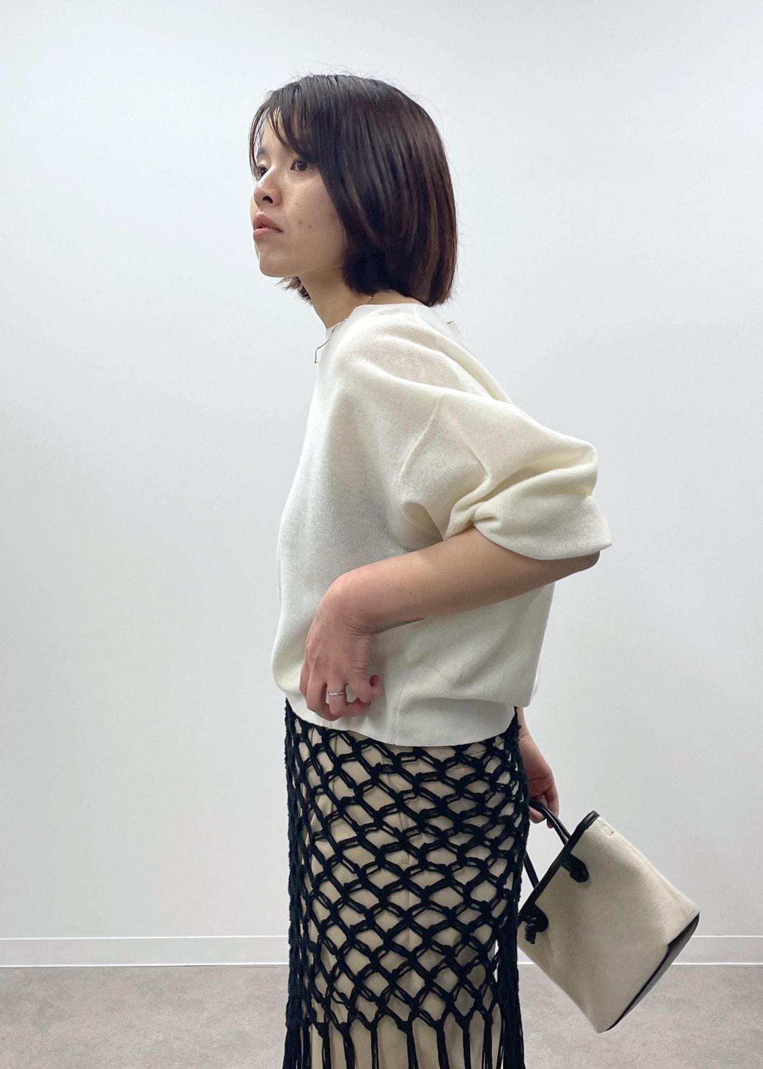 トップスは軽やかなラメニットを合わせて、ナチュラルで爽やかな雰囲気に◎