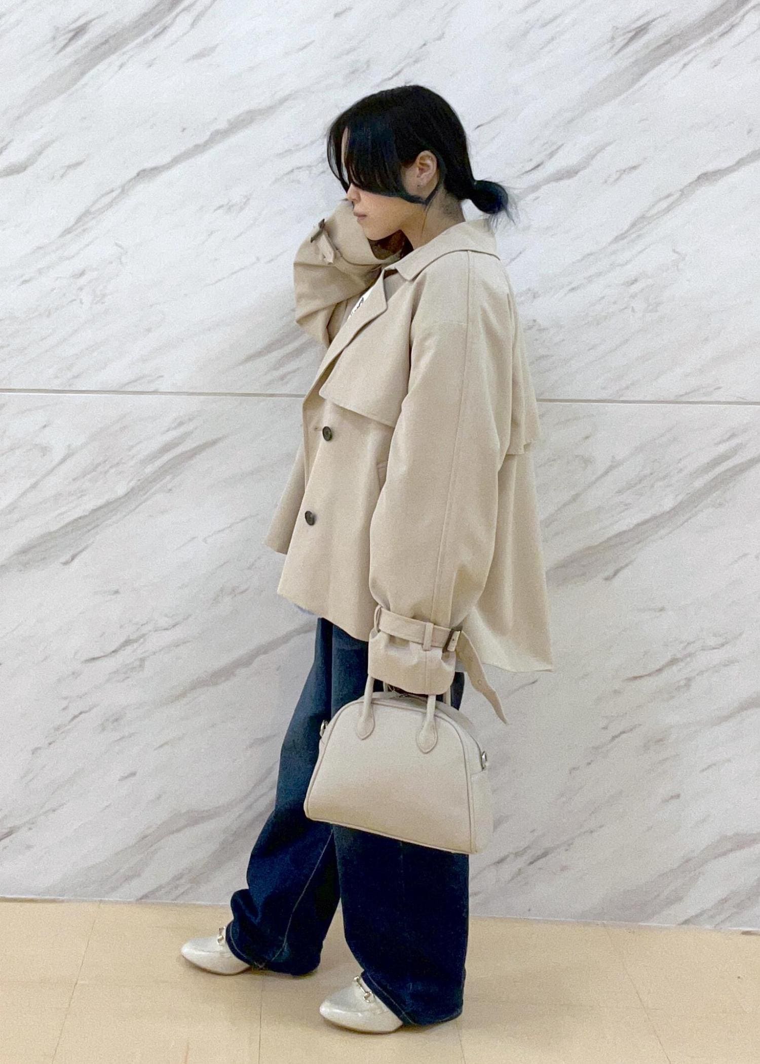 ショート丈のトレンチコートとスウェットニットでカジュアルさもありながら足元のローファーで綺麗め要素も入れたコーデにしました!