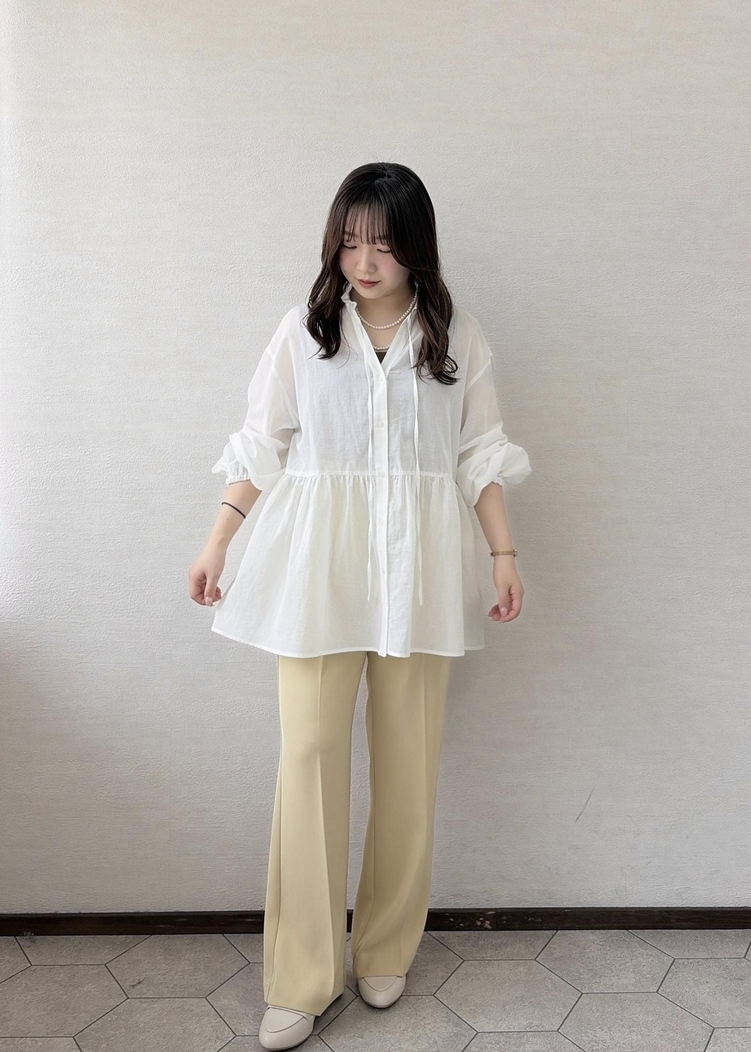 程よくワイドシルエットです。着丈もしっかりとあります。 -