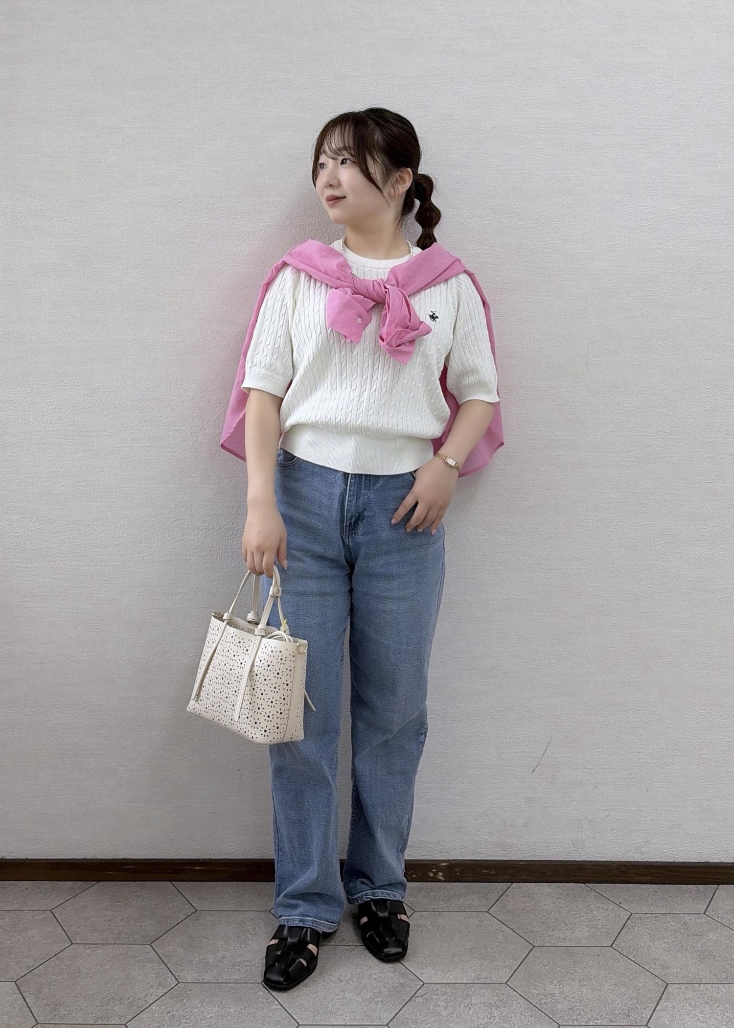 春らしいパステルカラーのニットを使ったコーデ。