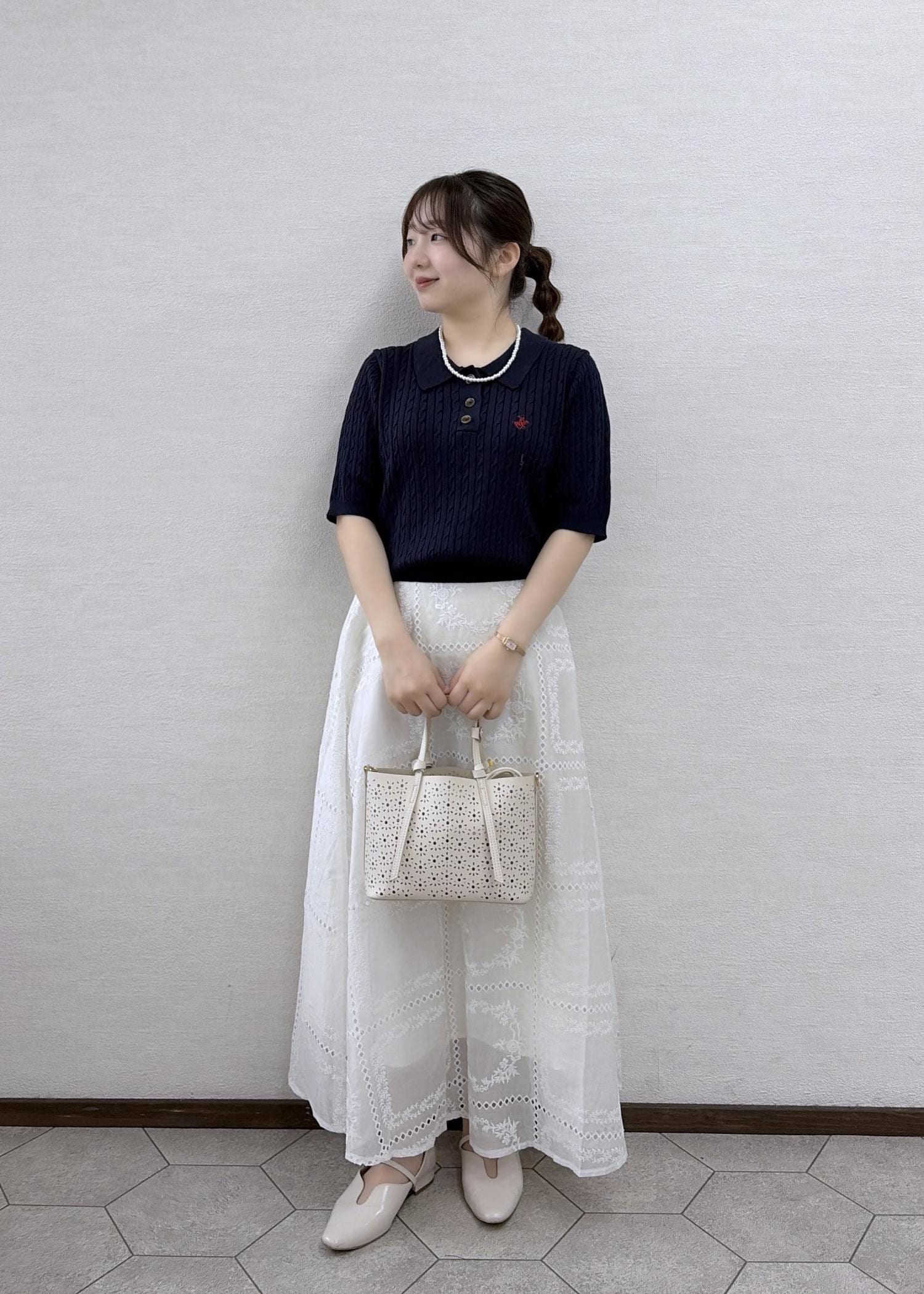 パンツは締め色のネイビーで大人っぽく仕上げました。