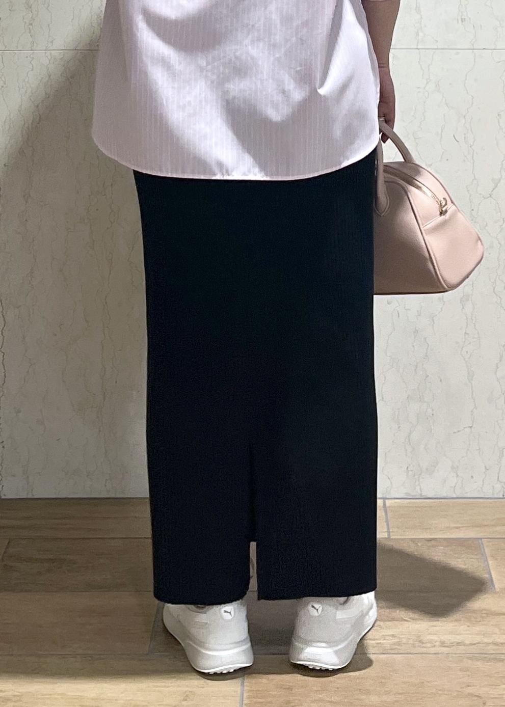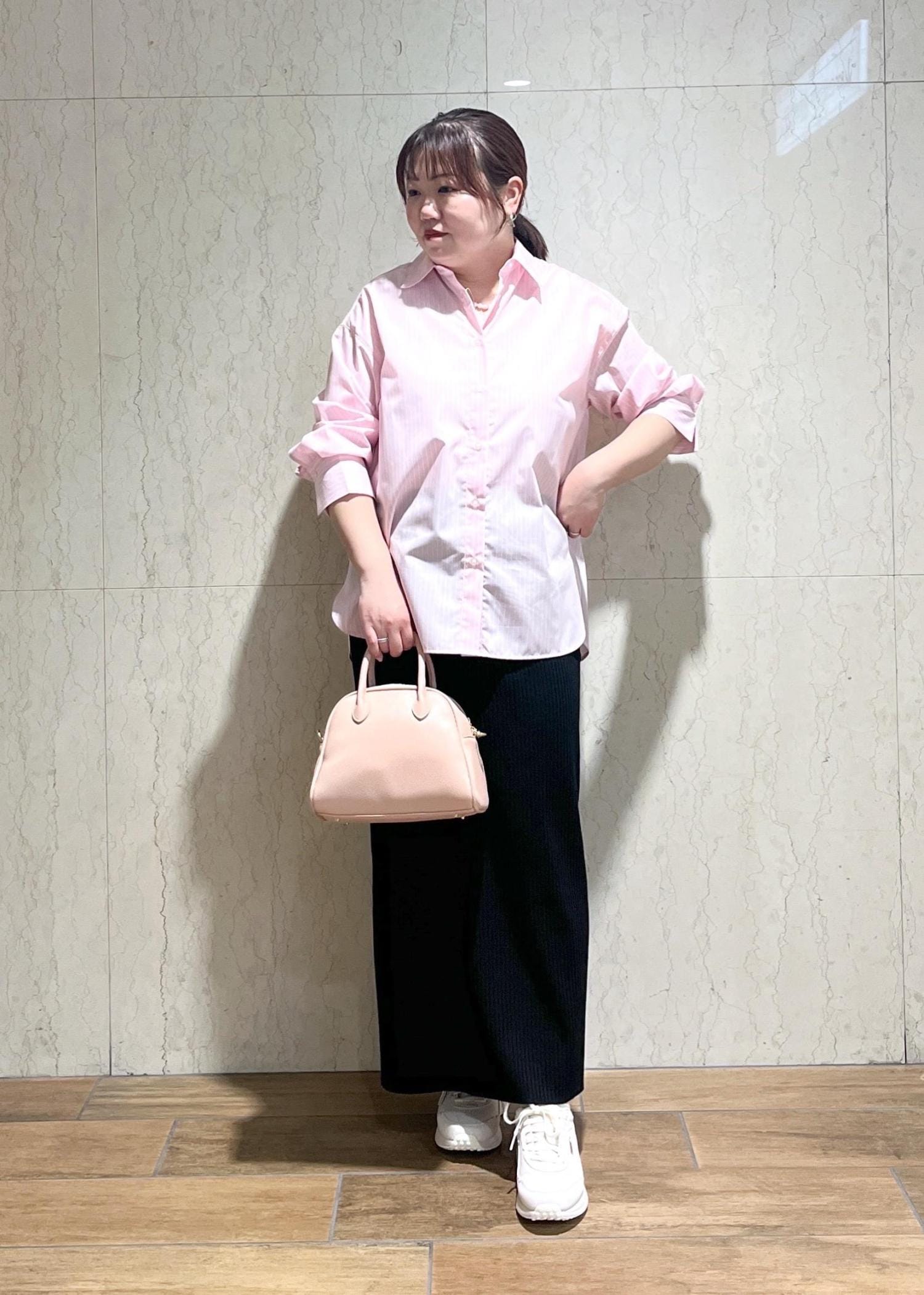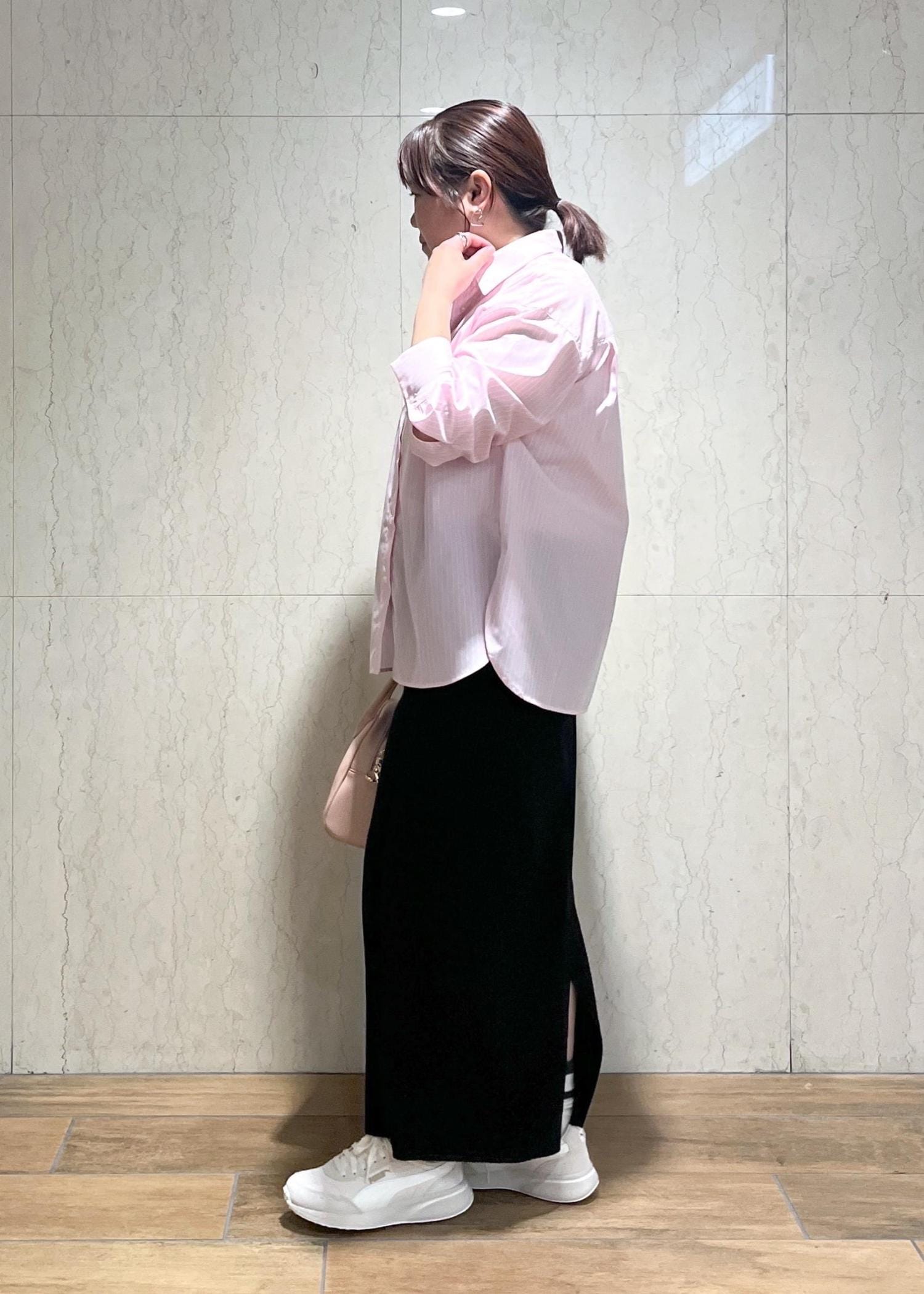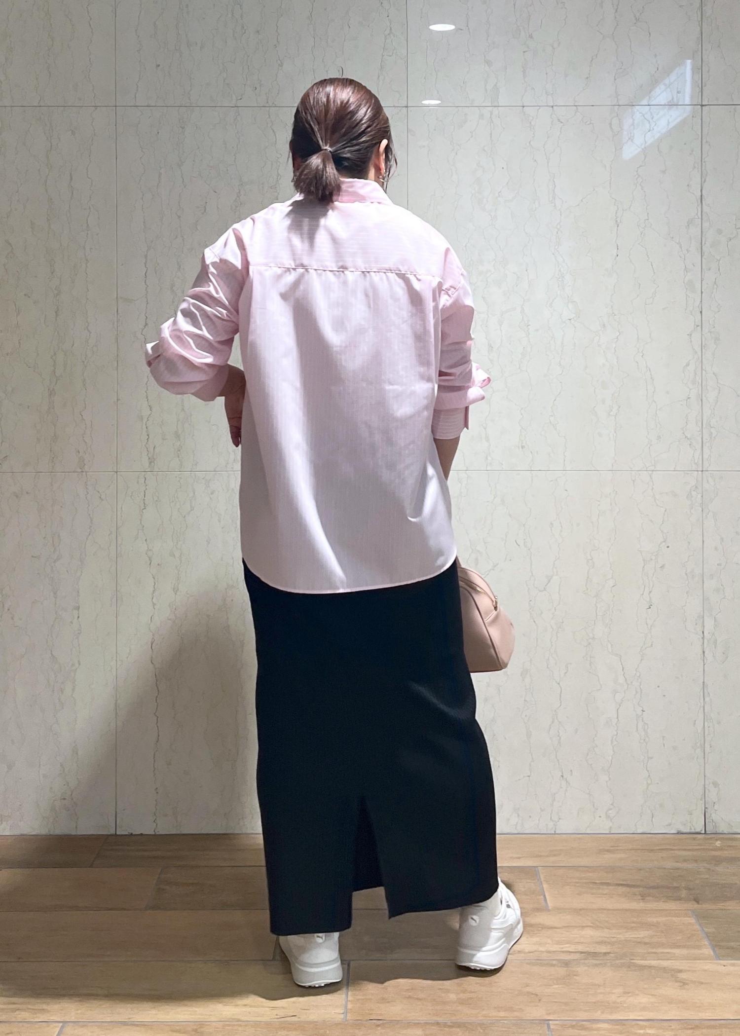 ピンクのストライプシャツに黒のアイラインスカートを合わせた春らしい大人カジュアルコーデです。