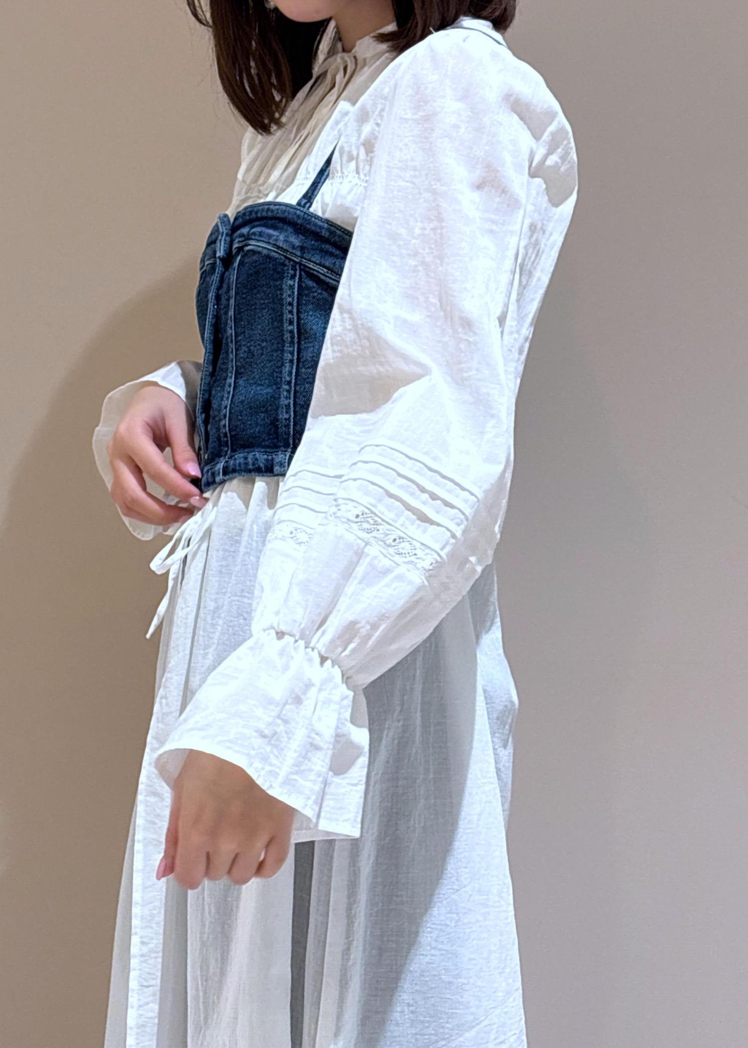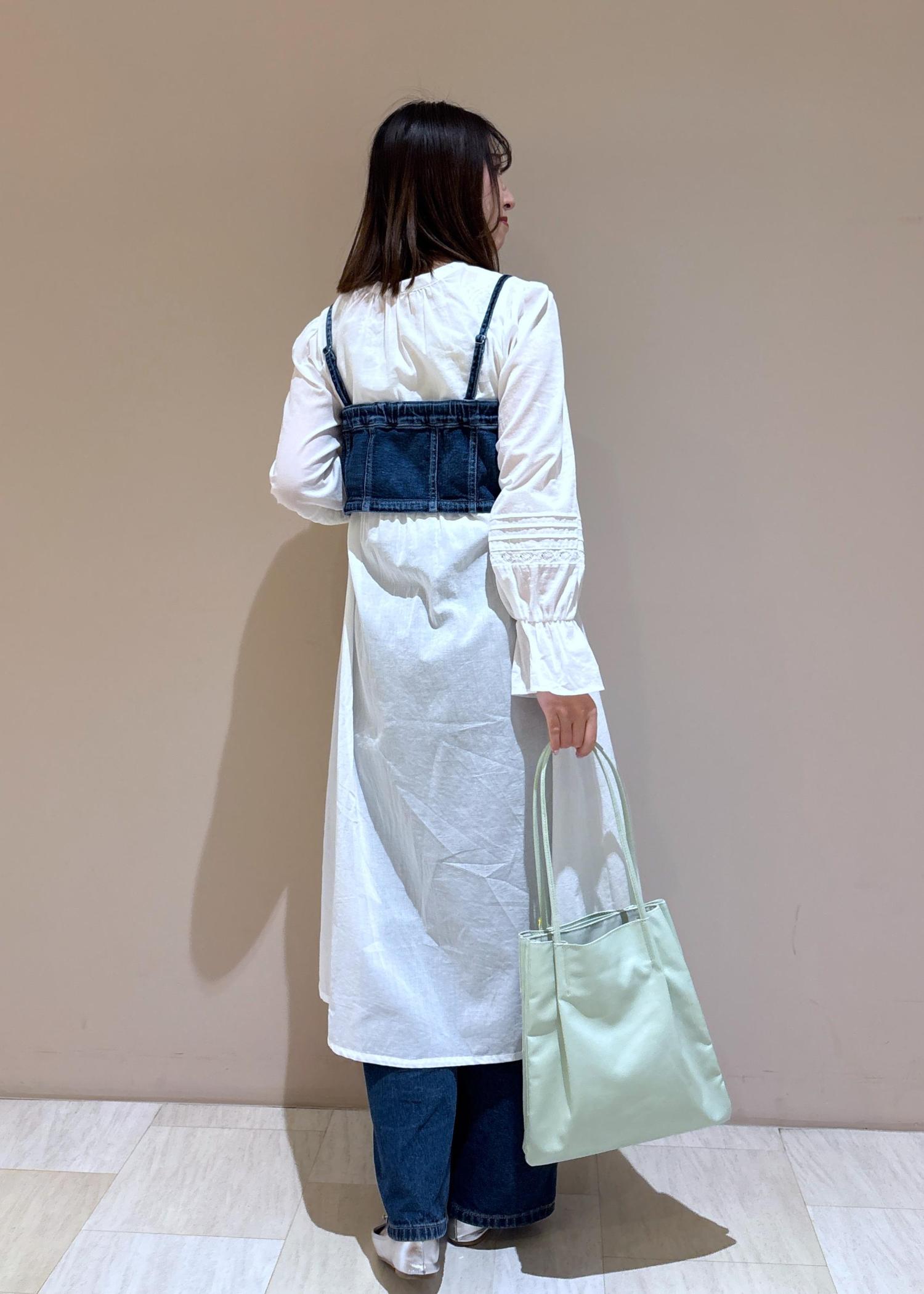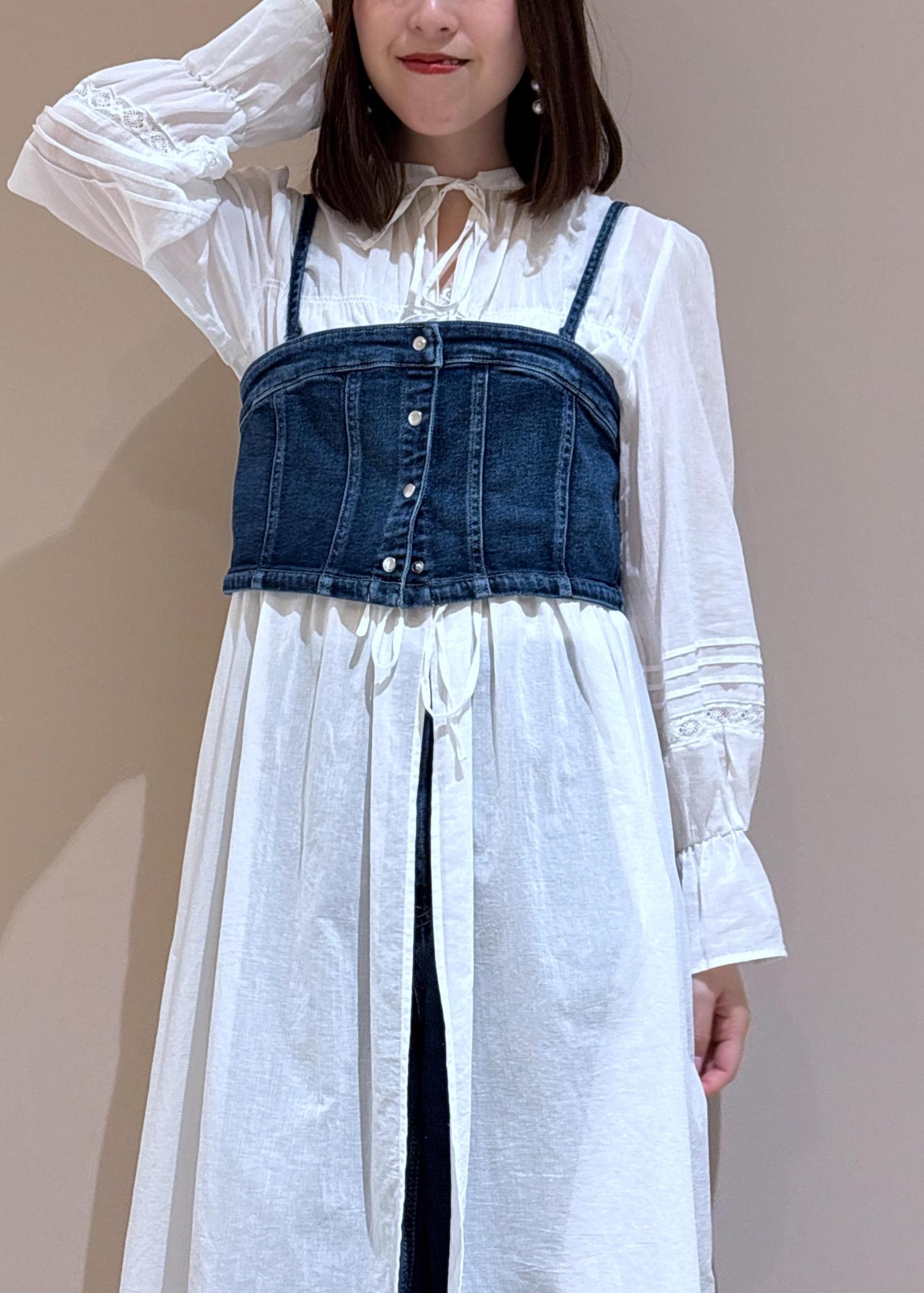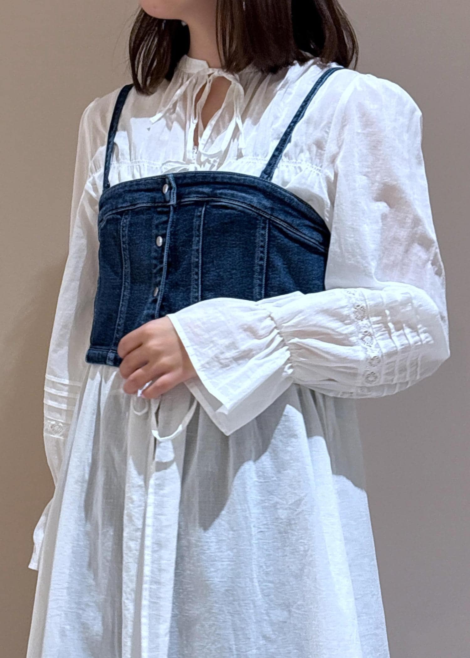あえて履いているデニムパンツと同色のデニムビスチェを合わせることで、より統一感のあるコーデに。