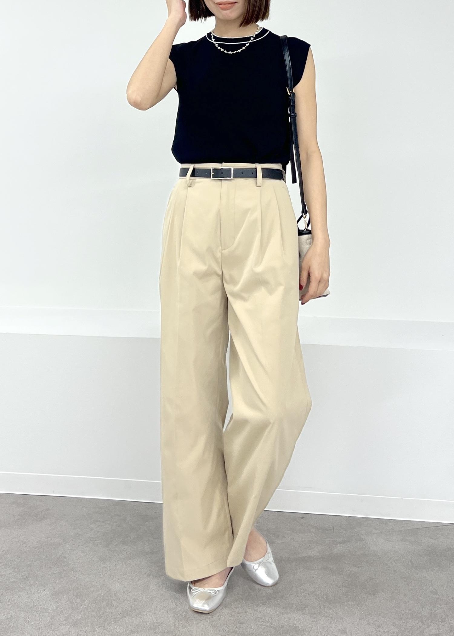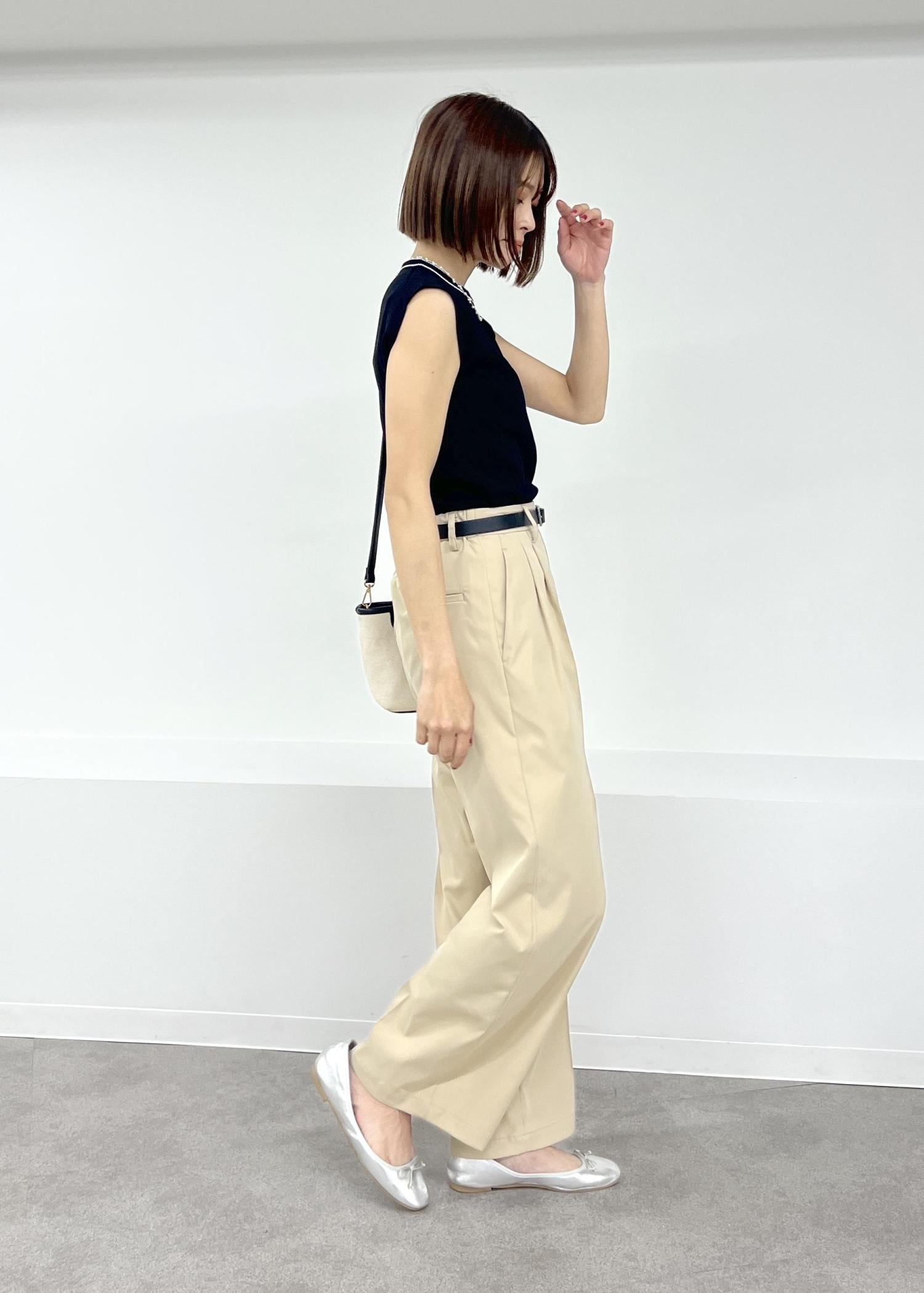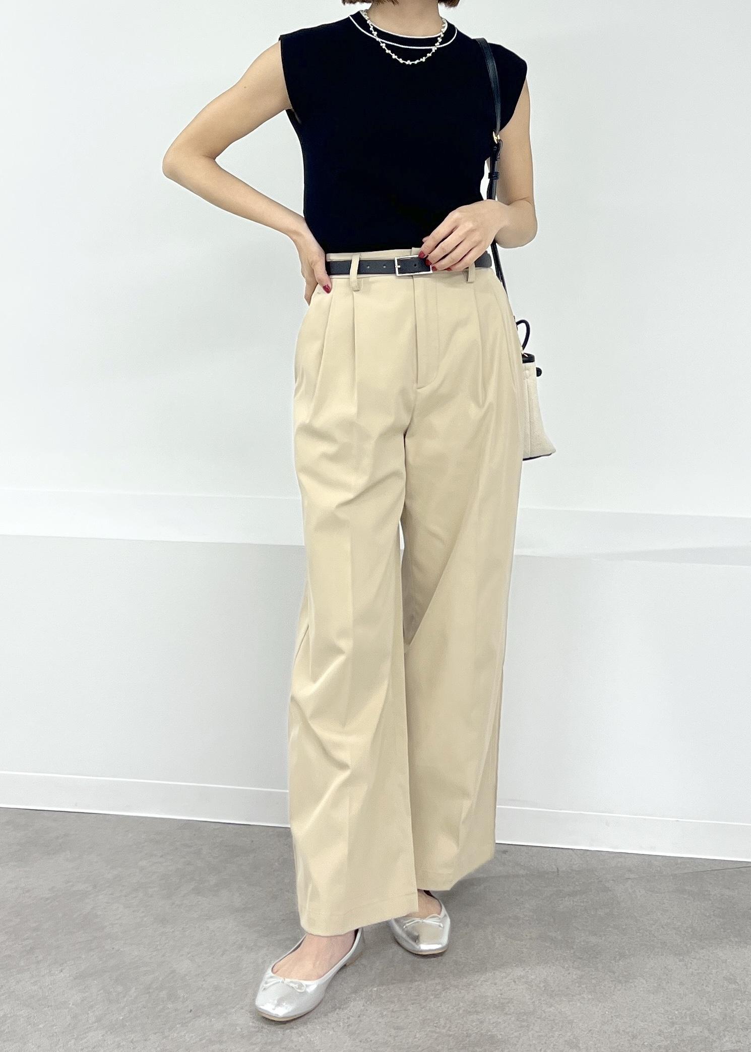 ヘルシーなノースリーブニットはタックパンツを合わせて、ハンサムな雰囲気のあるスタイルにしました。