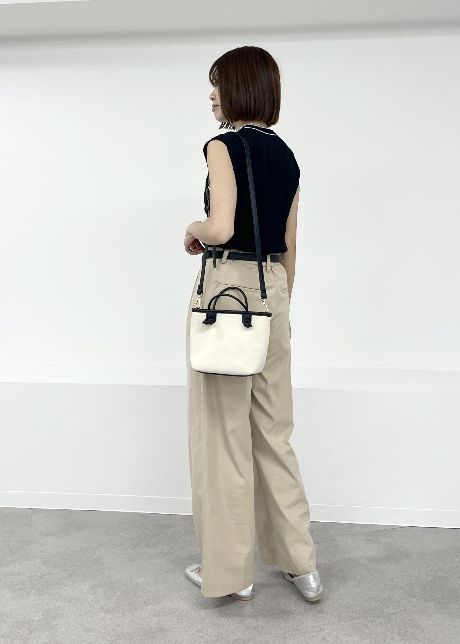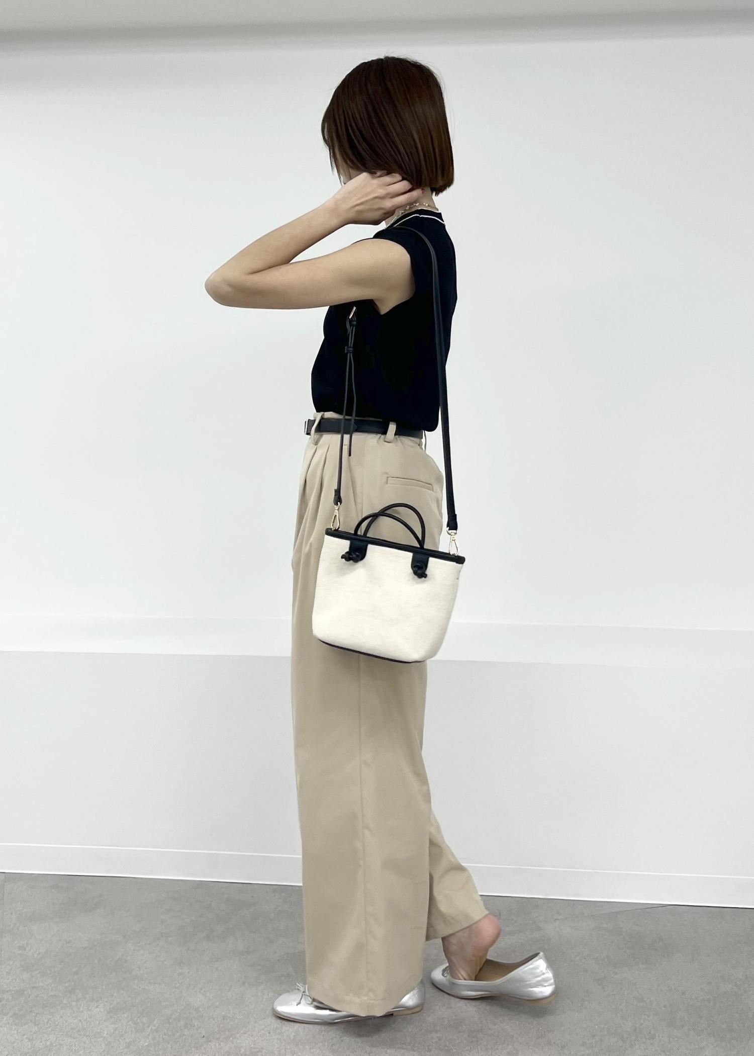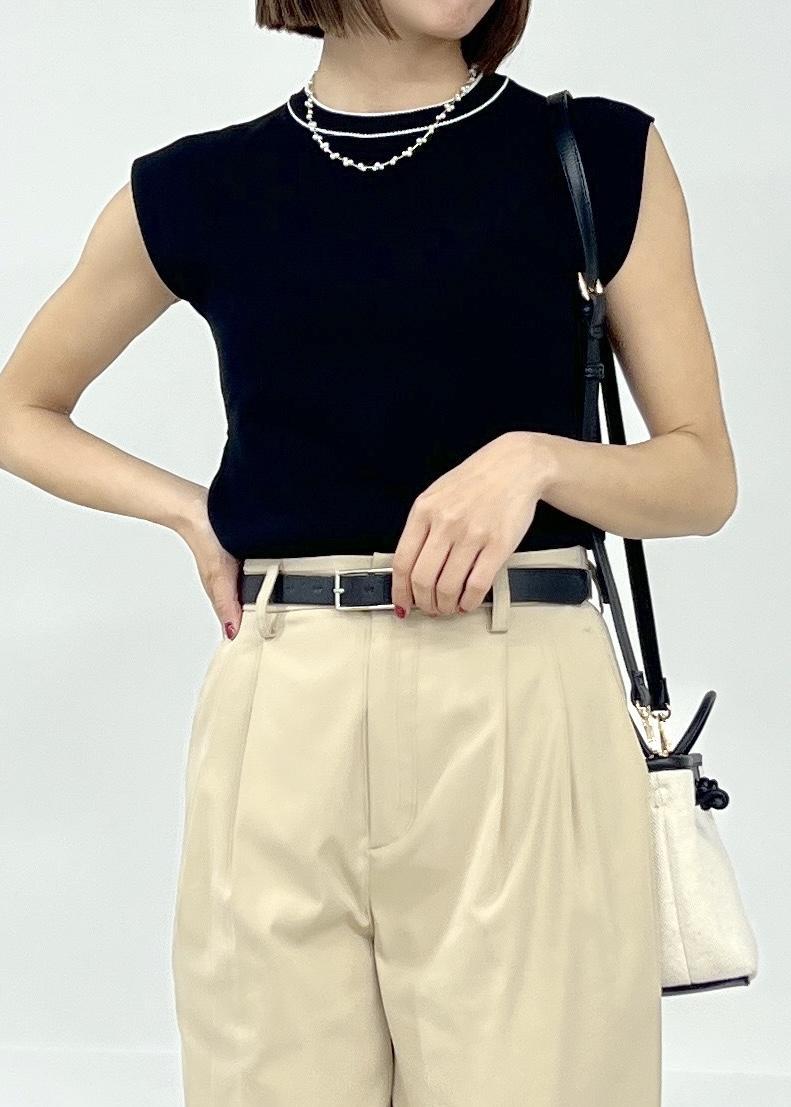 ヘルシーなノースリーブニットはタックパンツを合わせて、ハンサムな雰囲気のあるスタイルにしました。