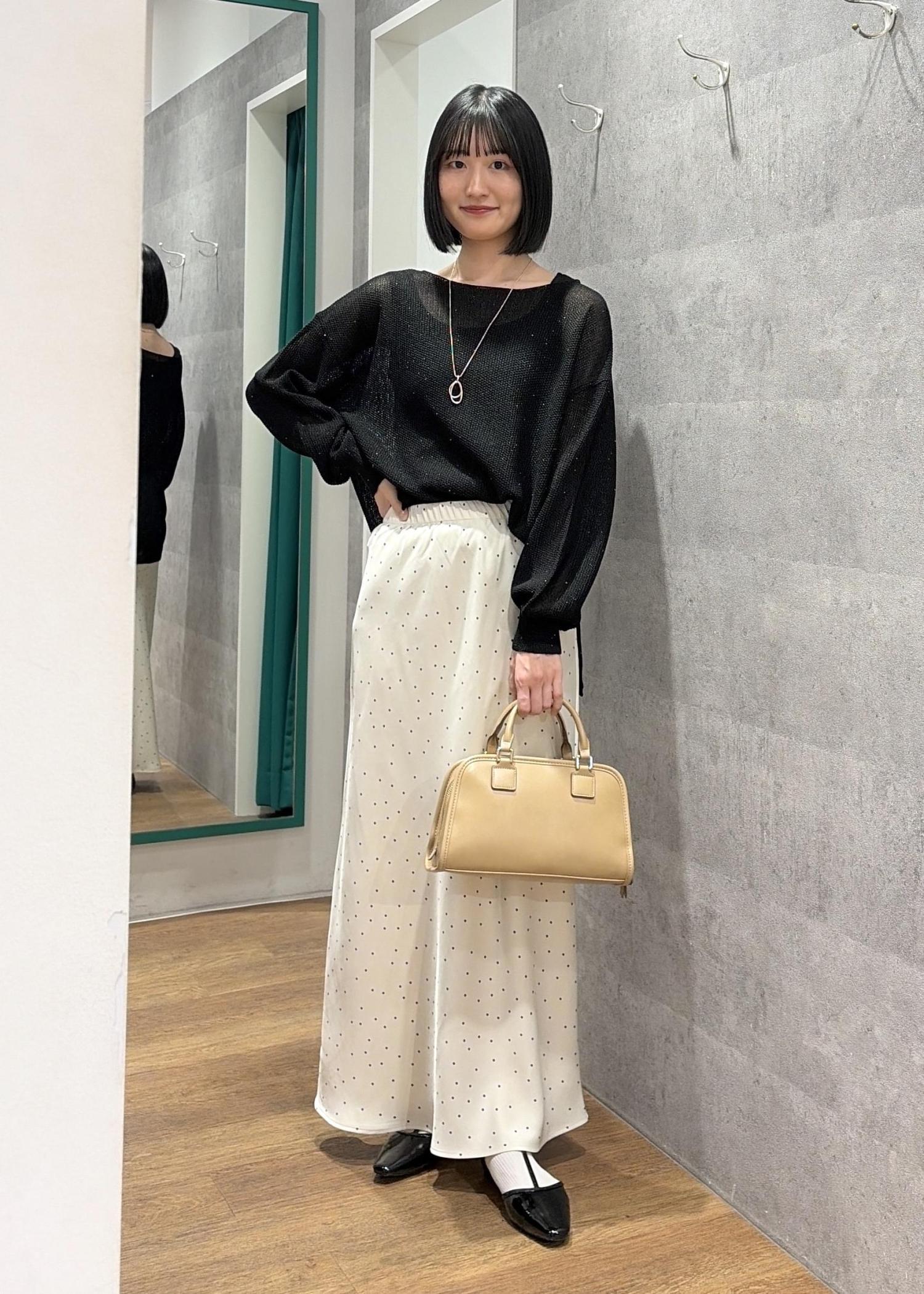 ワンピースにスカートのレイヤードは差し色使いにもおすすめです。シンプルながら品のあるデザインで、オケージョンシーンにもぴったりです。