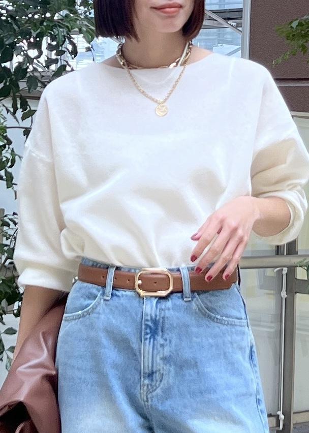 開き過ぎないボートネックでスッキリ感があり、身幅はゆとりがあるので締め付け感もなく着やすいです。 -