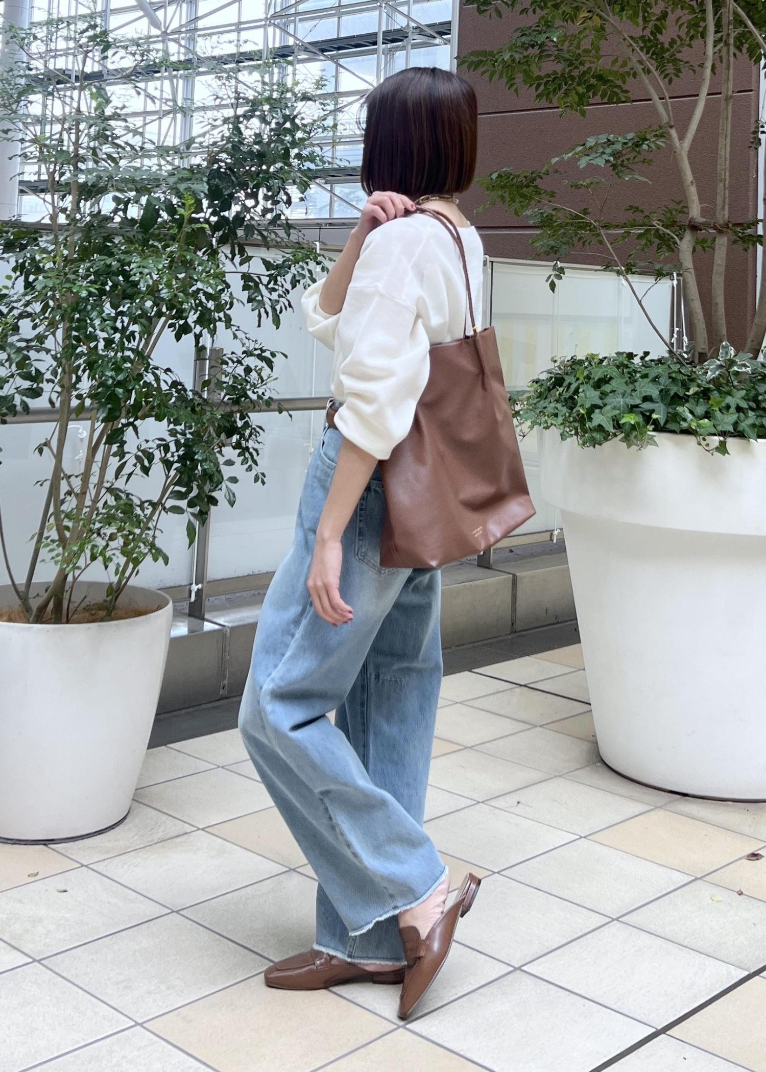締め色はブラウンで小物もカラーを統一すると、より大人っぽさのある春スタイルになります◎。